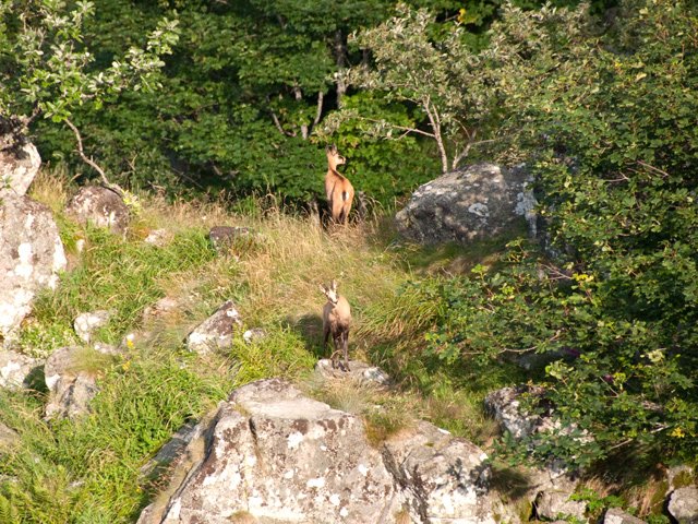 La randonnée débute près de Mittlach et Metzéral au pond sur la Grande Fecht où il est possible se stationner à plusieurs emplacements. Certains randonneurs plus pressés préfèrent rouler sur la piste et se rapprocher au plus près du lac de Fischboedle pour gagner près de 6 km. Quand la végétation a bien poussé, on est assuré de rayer un peu les côtés du véhicule. La piste entame une longue montée de près de 300 mètres pour se rapprocher du minuscule petit lac entouré de verdure en surplombant le ruisseau au nom imprononçable de Wormsabachrunz. L'effort est constant et tout à fait supportable. Les sapins ont bien souffert des pluies acides mais il reste encore beaucoup de verdure tout au long de cette journée. Après une halte au superbe petit lac, remonter d'une bonne centaine de mètres vers le lac de barrage du Schiessrothried par des lacets courts et pentus sous les sapins. Prendre à droite au premier embranchement et rejoindre le barrage qui permet de traverser la zone en direction du Petit Hohneck. Le lac est entouré de sapins et dominé par les premiers rochers du Hohneck qu'on devine à l'horizon (Photo 1). L'eau est claire et profonde mais très fraîche une grande partie de l'année (Photo 2). Les prairies d'altitude au-dessus des sapins donnent une idée de la pente qu'il reste à gravir (Photo 3). Puis une nouvelle montée en forte pente tout en lacets grimpe de 200 m vers les premières pentes du Petit Hohneck. La montée s'effectue principalement en forêt de sapins et de hêtres. A l'approche de Schiessroth, la forêt disparaît et la marche devient plus agréable en partant à gauche vers le Hohneck. On domine toute la région en profitant de magnifiques panoramas (Photo 5). On repère de loin les villages, le lac, les prairies sommitales et les zones vertes dégagées où il est déjà possible d'apercevoir les premiers chamois (Photo 6). Si les vaches, lorsqu'il y en a, sont faciles à voir, c'est différent pour les chamois qui cherchent la discrétion et se cachent sur les flancs parfois abrupts (Photo 7). Les jumelles peuvent s'avérer utiles, surtout s'ils ne bougent pas pour attirer le regard (Photo 8). Une bonne partie du "troupeau" se cache sur les flancs du Wormspel dans les zones les plus rocheuses (Photo 10). En s'approchant sans bruit, il est aisé de les surprendre, soit couchés à rêvasser soit sur des rochers en train de guetter (Photo 11). En général, ils ne bougent pas et ne s'enfuient qu'en cas de danger ou d'intrusion dans leur milieu (Photo 12). Il faut profiter des animaux si on les repère mais ne pas manquer pour autant les magnifiques paysages dominant le lac de Schiessrothried (Photo 13 et 14). La prairie très fleurie est parsemée de rochers parmi lesquels ils peuvent de cacher (Photo 15). Quand la pente est faible et que l'animal insouciant broute tranquillement, il est possible de l'approcher sans faire de bruit ou de mouvement hostile (Photo 16). Un sentier escarpé qu'on va bientôt emprunter descend vers le lac mais en cas de recherche infructueuse, on est certain de les apercevoir en se dirigeant vers les rochers du Spitzkoepfe. Pas de sentier dans cette zone rocheuse mais de multiples passages faciles pour l'homme à la condition de prendre garde à la chute (Photo 18). Les chamois préférant les rochers à la plaine, se repèrent très vite sur les corniches étroites (Photo 19). S'ils sont nombreux et qu'il y a des jeunes, c'est toujours un spectacle de les voir chercher à s'installer tous au même endroit quitte à se bousculer un peu. D'autres profitent des rayons du soleil pour sommeiller au calme (Photo 20). A la saison, laisser le regard errer dans les prairies pour y repérer ces magnifiques lys (Photo 21) ou les gentianes qui se remarquent de très loin à leur hauteur et à la couleur jaune soutenu de leurs fleurs (Photo 22). A la fin de la zone rocheuse, on rejoint facilement le sentier qui mène au lac en descendant hors sentier sur quelques centaines de mètres. Pour cela, il vaut mieux être déjà venu dans cette région ou avoir un bon sens de l'orientation. Le mieux est donc de remonter un peu et de prendre le sentier qui plonge vers le lac qu'on atteint en une heure. Une fois au barrage, ne pas partir vers la digue mais redescendre au sud pour récupérer le sentier pris à l'aller. D'autres sentiers ou pistes descendent en direction de Metzéral mais il vaut mieux emprunter la piste du matin.