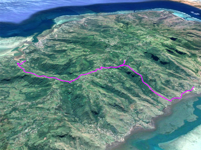 La randonnée débute sur la route, à la Baie aux Huitres, mais peut aussi commencer à Port Mathurin car elle est courte et peut être facilement rallongée. Partir vers l'ouest et prendre la première rue à gauche. Passer devant le stade et entamer la montée à travers les habitations puis récupérer le sentier remontant en bordure de rempart dans des zones défrichées accueillant parfois quelques bœufs au bout de leur longue corde. La Baie aux Huitres grandit assez vite car on se retrouve vite à 150 m d'altitude (Photo 2). Elle est impossible à confondre avec une autre baie de l'île en raison de son espace rectangulaire protégé du l'eau. On rejoint rapidement une piste qui évite la circulation et monte au Mont Tonnerre pour rejoindre plus tard la minuscule bourgade de Bigarade. Les panoramas sont nombreux en direction de tous les côtés de l'île (Photo 4). De là, on part vers l'Est en direction de Saint-Gabriel sur une route agréable bordée de prairies et de quelques habitations dispersées (Photo 7). A Petit Gabriel, prendre à droite et marcher jusqu'à la Cathédrale Saint-Gabriel dans son écrin de verdure (Photo 8). L'imposant édifice construit en pierre grise et corail comporte deux tours latérales (Photo 9). L'immense édifice, construit de 1936 à 1939 par le Père Eugène Legault et par la population, peut abriter une foule impressionnante de 2000 fidèles (Photo 10). Il a été construit au centre de l'île et se retrouve presque chaque jour plein à craquer dès les offices du matin. Reprendre le chemin inverse durant 500 m et bifurquer à gauche pour entreprendre la descente sur un sentier passant tout d'abord entre quelques habitations (Photo 12). Un écart, plus difficile à repérer permet de s'éloigner un peu et marcher dans une végétation touffue (Photo 13) puis de pénétrer en bordure de la vallée profonde assez boisée (Photo 14). Une fois de retour sur le sentier, la marche se poursuit vers le Sud parmi les moutons dans des prairies en pente douce donnant sur la mer sans suivre réellement un sentier. La végétation a presque totalement disparu de ces prairies d'altitude bordées des rochers constituant le bord du rempart (Photo 15). Ne pas déranger les moutons qui broutent tranquillement ou se reposent sans ombre (Photo 17). Les panoramas sur le lagon et l'Anse Raffin sont de plus en plus beaux, surtout quand le soleil fait ressortir le turquoise de l'eau (Photo 19). La marche s'effectue en hors sentier au milieu des prés (Photo 20). On aperçoit le village de Parc à Tortue qui grossit près du Lagon (Photo 21). De l'autre côté de la crête, c'est Port Sud-Est qui grandit à vue d'œil (Photo 22). On arrive à la route au Parc à Tortues et il ne restera plus qu'à effectuer le kilomètre qui sépare de Port-Sud-est en longeant le littoral vers la gauche. Les séchoirs à poulpes sont installés devant chaque maison de pêcheur (Photo 24). Après une longue plage, on termine près du stade bordant le collège. Le retour à port Mathurin est conseillé en bus pour au moins une fois voir comment on peut entasser plus de monde que dans nos rames de RER parisiennes le matin à l'embauche, enfants des écoles compris !