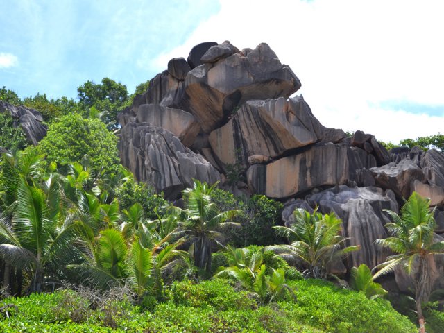 La petite île de La Digue compte parmi les endroits les plus photographiés surtout pour ses sublimes plages de sable blanc bordées de rochers de granite érodé. Tous les clichés y sont réunis, du lagon turquoise au cocotier qui penche sur la mer sans parler de certains couchers de soleil. Située à 15 minutes de bateau de Praslin, elle incite beaucoup plus à la baignade qu'à la randonnée. C'est d'ailleurs à bicyclette ou en camion que la plupart des touristes la parcourent sans grands efforts. Mais, en raison de la très petite taille de l'île, il est possible de la visiter à pied ce qui permet de mieux voir les beaux paysages et de pouvoir discuter en passant au plus près des cases. Le ferry arrive au port et la randonnée peut débuter dès la descente du bateau. On visitera tout d'abord les grands classiques en se rendant au Domaine de l'Union. On pourra y voir, entre autres, un pauvre bœuf qui tourne autour d'un broyeur à coco pour le plaisir du touriste, la case bien délabrée où a été tourné le film "Emmanuelle" ou la grandiose plage et pointe de la Source d'Argent. Tout le reste du parcours permettra de traverser par la route étroite des zones de culture, d'élevage, boisées ou en bordure de lagon. La route finit d'un côté à Grande Anse et de l'autre à l'Anse Fourmis ; un sentier rejoint ces deux extrémités. La partie Sud est assez facile mais celle à l'Est, menant de l'Anse Coco à l'Anse Fourmis est beaucoup plus sportive par moments.