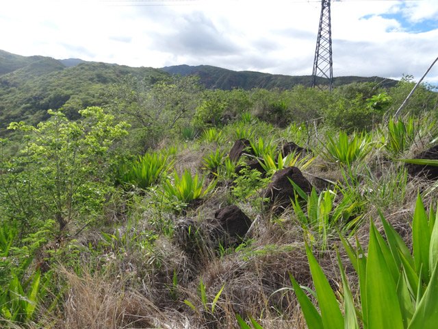 La randonnée débute à ce verger lontan appelé Rostonne et affiché un peu partout Rosthon (Photo 1). Cheminement à plat le long de la ravine, traversée de celle-ci, arrivée dans le verger ombragé sont déjà décrits dans la Randonnée familiale ou dans la Boucle un peu plus longue. Suivre la belle allée qui débute au panneau facile à trouver près du pont de la Grande Ravine des Lataniers à la fin de la Rue Evariste de Parny. Traverser à ravine au fond caillouteux et rejoindre les premiers manguiers qui envahissent le parc Rosthon (Photo 2). Prendre à droite et traverser le verger pour longer la Petite Ravine des Lataniers sur une piste herbeuse et agréable. Laisser à droite celle menant aux Lataniers (panneau) car elle a été défoncée après la construction de logements. Poursuivre jusqu'à la première piste à droite menant aux carrières. Traverser la totalité de l'ancien chantier (Photo 3), ne pas prendre la crête au pylône électrique mais bifurquer à gauche, suivre le bord du rempart artificiel et redescendre vers la Petite Ravine des Lataniers. Ne pas franchir le gué mais tourner à droite à un arbre aux branches écartées semblant donner la direction. Une forte pente très caillouteuse débute rapidement (Photo 4), suivie d'une autre encore plus forte (Photo 5) où il est très difficile de trouver de la terre entre les hautes marches constituées de roches. Après ces difficultés, on parvient à la crête à la rencontre du sentier venant des carrières. Prendre vers la gauche et poursuivre cette belle montée en pente douce qui rejoint plus haut les pylônes de la ligne haute tension. De beaux rochers à travers les tamarins décorent la crête. On retrouve à gauche le croisement du sentier de la boucle venant de la Petite Ravine. Poursuivre tout droit. Moins utilisé que les précédents, il devient plus étroit, plus herbeux et se rapproche de la vallée de la Grande Ravine des Lataniers (Photo 6). Les paysages sont très agréables, tant sur les pitons que vers la mer malgré le caractère très industrialisé du Port. Un sentier part sur la droite en direction du village qu'on aperçoit au fond de la vallée (Photo 7). Les randonneurs tentés par la descente se retrouveront assez vite devant une cabane rustique (Photo 8) en employant un sentier assez facile malgré la descente caillouteuse et les racines (Photo 9). Inutile de chercher à poursuivre sans danger car ce sentier engorgé ne sert plus et impose un demi-tour vers la crête. A partir du précédent croisement, c'est de l'aventure sans l'être vraiment car on ne perd jamais la trace de quelques chasseurs de guêpes passant toujours au même endroit (Photo 11). Suivre ce sentier sans jamais réfléchir car la crête ne dépasse pas les 10 mètres de largeur et on chemine toujours au sommet, bénéficiant ainsi de quelques vues sur la vallée de la Grande Ravine des Lataniers (Photo 12). La végétation est surtout composée de grandes herbes, d'arbustes rachitiques ou de chocas traversés par l'étroit sentier (Photo 13). Le sentier reste cependant visible dans ces zones plus touffues qui dominent la crête (Photo 14). Il frôle quelques roches plus grosses que les autres pour de nouvelles vues du la vallée (Photo 15) et se poursuit toujours sans difficulté (Photo 16). Il ne faut commencer à se poser des questions qu'à partir d'un gros manguier cancéreux couvert de fougères (Photo 18). Partir vers la gauche, écraser quelques fougères qui envahissent vite la trace et se retrouver dans un bois de goyaviers où les chocas ont presque envahi tout le sol (Photo 19). C'est la seule difficulté de la boucle de 10 km car il faut traverser une centaine de mètres, presque à plat, dans la végétation touffue. Suivre pour plus de sérénité les traces de coupe-coupe données aux chocas barrant le passage. On se retrouve ainsi sur un beau sentier dans le bois de filaos aperçu depuis le début de la crête (Photo 21). Ne prendre à droite sous aucun prétexte et bifurquer à gauche sur les aiguilles de filaos (Photo 20). Descendre vers la ravine, passer une rudimentaire barrière de branches posée là par la personne vivant plus haut, franchir le gué et poursuivre sur le sentier jusqu'à une ancienne piste bordée de fougères (Photo 23). A partir de ce point, c'en est fini de toutes les difficultés car il suffit de suivre les pistes étroites car envahies (Photo 24), larges avec beaux point de vue sur la Port (Photo 25), petites routes proches de propriétés agricoles ou maraîchères (Photo 26), route principale de la RD 41 (Photo 27) ou les raccourcis entre ses lacets bordés de superbes villas entourées de non moins jolis jardins. On parvient, après une douzaine de lacets en descente, à l'aire de loisirs de la Corniche. A partir de ce point dominant la vallée, plusieurs manières de rejoindre le point de départ sont possibles (voir les deux autres randonnées). L'itinéraire proposé descend par les citernes rouillées, la piste longeant la Petite Ravine, le gué (Photo 28) et le trajet pris à l'aller mais bien d'autres solutions sont possibles pour raccourcir ou rallonger ce retour au parking.