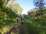 Retour à une randonnée ordinaire. Une fois revenu sur la route, reprendre la direction du sentier de découverte de la Tamarinaie. Suivre la route ou emprunter le magnifique sentier dans les fougères à quelques mètres de la route (Photo 16). Les tamarins sont de taille respectable mais on rencontre assez peu de gros spécimens comme à la Ravine Blanche par exemple (Photo 17). Avant de reprendre la route, saluer un des mastodontes au sol qui continue à vivre comme beaucoup de ses congénères n'ayant pas supporté certains cyclones (Photo 19). On foulera peu de béton avant de retrouver le Pare-feu Chemin de Bout (Photo 20). Quelques mètres après le panneau annonçant ce pare-feu, trouver le sentier remontant le talus vers une nouvelle forêt de tamarins envahie de hautes fougères (Photo 21). Les 100 premiers mètres s'effectuent dans ces fougères qui ne bouchent jamais le sentier. Quelques passages s'effectuent sur des racines mais le sentier est en général en très bon état malgré son étroitesse (Photo 22). A l'approche de la piste des 1800, le sol est encore creusé par les passages des VTT à l'époque où le circuit était utilisé plus souvent (Photo 23). Plus haut, ce sont les branles verts qui ont envahi le sol basaltique (Photo 24). Les derniers mètres s'effectuent dans les ajoncs sur une courte distance. On parvient à la piste des 1800 entre deux radiers en béton. Prendre à gauche et marcher une centaine de mètres jusqu'au début de la Piste Bolon, bien indiquée par un grand panneau. Elle débute presque à plat sur un sol rocailleux (Photo 25). Elle est constamment bordée de hauts tamarins et de nombreux bringeliers ayant envahi les fossés latéraux. L'herbe remplace les cailloux et la marche s'effectue sur un véritable tapis amortisseur (Photo 26). Les longs lacets dans la forêt lui permettent de rester en pente faible. Les fougères ont remplacé les bringeliers mais l'herbe demeure pour la balade de fin (Photo 27). Après un dernier virage au milieu de cette belle forêt, la piste se termine à la Route Forestière des Tamarins, juste en face du point de départ (Photo 28).