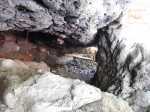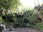 Un cassé de la montée qui ne paye pas de mine est pourtant plus délicat à franchir que les autres de la sortie. La hauteur est faible mais la chute de moins de deux mètres est constituée de basalte lisse qui laisse peu de prise aux mains et aux semelles. Repérer sur la droite en montant un tronc de bois maigre apporté par les eaux (attention, il disparaîtra au prochain cyclone). Se rapprocher de ce tronc puis de la falaise derrière lui et repérer une racine qui dépasse. Elle servira à mettre les mains et ainsi poursuivre vers l'amont par un passage un peu vertigineux, étroit et très vertical mais peu dangereux si on prend bien soin de maintenir fermement le tronc. Ne pas chercher à monter ailleurs car la falaise est verticale et assez longue. On marche moins de 10 mètres sous les arbres assez espacés pour ne pas gêner.