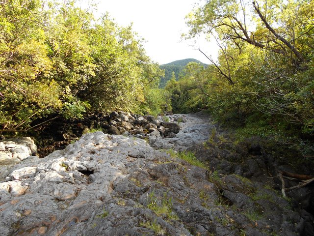 La randonnée débute dans le village de Bois Blanc qui dispose de très peu de places de stationnement. Une aire de repos avec un kiosque et une table est située en rive gauche de la Ravine de Bois Blanc près du pont. Laisser le véhicule sur le terrain herbeux et marcher en direction de la Route Forestière qui pénètre dans l'espace naturel sensible de Bois Blanc. Cette route étroite, déjà utilisée pour le tour de la Forêt de Bois Blanc ou le tour du Piton Indivis est toujours aussi agréable (Photo 1). Sans chercher, on peut pourtant l'éviter en utilisant les nombreux raccourcis qui coupent les lacets en passant au plus près des grands nattes (Photo 2) ou autres bois de couleurs plantés dans l'aire. Plus haut, la piste devient herbeuse et ombragée (Photo 3). Repérer au passage le sentier d'interprétation qu'on utilisera au retour puis poursuivre jusqu'à un croisement de pistes. Celle de droite, moins bien entretenue (Photo 4) s'enfonce dans la végétation touffue et effectue une boucle agréable qui se poursuit par un sentier large et en bon état (Photo 5), traverse des zones recouvertes de fougères et d'orchidées bambou (Photo 6) avant de rejoindre la piste laissée récemment par un étroit sentier. Bifurquer à droite à la petite clairière et poursuivre sur la RF 18 de Bois Blanc qui est régulièrement coupée à chaque passage de ravine par des fossés bétonnés recouverts de grosses grilles rouillées. On passe ainsi la Ravine Ferdinand puis une demi-douzaine d'autres ravines plus ou moins importantes avant d'arriver au gué de la Ravine de Bois Blanc. La piste se poursuit en direction de la Ravine de la Mare. Prendre à droite et débuter la remontée de la ravine au fond recouvert de larges plaques basaltiques grises (Photo 7). Contrairement à d'autres ravines, le manque de végétation lui a conservé sont aspect gris alors que les autres, moussues, sont souvent vertes et glissantes. La marche est facile car on peut très souvent éviter le fond et ses galets. Les cassés, dont certains très profonds, se succèdent à un rythme régulier. Chaque fois, un accès facile, une rampe ou des roches sur les côtés permettent de franchir l'obstacle sans danger. Un seul cassé, presque le plus petit d'entre eux, est délicat à escalader (voir § ci-dessous) et nécessite de passer dans les sous-bois de la rive gauche. On contourne ainsi tranquillement le Piton Nelson en prenant toujours à gauche à chaque confluent. Un gros éboulis nettement visible sur les photos satellites (Photo 15) montre l'impressionnante épaisseur de scories séculaires qui sont parties avec la végétation qui les recouvraient. L'éboulis a laissé de beaux vestiges gris et colorés de tons chauds, ocres ou jaunes (Photo 16). La montée se poursuit, toujours entrecoupée de cassés jusqu'à arriver à un plus vertical que les autres (Photo 19) où, même en cherchant bien, aucune marche, aucune aspérité ou aucun moyen ne permet de passer sans lancer une corde. Il est donc temps de faire demi-tour pour les uns ou de poursuivre pour certains autres qui aiment un peu fouiner et n'abandonnent pas au premier obstacle. Pour cela, longer cette falaise verticale en prenant le fond des confluents de plusieurs ravines qui se réunissent dans ce canyon. La vallée devient plus étroite jusqu'à une haute cascade en pente oblique assez facile à monter mais plus délicate à redescendre. Au-dessus, la ravine se rétrécit encore, devient moussue, s'envahit de sabres et fougères (Photo 20). Entreprendre la descente jusqu'à la Piste Forestière 18. En fonction de la fatigue il est possible de prendre à droite vers la Ravine de la Mare ou du Piton Indivis ou, comme ici, à gauche sur l'itinéraire emprunté en montée. Après avoir passé les grilles métalliques, traversé un véritable tunnel de jamrosats et descendu un peu la piste herbeuse, emprunter sur la droite le sentier d'interprétation qui longe une murette (Photo 24) en proposant des pancartes botaniques vieillissantes. Poursuivre sur le sentier de découverte de la coulée de 1977, traverser la Ravine Constantin puis la Ravine de Bois Blanc laissée plus haut. Après la ravine, on se retrouve très vite dans les cultures et vergers longeant la piste de l'Indivis (Photo 25) qui se termine à la route. Prendre à gauche vers la pont et la fin de la boucle. Juste avant d'arriver, une pancarte portant le nom de Sentier Macoral attire le regard (Photo 26). Il n'en faut pas plus à un randonneur pour aller y voir de plus près. Cet étroit passage, testé pour l'occasion, longe les cases où on est accueilli par de nombreux chiens bruyants. A la fin, il plonge discrètement vers la ravine de Bois Blanc mais il est difficile de trouver une échappatoire de l'autre côté. Profiter de cet écart pour monter au barrage détruit en amont avant de retrouver le parking de l'aire de repos en remontant en aval à quelques mètres du pont.