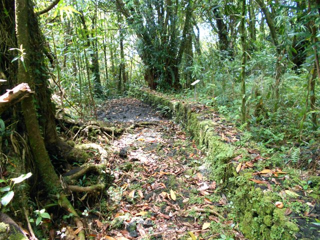 La randonnée débute à la petite aire de pique-nique implantée au cœur du village près du pont sur la Ravine de Bois Blanc. La piste commence à quelques mètres de là en marchant vers Sainte-Rose et en bifurquant sur la gauche. Elle est accessible sur autorisation et serait sinon très fréquentée en raison de la beauté du lieu. Une barrière, le plus souvent levée marque le début de l'espace naturel kilomètres (Photo 1). La montée est faible et régulière sur deux kilomètres sous les grands nattes et quelques autres essences (Photo 2) . Quelques raccourcis sont laissés aux plus sportifs car la pente qui relie les lacets de la route sont en pente assez forte. L'endroit est bien entretenu, la route propre, la pente faible et de larges clairières rendent le lieu reposant kilomètres (Photo 3). La route se transforme en piste herbeuse avant la fin de la montée (Photo 4). Elle se rapproche très près du rempart et de la petite ravine qui le longe. Certaines zones non boisées sont couvertes de fougères parmi lesquelles poussent de hautes orchidées bambous kilomètres (Photo 5). Après les derniers lacets courts, on remarque sur la gauche un panneau délabré souhaitant la bienvenue aux marcheurs (Photo 6). Le sentier pénètre aussitôt en sous-bois et longe une petite murette construite à l'époque avec goût mais depuis recouverte de fougères et de mousse (Photo 7). Les parties plates du sentier retiennent l'eau et le rendent boueux par endroits kilomètres (Photo 8). Des vestiges de cette murette sont en meilleur état par moments kilomètres (Photo 9). La parcours traverse quelques clairières où pourrissent tranquillement des racines kilomètres (Photo 10). Des pancartes moussues et de plus en plus difficiles à lire sont plantées près de certaines variétés de plantes kilomètres (Photo 11). Le sentier, étroit et parfois un peu boueux passe au plus près de cette murette avant d'arriver à une clairière ou des flèches dirigent vers une petite plantation de cacaoyers. Le sentier semble s'arrêter là mais on le retrouve sans difficulté si on retourne à la murette avant d'entamer une légère descente. Sur la droite, un autre panneau, tout aussi délabré que le premier, souhaite cette fois la bienvenue aux marcheurs sur la coulée de 1977 (Photo 12). De cette coulée, il ne reste rien de visible dans les bois de goyaviers qui l'ont recouverte kilomètres (Photo 13). Les fougères semblent se plaire beaucoup si on en juge par la longueur de leurs frondes mais elles en gênent pas la progression kilomètres (Photo 15). On longe la Ravine Ferdinand qu'on devine à travers la végétation puis on la coupe un peu plus loin par un gué à sec (Photo 17). Difficile de trouver des traces nettes de la coulée en raison de l'envahissement du sentier par de nombreuses racines (Photo 18). Si elle comporte de belles portions plus en hauteur, elle ne mérite pas ici qu'on tente une exploration. La forêt devient un peu moins touffue (Photo 19). La Ravine de Bois Blanc est plus imposante avec son large lit basaltique entrecoupé de cassés dangereux si on s'approche de trop près (Photo 20). Contrairement à la précédente, il est possible, par temps sec d'en remonter une partie pour donner un petit goût d'aventure à cette boucle banale kilomètres (Photo 21). On parvient en quelques minutes aux premières cultures, vergers et cocoteraies kilomètres (Photo 22). Il suffit alors de bifurquer sur la gauche pour suivre le Chemin Indivis à travers les cultures. Le cheminement sur l'herbe puis sur le béton est très facile et on rejoint la route nationale sans aucune difficulté après avoir longé quelques habitations kilomètres (Photo 25). Le véhicule est à environ 500 mètres en longeant la route où il faut tout de même prendre garde à la circulation.