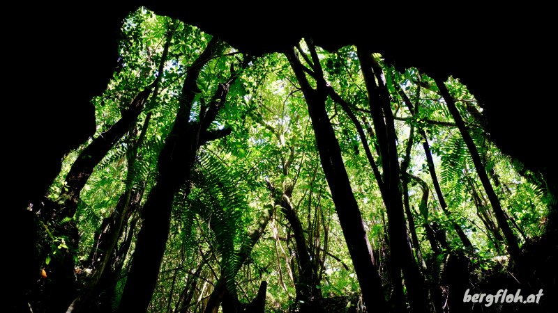 La randonnée débute à une vingtaine de mètres de la petite route menant au Puits Arabe. Des bananiers et des bambous proches d'un poteau télégraphique abritent le départ du sentier (Photo 1). Le panneau d'interdiction concerne les parcelles longeant le sentier mais pas le passage suivant au plus près la limite domaniale. Bien qu'un peu encombré d'herbe, de tabac marron et de fougères, il est facile à suivre et très visible (Photo 2). Les goyaviers, comme partout, font très vite leur apparition en bordure du sentier qui devient caillouteux et peut comporter de hautes marches glissantes (Photo 3). Ailleurs, ce sont les racines qu'on retrouve en travers du passage mais sans rajouter de difficulté (Photo 4). Attention à quelques trouées dans les petits tunnels de lave qui bordent le passage car une chute pourrait faire mal à la jambe (Photo 5). S'il n'y avait pas autant de goyaviers, les sous-bois seraient agréables dans cette forêt humide de basse altitude (Photo 6). La pente est très faible jusqu'à la ravine (Photo 7). Les gros arbres sont rares et se remarquent de loin (Photo 8). On trouve même quelques bois de couleurs difficilement identifiables en raison des fougères poussant sur leurs troncs (Photo 10). De beaux palmiers, (sans doute Livistona saribus), aux longues tiges terminées par de grands éventails poussent ça et là en sous-bois (Photo 11). Quelques affouches aux racines étrangleuses bordent le sentier par endroits (Photo 12). Le sentier rencontre la petite ravine à quelques mètres d'une arche surmontant un bassin à sec (Photo 13). Le champ de canne à sucre n'est jamais loin ainsi que quelques bananiers envahis de lianes (Photo 14). Le sentier est toujours correct en raison des passages réguliers du propriétaire des cultures de vanille empêchant la végétation d'envahir. On chemine de plus en plus près de la ravine quand on ne l'emprunte pas carrément (Photo 15). Plus haut, après un passage sur des cailloux moussus (Photo 16), on est obligé d'emprunter le fond (Photo 17). On ne le quittera qu'exceptionnellement jusqu'à la bouche du tunnel de lave. Il y a rarement de l'eau dans cette rigole même si on y repère des petits bassins créés lors des dernières pluies (Photo 18). Le fond de la ravine est moussu et peut être glissant après les pluies. La pente étant assez faible le risque n'est pas bien grand. La végétation est assez dense par endroits, créant un vrai tunnel végétal (Photo 19). Après 1000 m et moins de 30 minutes de montée régulière, on parvient à un tronçon de la ravine plus encombré qu'ailleurs. Prendre alors à droite et suivre les traces de nombreux passages sur les racines recouvrant le sentier avant d'arriver à quelques roches qu'il faut escalader. On a devant soi une espèce de petite ravine qui est le résultat de l'effondrement de la voute du tunnel. Ne pas tenter de pénétrer dans la petite grotte aperçue à gauche à la descente de moins de 2 m. Partir sur la droite sur une quinzaine de mètres. L'entrée de la grotte est là, impossible à manquer même si quelques troncs de goyaviers tentent de la boucher (Photo 20). L'accès est facile et le plafond assez haut (Photo 21). Le sol, rougi par les oxydes de fer, débute à même l'entrée (Photo 22). Pénétrer de quelques mètres pour mieux apprécier la taille du tunnel et allumer les lampes. La visite est impossible sans lumière et il est préférable d'être casqué. Le boyau est court, beaucoup plus sec que certains autres, et ne comporte qu'un embranchement. Le sol est une pure merveille de couleurs chaudes (Photo 23). Plus loin, un rai de lumière indique un puits de sortie mais la cavité devient de plus en plus étroite, à laisser aux spéléologues (Photo 26). Le retour s'effectue par le même itinéraire.