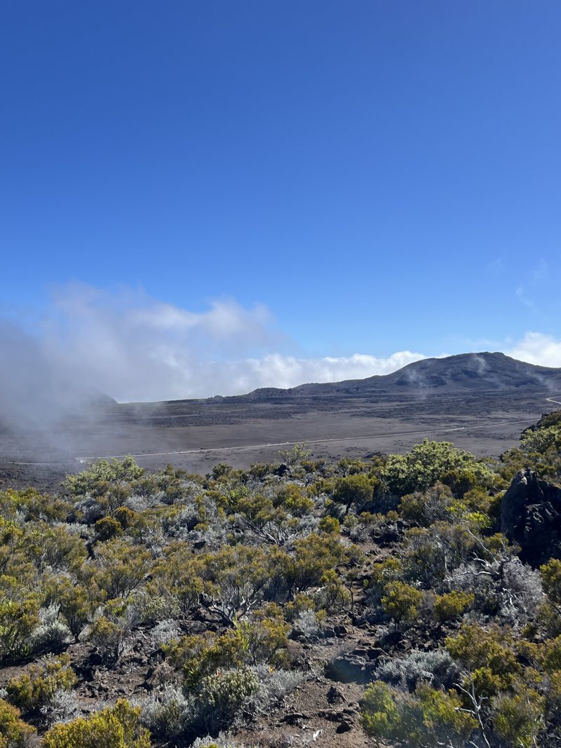 La randonnée débute au Pas des Sables où un parking attend les visiteurs qui s'empressent de monter au petit belvédère afin de photographier la Plaine des Sables sous toutes ses coutures. Ne pas hésiter à s'y rendre, mieux, emprunter sur moins de 100 m le sentier de l'Oratoire Ste-Thérèse pour une vue d'ensemble beaucoup plus profonde. Partir calmement sur les plaques de lave puis sur le sentier de bord qui chemine, tantôt sur des petits lapillis glissants ou sur des cailloux de lave (Photo 1). Certains arbres morts créent déjà de belles natures mortes (Photo 2). On domine la Plaine des Sables pour une bonne heure et on se régale déjà de la vue du Chisny qui cache à peine le Piton de la Fournaise (Photo 3). Le sentier ne s'éloigne jamais de plus de 30 mètres du bord. Dans l'ensemble, les obstacles et les hautes marches sont rares et la randonnée est agréable, surtout que la pente est insignifiante. La végétation est la plus haute de toute celle qu'on traversera au long de la matinée. Elle est constituée presque exclusivement de branles, petits tamarins des hauts, ambavilles et fleurs jaunes (Photo 4). Au pied du morne, commence le grand cassé minéral créé par une coulée spectaculaire qui s'est figée jusqu'à la prochaine éruption (Photo 5). En cherchant bien, on devine le sentier qui redescend vers Grand Pays et Grand Galet. Ne pas manquer l'arche naturelle et la première grotte à gauche du sentier avant d'arriver à la grande grotte, marquée sur la carte d'un point noir, pouvant abriter plusieurs personnes (Photo 7). Plus loin, le sentier commence à descendre en direction des antennes qu'on aperçoit au loin. Au point de vue, les paysages sont impressionnants vers Grand Pays, Grand Coude, Grand Galet et la côte (Photo 9). La première partie, la plus facile est terminée.