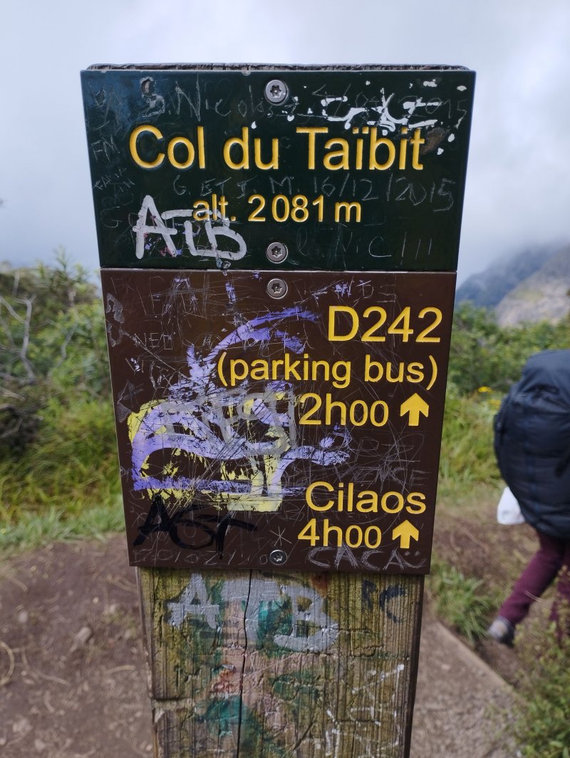 Il n'y a qu'une véritable difficulté pour cette première étape lors du franchissement du Col du Taïbit. Le début est une longue balade le long de la courbe de niveau avant une forte descente vers le Bras Rouge. Comme les muscles n'ont souffert que de cette descente, il suffit de prendre son temps pour remonter les 1080 mètres en continu jusqu'aux premiers points de vue sur le Cirque de Mafate. La descente vers Marla est étroite et caillouteuse mais la traversée de ce grand îlet est toujours aussi agréable. En fonction de l'heure, il est parfois difficile de trouver un endroit où se désaltérer ou boire un café. Plusieurs sentiers mènent à la Nouvelle mais l'objectif est ici de suivre continuellement le GRR1. Il est pourtant tentant de poursuivre à droite à partir du croisement vers l'Îlet Gravina car le sentier est plus plat et en meilleur état que le GRR1. Ce dernier est de bien plus mauvaise qualité que les autres sentiers rencontrés et il y a fort à parier que le GR disparaîtra progressivement faute de passages fréquents. La Nouvelle s'atteint par quelques montées un peu raides avant de se reposer.
