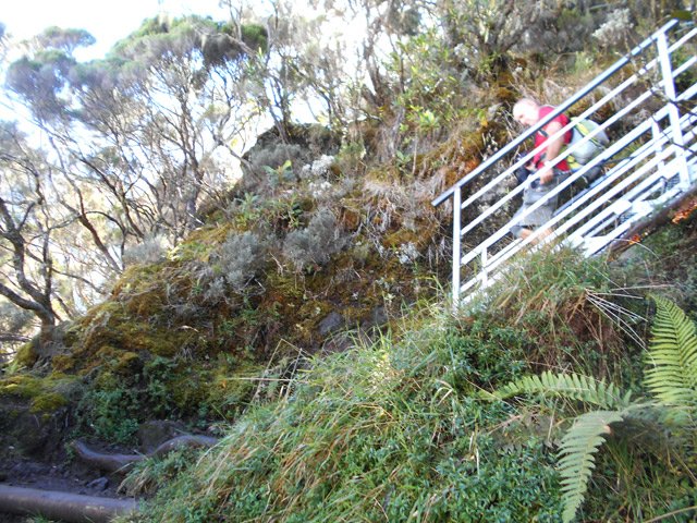 La randonnée débute à Hell Bourg à la mairie du village. Avant de partir, profiter du petit bassin entouré de fleurs et surmonté de la statue dénudée du monument aux Morts, l'Ame de la France, troisième exemplaire de l’œuvre ; la deuxième ayant été détruite à la dynamite par la curé du village, choqué sans doute d'autant d'impudeur dans ce lieu si reculé de la civilisation. En haut de la rue, la montée débute tranquillement près des cases, entre filaos et bambous sur des marches et sentiers bétonnés jusqu'à une zone de repos. Traverser la route et poursuivre sous les filaos et les chouchous en montée faible. Les marches bétonnées disparaissent et sont remplacées par de la pierre. Plus on monte et plus les panoramas s'agrandissent sur le cirque, les villages et le Piton d'Anchain (Photo 1). Le sentier, bordé de courts bambous, est très souvent façonné par l'homme. Il comporte des murettes, des câbles de sécurité et des marches régulières et bien sûr de fortes pentes qui amènent rapidement vers le gîte. Une bonne partie de la montée est constituée de longues portions bétonnées très faciles à grimper. Les lacets sont nombreux (Photo 2) avant d'arriver aux vestiges du téléphérique et de sa Vierge qui veille, dans le brouillard le plus souvent. Une dernière forte pente rejoint les filaos et la rambarde du gîte près du belvédère qu'on peut délaisser pour une fois tant les panoramas seront nombreux par la suite. Pourtant, une visite au petit musée du téléphérique ne prend que quelques minutes. Traverser les installations d'hébergement pour rejoindre la piste qui débute près du circuit pour personnes à mobilité réduite. Cette portion sur piste sera la seule agréable de la journée car la piste est presque plate et bordée de fougères et bois de couleurs (Photo 3). Après une boucle vers la droite, la piste se termine au pylône et installations près d'un nouveau belvédère pour voir arriver le soleil sur le cirque. Sans aucune transition le parcours se poursuit par un sentier qui pénètre immédiatement dans la boue et les racines (Photo 4). L'étroitesse surprend après la piste mais le sentier s'élargit par la suite. Si le sentier donne déjà des inquiétudes, la forêt, en revanche, est de toute beauté. On longe des fougères, sabres, de gros troncs de tamarins souvent tortueux dans les branches desquels les rayons du soleil matinal créent de magnifiques couleurs. Les marches sont très hautes et les premières courtes descentes débutent pour franchir les multiples ravines de la matinée (Photo 5). Ces obstacles ne sont jamais compliqués mais ils rajoutent du dénivelé à celui, très impressionnant de la journée. Après une montée constante dans cet univers de racines et cailloux entrecoupés de boue, on s'approche du bord pour bénéficier de larges panoramas sur le cirque. De petites sentes sont été créées de toutes parts pour éviter les larges flaques de boue et en ne marchant pas trop vite, on peut très bien terminer la montée sans remplir les chaussures de boue nauséabonde (Photo 8). Plus haut, la végétation est petit à petit remplacée par des branles couverts de barbes de Jupiter. Les cailloux et la boue ne diminuent pas mais des planchers permettent par moments de marcher plus sereinement (Photo 9). D'un seul coup, le sentier devient un long escalier refait à neuf en 2016. Espérons que les travaux se poursuivront jusqu'au gîte ! L'enfer ne devient pas le paradis mais la montée est enfin agréable sur ces marches en bois. Une forte descente amène au Bras de Caverne suivie d'une très forte montée. A la fin des marches, on se retrouve sur un plateau pour des points de vue grandioses sur la Forêt de Terre Plate, le Cimendef et les autres grands sommets du cirque (Photo 14). Des planchers recouverts de grillage sont de plus en plus nombreux et très utiles pour la boue et les zones marécageuses. Une clairière, un peu plus loin, permet des belles vues sur le Cap Anglais et le Gros Morne et montre hélas le reste à parcourir pour parvenir au gîte (Photo 12). La montée reprend jusqu'à une descente scabreuse vers le croisement du sentier descendant à Hell Bourg par Terre Plate. Reprendre la montée après un coup d’œil à la croix et à l'autel qui domine le cirque puis plus loin à la Caverne Mussard (Photo 13). A partir de la caverne, la description est aisée : végétation qui diminue graduellement, pente souvent forte, marches hautes et des millions de cailloux qu'il faut toujours surveiller du regard (Photo 17). Lever tout de même les yeux vers le chemin parcouru vers Bélouve (Photo 16) ou à gauche vers la Fournaise et la Plaine des Cafres. On aperçoit enfin le gîte au loin et, comme il est à hauteur d’œil, on se dit que c'est enfin terminé. Hélas, c'est sans compter sur les trois ravines qu'il faudra franchir par des descentes d'une vingtaine de mètres avant d'arriver enfin aux bâtiments (Photo 18). La jonction avec le col est facile et la descente peut enfin commencer. Profiter des panoramas sur Cilaos (Photo 19) et débuter sur le sentier par les premiers lacets. La descente est également facile à décrire : Pendant deux heures, emprunter des dizaines de lacets avec des marches hautes en bois (Photo 21) ou plus rarement en planche sur des pentes très fortes. Peu de panoramas (Photo 22), encore moins de zones plates. Une seule portion permet une halte au kiosque près de la source au Plateau du Petit Matarum après avoir franchi la Ravine des Prunes (Photo 24). On arrive en deux heures au Bloc, les genoux en feu. L'arrêt de bus près du parking est tentant après cette journée difficile mais le GRR1 n'est pas totalement terminé. Prendre à droite la route vers Cilaos et marcher sur cette courte portion de route qui passe près d'une zone de pique-nique et du pont sur le Bras de Benjoin. Plus loin, la route de la Roche Merveilleuse débute sur la droite ainsi