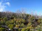 La randonnée débute au classique parking du Maïdo encombré de voitures du matin très tôt jusqu'au soir dès que la météo est clémente. Parcourir le belvédère de 200 mètres prend moins d'un quart d'heure et donne l'occasion de profiter des premiers rayons de soleil vers le Gros Morne et le Grand Bénare (Photo 1) ou vers les Orangers et la Roche Ecrite (Photo 2). Le spectacle est toujours aussi beau et impressionnant même au dixième passage. Rejoindre ensuite le parking et trouver facilement la piste bétonnée (Photo 3) indiquée par un panneau marqué de sigles abscons (Piste DFCI de l'OPAR qui se traduit par Piste de Défense des Forêts Contre l'Incendie de l'Observatoire de Physique de l'Atmosphère de la Réunion). En effet, le sentier qui reliait le Maïdo est devenu une longue piste pouvant être utilisée à tout moment par les camions des pompiers. C'est dommage pour les amateurs de sentiers classiques mais c'est très pratique dès qu'un inconscient est responsable d'incendies sur des hectares de plantes endémiques rares. Sur les 5500 mètres de piste, il n'y a jamais à se poser de question sur l'itinéraire. Marcher tranquillement en profitant des points de vue sur la mer (Photo 5) ou en devinant le nom des plantes rencontrées (Photo 13). On voit de loin le mirador de gué contre les incendies (Photo 4) et on le rejoint très vite après une route le plus souvent en descente(Photo 6). Les bâtiments de l'observatoire ont été bâtis pour s'intégrer au mieux dans le paysage des hauteurs de l'Ouest (Photo 7). Les vestiges des incendies passés sont fréquents mais diminuent, heureusement. Les graines de tamarins aiment bien un coup de chaud pour germer mais hélas, les ajoncs d'Europe ont parfois pris la place quand les premières feuilles veulent sortir. La piste se déroule doucement en direction du Piton de la Glacière qui sert de repère (Photo 12). Le sol devient plus caillouteux et le restera jusqu'à la Glacière (Photo 14). A l'approche du Piton de la Glacière, on devine au loin les marques blanches du sentier vers le Grand Bénare. Quelques panneaux vieillissants et illisibles marquent l'emplacement de la caverne recouverte d'une haute couche de basalte gardant au frais l'endroit (Photo 19) qui comporte souvent un bassin et une petite cascade en fonction de la saison. Les cavités qui conservent des traces de maçonnerie s'observent par les trous (Photo 20) protégés de chaînes. Lire les explications encore déchiffrables près des ouvertures et reprendre le chemin de retour en effectuant ou non un petit détour vers le Piton de la Glacière. Rien d'insurmontable que l'escalade de ce monticule (Photo 22) qui comporte à son pied une muraille arrondie qui pourrait accepter une tente de 2 personnes (Photo 24). Le retour s'effectuant principalement en descente, on a parfois sous les yeux plusieurs kilomètres de piste caillouteuse pour imaginer le trajet qui sera plus facile qu'à l'aller (Photo 25).