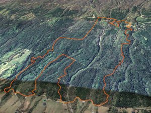 La randonnée débute à la pancarte indiquant la Piste Calebasse (Photo 1), du nom du quartier et de la ravine à sec qu'on longera bientôt. La pente est faible et régulière sous les vieux cryptomerias jaunissants (Photo 3). Certaines parties sont terreuses, d'autres herbeuses. Les fougères, bringeliers et acacias noirs envahissent doucement les sous-bois éclairés (Photo 2). Rien n'arrive à pousser dans les sous-bois sombres car les branchettes tombées rajoutent de l'acidité au sol où seules les mousses et longoses arrivent à s'installer. On coupe deux lignes domaniales qui se terminent à des à-pics insondables. Si on poursuit sur la Piste Calebasse, elle se termine sans avertissement. Un sentier part vers la droite ; un autre tout droit. Partir sur ce dernier sans hésitation au départ puis en cherchant des yeux les traces de pas un peu plus loin. On passe au plus près du crâne de Marguerite (Photo 4) qu'on a sans doute cherché longuement le jour de sa disparition. Il ne faut pas marcher trop vite et surveiller son GPS car d'autres sentes débutent et ne finissent pas toujours. Les branchettes de cryptomérias poussées sur le côté (Photo 5) sont une indication quand le sentier n'est pas trop repérable. Ailleurs, la marche arrive même à être rapide (Photo 6). Pour ne pas s'égarer, marcher en rive gauche du Bras Calebasse et ne pas le perdre de vue. Ce sentier discret se termine à une ligne domaniale. Comme le franchissement vers la gauche est impossible pour rejoindre la piste de Montvert, prendre à droite et franchir des ravines discrètes durant 500 mètres en direction de la ligne électrique qu'on voit au loin. Quand on se retourne pour voir le chemin accompli, on remarque que les bringeliers envahissent presque toute la surface de la ligne (Photo 7). La Ligne de la Grande Ravine est une autoroute comparée à ce qui vient de se faire (Photo 8). La montée est également constante et jamais forte. On devine bientôt les barrières du côté du gîte (Photo 10) qui demande un détour d'une centaine de mètres pour voir ses portes toujours fermées (Photo 11). Emprunter la route bétonnée, refaite à neuf récemment, pour une courte pause à plat. La Grande Ravine est toujours aussi sauvage et le projet de la descendre à pied a été vite abandonné en raison du danger. Après avoir franchi les ponts de deux nouvelles ravines rocheuses, tourner à droite et suivre des sentiers de vaches ou des pistes d'extraction de bois en marchant le plus droit possible dans les friches (Photo 12). A la première piste, tourner à droite et rejoindre le bassin sur la Grande Ravine (Photo 14). Il a souvent de l'eau mais sa cascade est épisodique car liée à la météo. Ces quelques mètres permettent de comprendre pourquoi la descente de la ravine est très sportive. Reprendre la piste puis tourner à gauche à la première bifurcation pour rejoindre le chantier de charbon de bois (Photo 15). Terminer à la RF des Tamarins pour une transition ombragée (Photo 16) vers la Piste Simambry (Photo 17). C'est parti pour une longue descente dans la terre, l'herbe ou les feuilles de tamarins en longeant parfois au plus près le sentier destiné aux VTT. Certains passages dangereux donnent une idée de la grande maîtrise de ces sportifs (Photo 20). A la RF Vaudeville, prendre à droite et longer les prairies (Photo 21) en direction du point de départ. Des troupeaux vivent ici paisiblement en profitant, sans les apprécier, des larges panoramas sur les villes balnéaires de la côte ouest (Photo 22). La jonction est courte et facile par cette route très peu fréquentée. Les amateurs de petits coins particuliers partiront sur la droite entre les kiosques de pique-nique rencontrés sur la droite. Cette piste, comme les autres, monte calmement, tantôt terre (Photo 23), tantôt herbe (Photo 24). Cette piste se termine aussi à une ligne domaniale. Prendre à gauche et rejoindre la Ligne de la Grande Ravine en utilisant cette ligne domaniale. La première ravine se passe assez facilement mais la seconde demande de la maitrise, de l'entraînement et de l'instinct pour retrouver le très ancien sentier recouvert de jouvences. Voir le § ci-dessous pour d'autres détails. Une fois cet obstacle franchi, la descente de la Ligne de la Grande Ravine est une balade sur un sentier étroit, fréquenté, ombragé et charmant par endroits (Photo 25). Il se termine à la RF Vaudeville (Photo 28) à cinq minutes de la Piste Calebasse, fin de cette boucle sportive.