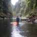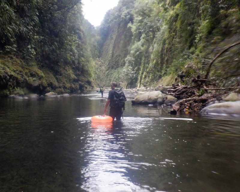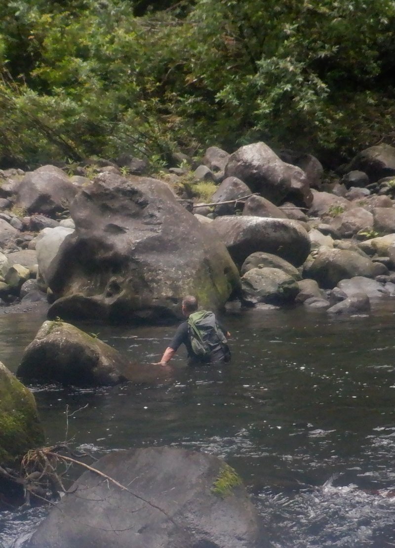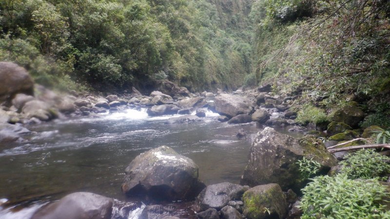 La randonnée débute au kiosque situé au départ du sentier qui mène des dizaines de familles au pied de l'avant dernière cascade de la Grande Ravine Photo 1). Sans faire de bruit, s'asseoir sur un banc sous le kiosque et guetter les lézards verts qui attendent l'insecte en se cachant entre la poutre et tôle de la toiture. Les jeunes sont moins timides mais les gros sont bien plus beaux. Partir sur la route en revenant vers Saint-Benoît. On trouve un emplacement pour stationner un véhicule à 200 m de l'entrée du sentier mais cet échauffement depuis le kiosque permet d'apprécier la route verdoyante (Photo 2). Après 600 m de marche, une trouée discrète dans les sabres et goyaviers indique le départ du sentier (Photo 3). On pénètre sous le couvert des goyaviers pour une marche facile sur les racines et la terre humide. Un panneau avertit du danger potentiel de la montée rapide des eaux. La descente réelle peut débuter. Le ton est vite donné par une forte pente qui ne cessera qu'à la rivière (Photo 4). Le sous-bois est agréable, le sentier toujours visible, les goyaviers sont partout et les racines omniprésentes (Photo 6). Ne surtout pas prendre de bâton et utiliser les centaines de troncs pour ralentir la marche lors des raidillons glissants. Des trouées dans la végétation permettent de voir l'aval de Rivière des Marsouins (Photo 7). Apprécier au passage l'énorme bois de rempart qui a poussé sur des rochers et crée par ses racines une vaste grotte. Quelques cordes de bonne qualité sont fixées aux arbres et facilitent grandement les passages glissants ou rocheux (Photo 5). Après plusieurs de ces obstacles, le terrain s'assagit mais sur une courte distance. La forêt est belle et certains spécimens de bois de couleurs ont réussi à atteindre de belles tailles (Photo 10). Après ce court repos, la pente reprend de plus belle, les cordes se multiplient, les bras travaillent autant que les jambes. Un passage rocheux vertical comporte des marches métalliques fixées par les canyoneurs. Elles reposent ainsi les bras déjà mis à rude épreuve. Après un dernier passage rocheux et glissant (Photo 11), on arrive dans les longoses qui entourent la dernière chute de la Grande Ravine (Photo 13). Un petit ruisseau coule vers le bassin et ce n'est pas la peine de chercher à éviter l'eau car bientôt, les pieds seront toujours dans le courant. La chute est haute et fine et représente une belle descente en rappel. Elle tombe dans un bassin qui se déverse dans la Rivière des Marsouins par une dernière cascade qu'il faudra longer pour atteindre le torrent qu'on voit très bien du promontoire (Photo 14). Les cordes sont là pour franchir les derniers mètres (Photo 15) mais il faut faire attention à la glissade qui pourrait s'avérer dangereuse. Une fois franchi ce dernier obstacle (Photo 16), on arrive sur la rive gauche de la rivière. Un grand bassin barre déjà le passage mais une trace discrète permet de le contourner en grimpant sur les rochers en rive gauche (Photo 17). La remontée reprend en alternant galets, sable, passage dans l'eau ou sur les berges boisées. (Photo 20) Après des traces de camping sauvage sous un rocher, on poursuit vers l'amont puis, après un coude de la rivière, le spectacle commence avec la cascade en ligne de mire (Photo 21). C'est déjà très beau et impressionnant mais pour s'en approcher, il faudra traverser la rivière un peu plus loin. Le courant est fort, les roches immergées extrêmement glissantes et on en vient à regretter le bâton resté dans le véhicule. Une solution consiste à repérer les rochers sous l'eau et y mettre les mains afin d'avoir trois ou quatre points d'appui. C'est trempé mais heureux qu'on parvient au pied de cette curieuse cascade entourée de deux grandes grottes issues de l'effondrement des orgues basaltiques qui l'entourent (Photo 25). Le spectacle est grandiose. D'autres chutes tombent d'un peu partout. A droite du canyon, admirer les orgues mélangées par de formidables forces telluriques et creusées par des cascades. La grotte de gauche peut s'atteindre en traversant la rivière et en montant sur la rive opposée mais on court le risque de déranger les salanganes qui volent par dizaines autour des chutes. La rivière vient de la gauche derrière un coude de la falaise mais il n'y a que peu d'intérêt de s'y rendre sauf peut-être pour apprécier le canyon étroit. Il n'y a pas à réfléchir pour le retour qui empruntera le même itinéraire que pour la descente. Comme souvent sur ces terrains escarpés, la remontée sera plus rapide que la descente.