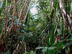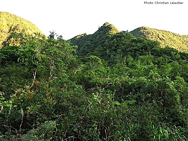 La randonnée débute par quelques dizaines de mètres de route en marchant sur le Chemin de Grand Fond vers Saint-Benoît. Quelques traces partent sous les goyaviers, créées lors de la cueillette des fruits. Une trouée plus importante que les autres se remarque de l'autre côté du fossé (Photo 1). La montée débute sous les goyaviers partiellement envahis de vignes marronnes mais heureusement de bois Noël donnant une petite touche colorée (Photo 2). Il faut se baisser sur la première centaine de mètres car les canyoneurs taillent rarement les sous-bois pour en faire des GR. Il faut d’ailleurs respecter cette habitude et laisser le sentier comme il est. Une fois passé ce court écueil, le sentier se suit sans problème en montant graduellement et régulièrement dans les goyaviers et quelques bois de couleurs. Il longe la ligne de crête qui devient parfois très étroite. Il faut se méfier de cette étroitesse et regarder où poser les pieds car le ravin sur le côté, bien que protégé de plantes, est très pentu. Les points de vue sont très rares ou masqués par les plantes (Photo 5). Un peu plus haut on a enfin une trouée qui permet d'embrasser toute la vallée du regard (Photo 7). La végétation est vraiment très touffue. Les fanjans dépassent des bois de couleurs non encore envahis de goyaviers (Photo 8). La montée se poursuit en direction du premier piton marqué sur la carte à 943 m. A son approche, le sentier part sur la gauche et évite le sommet par un contournement comportant quelques passages délicats. Les panoramas s'élargissent et le regard porte très loin (Photo 10). La végétation a déjà changé à cette altitude et les mousses, fougères et branles bordent le sentier étroit mais très marqué par les passages des canyoneurs depuis fort longtemps (Photo 11). Les sphaignes également ont envahi le parcours mais on fait tout pour ne pas les piétiner (Photo 13). Une courte descente amène à un col entre les deux sommets mais la remontée reprend aussitôt. Les sabres sont de plus en plus nombreux dans les bois de couleurs. Les mains s'avèrent utiles pour certains passages et deux cordes vieillissantes aident pour des passages courts mais raides. La montée n'en finit pas puis on commence à apercevoir de la lumière à l'approche du plateau qu'on découvre avec plaisir pour les jambes (Photo 15). On pense pouvoir marcher en se reposant mais c'est sans compter sur les sabres de près de deux mètres de long et les pimpins qui ferment le passage et les portions boueuses difficiles à éviter (Photo 16). Un peu plus loin, les pimpins se multiplient dans une zone relativement marécageuse. On a vite fait de remplir les chaussures d'une boue nauséabonde (Photo 17). On voit la vallée de la Grande Ravine sur la droite et on s'étonne de partir vers la gauche comme pour remonter vers les sources. Après une traversée de sabres le sentier repart enfin vers la droite. On se retrouve à un moment dans une petite clairière comportant des traces de tôle rouillée ; sans doute un ancien camp braco (Photo 19). Le sentier descend une dernière fois pour couper une petite ravine puis rejoint enfin la rive droite de la Grande Ravine (Photo 20). La rivière qui finit en cascade vers le PK12, est ici un ruisseau avec peu d'eau mais de gros rochers et galets. Les canyoneurs partent vers la droite vers la descente des cascades (Photo 21). Les randonneurs, eux, font demi-tour pour rejoindre par le même itinéraire l'aire de pique-nique de l'Ancienne Cité du Pk12. Le sentier comportant peu de dangers, il faut compter 30 minutes de moins pour la descente.