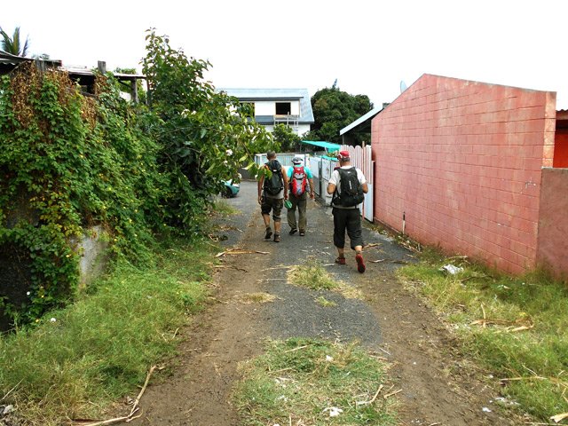 La randonnée débute au parking de la Rue Jean XXIII et au pont qui enjambe la ravine Goyaves (Photo 1). Remonter la rivière dans une végétation constituée très souvent de chocas (Photo 2) et passer les différents bassins, de manière souvent acrobatique (Photo 3) en direction de la passerelle en bois qui a été sommairement jetée sur la rivière (Photo 8). Le sentier est parfois large et propre (Photo 4) mais il faut pourtant passer par moments au plus près des bassins en escaladant les rochers qui les bordent (Photo 6). A partir du bassin le plus proche de la passerelle, poursuivre vers l'amont en marchant le plus souvent en rive droite. Certains passages sont faciles et instinctifs. D'autres s'effectuent en passant sur les rochers en prenant garde à la glissade (Photo 9). Quand il n'y a plus de sentier et que le niveau de l'eau est fort, suivre la rive en passant au plus facile (Photo 10). Repérer, à la hauteur du Parc du Gol, le sentier discret qui débute sur la rive droite (Photo 13 - voir § ci-dessous pour plus de détails). On rencontre ça et là de beaux petits bassins alimentés ou non avant de parvenir au Bassin Pilon. Il est entouré d'un cadre sauvage et alimenté par une agréable chute d'eau (Photo 14). Du bas, on distingue la petite échelle qui confirme que le sentier passe à nouveau par les rochers. Le lieu permet une halte casse-croûte à l'ombre des grands arbres qui dominent le bassin. Grace à l'échelle, la montée vers le haut de la cascade ne pose pas de problème (Photo 15) et la progression se poursuit. 15 minutes plus tard, on parvient à des murettes laissant penser à la présence d'un îlet au siècle dernier (Photo 16) même si aucun autre vestige ne vient le confirmer. On passe un nouveau bassin avant de parvenir en quelques minutes à la Source Pierre Noël, un autre endroit sauvage aux hautes murailles franchissables par la rive droite. D'autres bassins (Photo 18), ou petites cascades (Photo 19) rajoutent au charme de cette montée sportive. Les coqs et les chiens se font entendre de plus en plus. Leurs cris proviennent des habitations situées au-dessus de nos têtes. La fin de la montée approche. Il faut franchir un passage recouvert de végétation (Photo 22) pour arriver au clou de la Ravine Goyaves : un grand bassin alimenté par la plus haute chute de la journée surgissant d'une quinzaine de mètres de hauteur. Même en cherchant bien, impossible de remonter et le demi-tour s'impose. 200 mètres en aval, un passage permettrait d'atteindre le village au-dessus mais traverse une propriété privée. Poursuivre donc de 500 mètres et retrouver le passage repéré en montant (voir § ci-dessous). Bifurquer sur la droite et emprunter cette trace qui grimpe assez fortement vers le Parc du Gol. La végétation n'a pas tout envahi et on devine d'anciennes marches bétonnées (Photo 24). Plus haut, on est arrêté par les tas des habituels immondices laissés là en fin de pique-nique. On a supprimé de toutes les aires les poubelles afin de ne pas attirer les rats alors qu'ils évoluent bien plus à l'aise dans ces ordures jamais ramassées ! Prendre à droite vers un palmier puis rejoindre l'aire de repos bordée d'une énorme bougainvillée mauve de près de 10 m de haut. Prendre la route vers la droite, longer le lotissement de la Cité Colombe en profitant des magnifiques panoramas sur les Makes et le Dimitile (Photo 25). Préférer la petite route à droite dans les cannes pour éviter la circulation. Elle se finit à un grillage qu'un petit sentier longe pour rejoindre la route. Le détour à la Chapelle Sainte-Thérèse ne prend que quelques minutes (Photo 26) avant de poursuivre vers le pont qui franchit la Ravine Goyaves. Un coup d’œil sur la droite permet de repérer le haut d'une cascade non atteinte durant la marche. Prendre à droite sur l'Allée des Gerberas et cheminer sur une étroite ruelle qui rejoint par la gauche le Chemin Concession qu'on abandonne rapidement pour emprunter des chemins un peu terreux mais qui évitent les rares véhicules empruntant le raccourci des cannes. La pente est douce et régulière et permet de nouveaux panoramas sur Saint-Louis et l'océan (Photo 27). Poursuivre, toujours au plus facile jusqu'aux premières cases de Plateau Goyaves (Photo 28). Le véhicule est très proche en direction du pont emprunté en début de boucle.