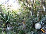 Si on choisit de passer par le Parc du Gol pour effectuer cette boucle il est fortement conseillé de repérer le sentier qui le rejoint lors de la remontée de la rivière. Quelques heures plus tard, avec la fatigue et les dizaines de bassins rencontrés, on est moins attentif. Veiller tout d'abord à se situer par rapport au parc en regardant la carte (et le GPS même si la trace zigzague un peu parfois). A cet endroit, la rivière est étroite et ne comporte pas de bassin. Des gros rochers recouvrent le fond (Photo 13). Repérer tout d'abord le grand choca de 3 mètres en rive droite près d'une petite touffe de papyrus. On distingue une trace partant vers le rempart. Un arbre au tronc gris (Je n'ai pas pensé à l'identifier !) pousse près des rochers de la rive. Un autre, tout proche, supporte plusieurs lianes dont deux sont entremêlées. Passer sous les lianes. Le reste de la montée est facile car le sentier est assez bien marqué jusqu'au palmier (genre dattier).