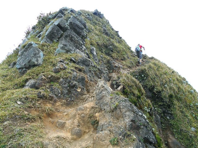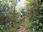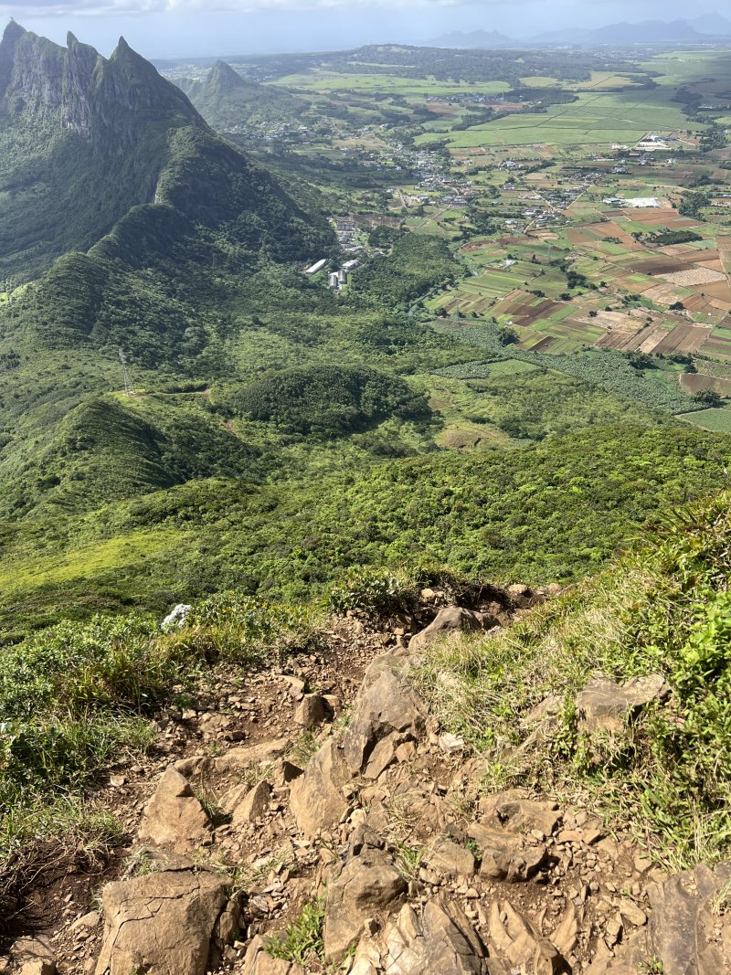 La randonnée débute par une large piste qui passe près de quelques cases (Photo 1). La pente est douce et sans difficulté. Sur la gauche, un panneau en bois indique quelques directions et temps de marche, en prévoyant 2h10 pour le Pouce (Photo 3). Prendre un peu à droite et longer une piste très caillouteuse qui débute près de grands eucalyptus avant de pénétrer sous le couvert des jamrosas qui créent une ombre agréable (Photo 5). Plus loin, la piste se rétrécit et se transforme en sentier constitué essentiellement de gros cailloux qui mettent à mal les chevilles (Photo 6). La végétation se raréfie très vite et le sentier effectue un lacet vers la droite. On longe alors une haute barre rocheuse infranchissable qui comporte des barres en bois fixées horizontalement sans qu'on en devine la raison (Photo 7). Les singes aperçus plus loin dans la vallée n'ont nul besoin de ces barres pour passer les rochers et elles sont trop fragiles pour ralentir d'éventuelles chutes de pierre. Le sentier, toujours aussi caillouteux, commence à grimper de plus en plus (Photo 8). Après quelques lacets, on parvient à un minuscule oratoire bleu au début d'un petit plateau. Profiter des panoramas sur l'île avant qu'ils s'élargissent jusqu'aux 360 ° du sommet. Les cailloux disparaissent enfin pour être remplacés par de l'herbe et de la terre. Une bifurcation sur la gauche permet de rejoindre Port Louis. Le sentier se poursuit sur la droite dans les goyaviers (Photo 13), longoses et magnifiques palmiers. Il serpente sans difficulté par une pente raisonnable et parfois un peu glissante. Les longoses se multiplient et remplacent les goyaviers, chacun luttant pour l'envahissement des flancs escarpés du Pouce (Photo 14). On parvient à un nouveau petit plateau où les panoramas ont encore grandi. Le Pouce, droit devant, affiche son sommet qui semble proche (Photo 15). La pente, à vue d'œil, est extrêmement raide sur les derniers 30 mètres. Cette partie est déconseillée aux personnes sujettes au vertige. L'ascension débute dans une forêt de goyaviers puis de bois de couleurs de petite taille en raison des vents violents qui balaient les cimes à longueur d'année. Le sentier comporte de très hautes marches qui, liées à la verticalité des lieux, créent la seule véritable difficulté de la sortie (Photo 19). Ici, pas d'à-pic vertigineux mais un profond sillon creusé par les milliers de passages, beaucoup plus sécurisant que les roches lisses rencontrées sur d'autres pics (Photo 20). Les mains sont nécessaires pour assurer la sécurité car on trouve très rarement des câbles de mains courantes à Maurice. Le sommet de quelques mètres carrés comporte de grosses roches et un peu de place pour les randonneurs essoufflés (Photo 21). Port Louis occupe une large part du panorama côté océan (Photo 23) et tout le tour du Pouce est occupé par les pitons alentour, un spectacle garanti. Attention, le vent peut être violent. Après s'être régalé du spectacle, la descente peut débuter par le même itinéraire (Photo 25) en prenant garde lors de certaines portions pentues où il est préférable de s'asseoir avant de poser les pieds. Arrivés au plateau près des bois de couleurs, le reste de la descente est un plaisir.