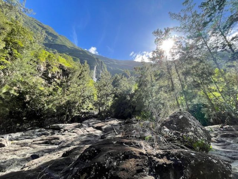 La randonnée débute à Dos d'Ane où de nombreux emplacements de stationnements sont disponibles à l'église, plus deux au départ du sentier. On ne décrit plus cette longue descente, ici effectuée de nuit, qui prend 1h30 à sauter de marche en marche ou de roche en roche ou utiliser échelles ou câbles qui facilitent les franchissement. On profite peu des panoramas sur les crêtes car le soleil se lève à peine (Photo 1). Les parties plates sont assez fréquentes et permettent de souffler un peu. On frise les 800 m de dénivelé et il faut, dès le départ, savoir qu'on devra remonter, fatigués de la sortie, à la lampe frontale si le départ a été tardif. Une fois à l'Îlet Albert, l'aventure peut commencer ! Traverser le gué sur le Bras de Sainte-Suzanne et emprunter la piste qui part sur la gauche (Photo 3) et se termine en cul de sac près d'une mer verte et jaune de hautes cannes fourragères. Elles sont si serrées qu'il devient impossible de se perdre à condition que des âmes charitables aient pris soin de tailler à chaque passage pour créer l'indispensable tunnel (Photo 4). En longeant cet itinéraire on marche dans ces hautes herbes, on traverse le bras de Ste-Suzanne sur de petits gués ou l'on marche en rive droite dans une végétation assez touffue (Photo 5). Le sentier, assez facile puisque plat, se rapproche des pitons rocheux qui forment un étroit canyon et servent de repère pour remonter le Bras des Merles (Photo 6). Ce sentier qui rejoint Aurère, malmené par la végétation, est assez difficile à repérer une fois le dernier gué franchi avant le barrage (Photo 7). On se retrouve sur l'ancienne piste ayant servi à la construction du barrage. Elle est méconnaissable, envahie d'une végétation dense mais se suit sans problème. Curieusement, l'eau rencontrée lors des passages de gués a disparu et la progression, lorsqu'elle n'emprunte pas la vieille piste, s'effectue parfois en rive droite ou dans le lit de la rivière. Lorsque le torrent a beaucoup d'eau, on rencontre de magnifiques bassins d'eau claire remplis par des résurgences. La remontée se poursuit en sautant de galet en galet. Repérer, sur un gros rocher à droite, un beau pied de lilas de Perse ou margousier (Melia azedarach) dont le parfum a indiqué sa présence 100 mètres avant d'arriver au rocher (Photo 8). Sa fleur en grappe est magnifique. Plus haut, le discret sentier remonte près des rochers et des vestiges de la piste vers une plateforme également couverte d'arbustes (Photo 9). On passe au-dessus ou près des deux tunnels bétonnés bien visibles sur la carte mais désormais cachés par le feuillage. C'est là que débutent des kilomètres de galeries creusées sous la montagne pour transporter l'eau vers l'ouest. On parvient au barrage qui récupère une grande quantité d'eau par d'ingénieux systèmes (Photo 11). Le sentier vers Grand Îlet débute de l'autre côté de la rivière. Après avoir escaladé la dizaine de mètres de roches bétonnées, il est facile à deviner dans les langues de belle-mère (Sansevaria). C'est parti pour une longue remontée du bras sur un sentier assez facile à suivre dans les chocas la plupart du temps (Photo 13). La visite de l'Îlet Natte est réservée aux amateurs de griffures, piqûres et rampés sous les lianes papillon. Le sentier s'élève plus vite que le cours d'eau que l'on domine en frôlant quelques précipices protégés par des branches puis redescend au gré du relief très chaotique du fond de la vallée. Si le chrono le permet, ne pas manquer les trois bassins alimentés par de belles chutes d'eau. Le petit sentier qui rejoint la berge se devine facilement avant la grande montée sableuse de la Photo 16. Une fois à la rivière, traverser au pied du troisième bassin (Photo 14). Poser les sacs sous l'arbre et entreprendre la grimpette qui permet de contourner deux nouveaux bassins dont le Bassin Bleu. Les cascades qui les alimentent ne sont pas excessivement hautes ; l'endroit (également dangereux), dominé par le piton qui surplombe le Bras Détour, est enchanteur et invite au repos et à la baignade (Photo 15). Il faut pourtant poursuivre en retrouvant le sentier. Après la forte pente où les feuilles de chocas servent de main courante, on se retrouve en haut du Bassin Bleu pour un dernier coup d'œil sous un autre angle (Photo 17). Le sentier est toujours aussi facile à suivre (Photo 18). Le Bras Détour surgit de la falaise sur la gauche. Il sort d'un étroit canyon dont on peut en remonter une partie après quelques acrobaties sur les rochers. Plus haut, le paysage est réservé aux canyonistes. Le confluent comporte une dent de roche sédimentaire friable très facile à repérer (Photo 20). Traverser à gué à cet endroit et remonter la rivière en rive gauche jusqu'aux filaos, 200 mètres plus haut (Photo 21). Repartir en rive droite et repérer le nouveau départ de sentier (voir § ci-dessous). Chaque replat du terrain comporte des traces de vie concrétisées par des espaces empierrés, des murettes (Photo 22), des arbres fruitiers ou des bananiers produisant encore des régimes (Photo 23). On trouve même la tombe de Joseph, mort à 32 ans et enterré à deux pas du sentier. Il faut dire qu'à des kilomètres de la civilisation, beaucoup d' habitants de ces microscopiques îlets naissaient, vivaient et mouraient sans avoir mis un jour les pieds dans le chef-lieu. Un cimetière existerait, mais la végétation trop dense enlève à l'émotion que dégagent ces lieux. La plupart du temps, le sentier conserve son aspect. Il faut parfois suivre de très courts tronçons de ravine à l'instinct mais l'on devine facilement la reprise de la trace (Photo 24). Un seul endroit peut inquiéter et mérite plus d'attention : il s'agit d'un ancien éboulis au sol incertain, étroit, sableux et glissant (Photo 25). 300 mètres plus loin, des bêlements attirent l'attention. On se retrouve à l'emplacement d'un ancie