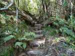 La randonnée débute près d'un panneau indiquant clairement le départ après avoir pris connaissance des nombreuses explications de l'affiche en place afin de mieux connaître l'association AVE2M (Photo 3). Quelques mètres plus loin, un nouveau panneau gravé dans le bois indique l'emplacement de pique-nique qui peut s'avérer utile en fin de parcours (Photo 4). Impossible de se perdre sur ces 1000 mètres très bien balisés de tâches de peinture rouge (Photo 5). On se retrouve très vite près de monstrueux tamarins dont certains ont souffert des cyclones mais tiennent toujours fièrement debout (Photo 6). D'autres ont eu moins de chance et gisent au sol où ils mettrons des décennies avant de disparaître, rongés par les insectes et les champignons (Photo 7). Le sentier est très agréable, tantôt plat et bordé de récentes plantations (Photo 8) tantôt pentu sur des portions constituées de grosses marches de bois de tamarin (Photo 9). Il s'approche ou s'éloigne de la route et frôle par deux fois la petite ravine qui se jette un peu plus bas dans la Rivière d'Abord. A la saison, les arums fleuris donnent de belles tâches blanches dans la verdure (Photo 16). Par moments, on passe au milieu des tas de plantes enlevées du sol ou des grands arbres et qui sèchent lentement au sol. Cette éradication a créé de belles et larges clairières envahies de lumière (Photo 20). On se retrouve très vite à un nouveau panneau gravé annonçant l'arrivée (Photo 23). Tout près, avant de rejoindre la route, remarquer l'énorme arche naturelle créée par un imposant tamarin couché au sol (Photo 24). Tout près, une croix fleurie rappelle sans doute un accident survenu sur les lieux qui aura coûté la vie à un jeune de 22 ans.