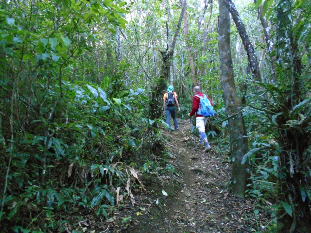Montée pour les amateurs de sentiers bracos : Suivre la trace envahie de longoses dans les premiers 50 mètres (Photo 2). Rapidement, le sentier devient facile à suivre malgré cette abondance de feuilles vertes qui tentent de le cacher (Photo 4). Les longoses sont soit coupées, soit tordues. On frôle de magnifiques bois rouges, bois de perroquets ou bois maigres aux racines naturellement sculptées (Photo 3). On a parfois l'impression de perdre la trace mais on la retrouve très vite entre les arbres (Photo 5). La montée est régulière et rarement difficile. Quelques points de vue permettent d'apercevoir les villes côtières et l'océan (Photo 7) et les remparts qui entourent le lieu vers le Malbar Mort (Photo 8). Quelques roches affleurent parfois à travers les racines (Photo 6) et les premiers gros tamarins font leur apparition (Photo 9). Les longoses viennent même à l'assaut de leur tronc mais auront du mal à les déstabiliser, ce qui ne sera pas toujours le cas de jeunes plants. Hélas, les boîtes de pâté, de sardines ou canette de verre polluent de plus en plus le sol et on tombe sur les premiers terrassements. Profiter surtout des beaux paysages car on s'est élevé et l'horizon s'est élargi (Photo 11) avant de faire demi-tour par le même sentier. En arrivant au croisement avec le parcours de Bon Accueil, prendre à droite et terminer en effectuant la grande boucle de la Découverte pour rallonger un peu la balade.