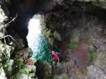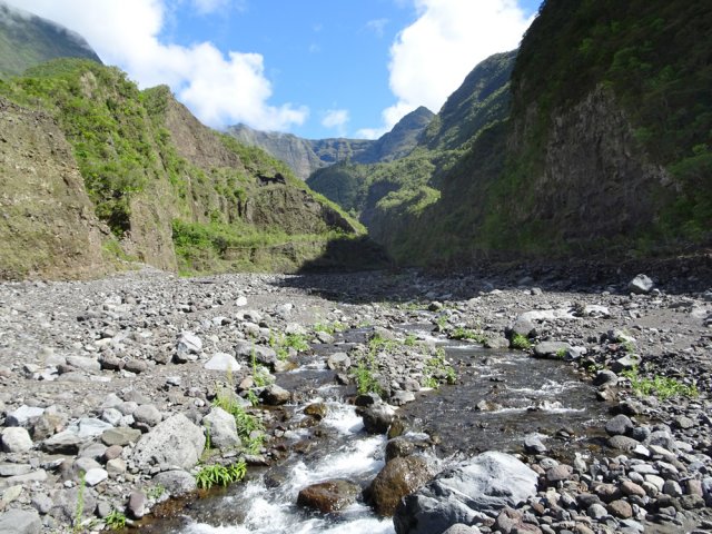 La randonnée débute à deux pas de l'ancienne horloge à eau désormais remplacée par un monument à la mémoire d'Edgar Avril et du Captage. Un belvédère au-dessus du vide permet de contempler le village 700 m plus bas et d'apercevoir le bassin du Voile de la Mariée (Photo 1). Tout près, le téléphérique sert au ravitaillement et l'on peut voir la petite nacelle qui attend les marchandises. On pourra même visiter l'autre extrémité du câble une fois à Grand Bassin. Le sentier débute près du téléphérique et longe le rempart protégé du vide par la végétation. Goyaviers, bringeliers et lantanas constituent une grande part de la végétation empêchant de profiter du spectaculaire panorama. Après un petit kilomètre d'une marche facile, le sentier se met à plonger sans transition. Les marches en béton du début sont remplacées par celles en pierre, plus nombreuses et souvent très hautes. Cette descente qui semble ne jamais finir se poursuivra jusqu'au Bras Sec avec seulement une partie plate longeant une haute falaise basaltique (Photo 2). On passe près de l'oratoire dédié à Ste-Rita le long de cette falaise, après avoir franchi l'éboulis qui vaut au sentier d'être régulièrement fermé durant les longues remises en état. La descente se poursuit, sans grande difficulté hormis de hautes marches. Si elles paraissent faciles lors de la descente,au retour il en sera tout autrement (Photo 3). Les vues sur les différentes vallées sont de plus en plus belles au fur et à mesure que le soleil s'élève. On devine souvent le bassin et sa cascade sur la gauche du village qu'on domine encore pour longtemps. On rencontre à mi-parcours les nouvelles installations de transport d'eau. De récentes canalisations posées sur les anciennes laissent imaginer un vertigineux chantier. Cela ne rajoute rien à l’esthétique du lieu mais doit gagner en efficacité. De nombreuses passerelles et de hauts escaliers permettent de franchir les ouvrages sans danger de glissade sur les tuyaux humides. Une DZ domine les installations de pompage. Elle s'atteint facilement pour mieux profiter du paysage (Photo 4). A partir des dernières canalisations, la descente est plus facile et l'on aperçoit très bien la vallée du Bras Sec ou le rempart séparant de Cilaos vers le Rond des Chevrons (Photo 5). Les derniers hectomètres comportent encore de hautes marches sur un sol rocheux (Photo 6). La passerelle franchissant le Bras Sec marque la fin de la descente et le début de Grand Bassin (Photo 7). Un coup d'œil sur le chemin parcouru permet d'apprécier la pente et de deviner le belvédère du départ (Photo 8). On se retrouve vite dans ce petit village sans rues mais parcouru de larges sentiers bordés de murets en pierres sèches (Photo 9). Les gîtes rivalisent de beauté par les couleurs de leurs façades ou les jardins fleuris qui les bordent. De belles treilles de vigne créent de l'ombre pour le repos des randonneurs restés dans les gîtes (Photo 10). Au premier croisement de ces sentiers, prendre à gauche et descendre vers le Bras de Sainte-Suzanne qu'on entend depuis les habitations. La visite de la chapelle, en partant à droite, ne prend que 5 minutes (Photo 11). Dans la descente, repérer le petit sentier de gauche, non renseigné, menant en moins de 100 m aux installations du monte-charge pour de nouvelles vues en direction de Bois Court (Photo 12). Reprendre la descente jusqu'au gué, facile à franchir en sautant de roche en roche si le niveau de l'eau est assez faible. Une beauté de la nature constituée d'une cascade tombant dans un bassin surmonté d'une arche basaltique se visite à 150 m du gué sans se mouiller les pieds. Partir vers l'amont en cherchant le meilleur passage, principalement en rive gauche (Photo 13). Le torrent est toujours vif et ne se prête pas du tout à la baignade (Photo 14). Quand un bassin semble empêcher la remontée, repérer dans la falaise le sentier étroit qui grimpe assez fortement, passe près d'une échelle et se termine au pied du bassin (Photo 15). L'accès à la grotte s'effectue sur les basaltes lisses où les prises sont assez rares (Photo 16). Il faut donc prendre toutes ses précautions pour l'atteindre, renoncer si les roches sont mouillées et ne pas l'effectuer avec un enfant. Une fois atteint le haut de la grotte, le spectacle est au rendez-vous (Photo 17). L'eau de la petite cascade se jette dans un bassin profond entouré de grottes (Photo 18). Ne pas laisser de déchets en ce lieu magique. Reprendre la descente du cours d'eau en empruntant le même itinéraire et repartir sur la droite au gué en direction de la cascade. Les plus aventureux voudront tenter les quelques cordes permettant de rejoindre le Bras des Roches Noires. L'aventure est de courte durée mais peut s'avérer ludique en prenant garde cependant aux passages étroits en corniche ou aux pierres qui s'effritent et peuvent blesser "les premiers de cordée" (Photo 19). Le départ se situe 50 m avant le haut de la cascade. Grimper quelques mètres le long de la ravine caillouteuse à sec en visant la première corde, discrète, une dizaine de mètres en amont. Le sentier monte fortement jusqu'au balcon d'où l'on bénéficie de superbes vues sur le bassin et la vallée du Bras de La Plaine. Il traverse un sous-bois et longe ensuite le bras après les longues descentes encordées (Photo 20). Descendre dans le lit de la rivière, très large et couvert de galets pour se balader à l'envie (Photo 21). La remontée du Bras des Roches Noires nécessite une journée spéciale. Entamer la descente du bras en passant au pied de l'Îlet Cicielle désormais abandonné mais toujours en propriété privée. On aperçoit la canalisation des Hirondelles sur le rempart d'en face (Photo 22). Le Bras des Roches Noires est rarement à sec mais se traverse assez facilement sans se mouiller les pieds. On parvient très vite au confluent avec le Bras de La Plaine en sauta