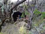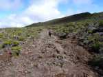 La randonnée débute au plus près de l'agréable aire de repos de Bois Ozoux, située à l'ombre d'une cinquantaine de petits tamarins. Les emplacements de stationnement sont vastes et l'endroit est calme et reposant.Penser à le repérer pour y manger un bon casse-croûte après cet aller-retour qui peut tout de même s'appeler boucle. Le GRR2 qui vient du Piton Textor a coupé plusieurs fois la route du volcan avant d'arriver à l'aire. Récupérer ce sentier sur la droite et entamer la montée (Photo 1). La pente est faible mais le sentier est caillouteux obligeant à regarder où poser les pieds (Photo 2). On profite déjà de larges panoramas sur la vallée de la Rivière des Remparts et le Nez de Bœuf cependant on pourra s'en approcher de bien plus près au retour (Photo 3). Les petits tamarins diminuent et les branles verts augmentent en nombre mais pas en taille (Photo 4). On frôle la route à l'endroit où il sera préférable de la quitter au retour si la circulation est importante (Photo 5). Quand les cailloux laissent la place à de larges plaques basaltiques rugueuses, on peut admirer, en se retournant, une grande partie de La Réunion, de l'Etang Salé à Saint-André en passant par les pitons habituels(Photo 6). On arrive très vite à la Stèle Josémont Lauret, toujours fleurie malgré l'altitude (Photo 8). Le sentier est relativement plat en traversant une lande constituée presque exclusivement de petits branles verts (Photo 9). La pente reprend sur les plaques pour une marche plus facile en direction du Piton des Basaltes dont on aperçoit la petite pointe surmontée de quelques antennes à l'horizon (Photo 13). Cette montée s'achève à l'Oratoire Sainte-Thérèse, très connu des randonneurs car quatre sentiers passent par là (Photo 16). La piste débute un peu plus haut mais ne pas quitter le lieu sans aller au plus près du rempart à 20 mètres de là pour admirer de nouveaux panoramas en direction du Fond de la Rivière de l'Est (Photo 18). Le Plateau des Basaltes avec ses aires dénudées entourées de brandes est à quelques encablures et peut donner lieu à un détour de 1500 m afin de rallonger cette balade (Photo 17). La piste équestre, une ancienne piste caillouteuse de mise en place des antennes, débute près d'un petit tamarin (Photo 19). La sortie, qui n'était guère difficile jusque là devient encore plus facile sur cette piste large (Photo 22). La taille des branles, à 2400 m d'altitude a encore diminué et il est possible sans danger d'effectuer de courts hors sentier, ne serait-ce que pour grimper le petit piton sur la gauche (Photo 21). Plus bas, repérer sur une roche située sur la gauche, un amoncellement de cailloux qui permet de trouver sans hésitation la Caverne des Lataniers. Emprunter le discret sentier qui s'approche des fourrés (Photo 23). On peut trouver ici la sérénité et l'abri pour la nuit. Pas d'eau pour la douche, un plafond bas, du bois sec et assez de place pour loger une demi-douzaine de sacs de couchage font de cet endroit le lieu idéal pour la halte lors d'une traversée de l'île (Photo 24). Reprendre la piste qui rejoint parfois le sentier à le toucher (Photo 25) et rejoindre la route par un long virage à angle droit. Marcher sur la route quelques dizaines de mètres puis partir sur la gauche à un petit parking de terre rouge. On s'approche alors au plus près du bord du rempart pour de nouvelles vues impressionnantes sur la Rivière des Remparts et le Trou Fanfaron, sur la gauche, très difficile d'accès (Photo 26). A partir du petit cratère rouge situé au plus près de la route (Photo 28), repérer quelques sentiers qui rejoignent le GRR2 si on ne veut pas arriver à Bois Ozoux par la route.