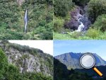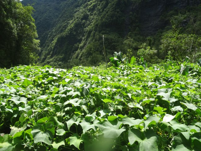 La randonnée débute à l'Escalier, près de la chapelle, de la statue d'Héva et d'un petit restaurant où il fera bon reprendre des forces au retour (Photo 1). La route est large, la bande latérale également (Photo 2) et quelques curiosités peuvent égayer la sortie (voir § ci-dessous) cependant il est possible de prendre le bus à l'Escalier et d'effectuer rapidement les 4 km jusqu'au Plateau Wickers. Après avoir repéré le panneau de l'arrêt de bus, partir en rive gauche de la ravine étroite et rocheuse. De la route, on a du mal à imaginer un passage, on pénètre aussitôt dans une végétation touffue pour entamer la première pente forte de la journée. Les 200 mètres s'effectuent rapidement malgré les plantes, l'herbe haute et les pointes de liane chouchou qui colonisent le fond (Photo 4). Le passage vers une bananeraie est instinctif, très pentu et la corde mise en place précédemment a disparu. Rien n'est plus invasif qu'une touffe de bananiers qui double sa surface tous les deux ans. Le sentier a donc tendance à rétrécir lorsqu'ils sont trop près (Photo 5). On pénètre plus loin sous les goyaviers par un sentier étroit mais impossible à perdre. Il comporte quelques portions plates mais monte de plus en plus à partir d'une touffe de petits bambous. Les points de vue à travers la végétation sont rares (Photo 7). La montée devient constante sur racines, terre humide et hauts rochers qui ne sont pas toujours pourvus de cordes (Photo 8). Après 45 minutes assez sportives, on parvient à un col reconnaissable à son petit oratoire entouré de détritus (Photo 9). La descente commence dans les bois de couleurs et se poursuit dans les goyaviers (Photo 10). On retrouve les ingrédients de la montée avec les roches, les plantes qui envahissent le sentier ou les racines qui sont pourtant utiles pour éviter la chute (Photo 11). Le profil ci-dessous montre bien la pente, quasi verticale par endroits, qu'il faut descendre pour regagner le torrent qu'on entend couler (Photo 12). Après quelques rares portions plates (Photo 14) ou envahies de différentes plantes (Photo 15) on parvient enfin au Bras de Caverne et à l'îlet abandonné du même nom. Difficile d'y deviner des vestiges de vie tant la couche de chouchous a envahi la partie plate du coude de la rivière (Photo 16). Prévoir deux heures pour remonter le Bras de Caverne jusqu'à un passage qui oblige à faire demi-tour (non décrit ici). En prenant à gauche et en rive droite, on "attaque" une descente de 3 kilomètres où la moyenne horaire va frôler le km/h (Photo 17). Pas de description puisque chacun passe où bon lui semble, en général au plus près de l'eau où les cailloux sont plus petits (Photo 19). Il faut retenir qu'il n'y a pas de cascade donc pas de cassé dangereux ; les galets sont très nombreux mais se contournent ou s'escaladent. Un bassin s'évite par la rive droite en grimpant sur les basaltes qui le bordent. Un autre endroit, constitué d'énormes rochers de plusieurs tonnes, se passe par une sorte de tunnel créé sous l'un d'entre eux. La vallée est le plus souvent étroite (Photo 20) et de multiples petites chutes d'eau tombent en fines gouttelettes des falaises infranchissables (Photo 18). Après deux heures de descente, on se retrouve au gué que l'on a emprunté pour se rapprocher de la Cascade Blanche. Elle se rejoint en quelques minutes par un sentier boueux envahi de longoses (Photo 24). Plus loin, il est moins humide en sous-bois et se termine près d'un étroit canyon dans lequel coule un toboggan du Bras de Caverne (Photo 25). Le sentier se poursuit pour se terminer au bassin au pied de la grande chute (Photo 26). Après cette visite à la plus haute cascade, prendre le chemin inverse jusqu'au gué (Photo 27). Entamer la courte mais sportive remontée vers la chapelle de l'Escalier en empruntant le sentier ombragé qui se termine par une piste bordée de cases.