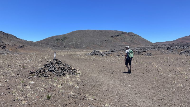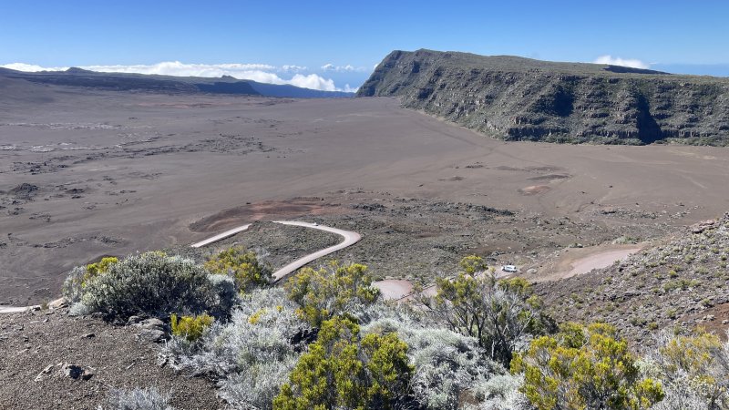 Après une trentaine de sorties sur la Plaine des Sables, il est surprenant de constater que le sentier qui part de la piste vers la GRR2 n'apparaît sur aucune fiche. Voilà qui est réparé avec cette boucle qui comporte la moitié de sa distance en hors sentier. La première partie traverse la Plaine des Sables et monte à l'Oratoire Sainte-Thérèse en suivant les trajets officiels. La deuxième sillonne dans la nature avec le pari réussi de ne jamais marcher sur une plante. Il faut alors, on s'en doute, effectuer des centaines de petits contournements pour toujours trouver les cailloux, lapilli ou prairies sauvages afin d'éviter branles verts et ambavilles qui ont souffert d'anciens incendies. Ce qu'il en reste rivalise de beauté sauvage et incite à ralentir le pas pour rechercher les plus élégants. On traverse également des zones où les sculptures de basalte créent de magnifiques natures mortes. On n'est jamais loin de la route où circulent les visiteurs du volcan. Même pari sur le Plateau des Basaltes dont on peut en faire le tour, profitant ainsi de grandioses points de vue sur le Fond de la Rivière de l'Est.