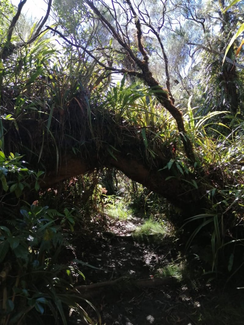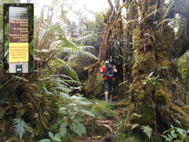La randonnée débute à deux pas de la Rivière des Marsouins où un parking a été conservé juste avant de parvenir au pont. Ces lieux de stationnement sont devenus tellement rares qu'il faut savoir où l'on va afin d'éviter de trop marcher pour débuter une randonnée. Les aires de pique-nique ont été supprimées il y a quelques années et des centaines de plots de sapin empêchent tout stationnement sauvage. Marcher sur le goudron en direction du Col de Bébour sur environ 1300 mètres avant de rencontrer le départ du sentier de la Rivière (Photo 1). Ce sentier humide et moussu est un raccourci pour éviter les nombreux lacets de la route. Il débute à plat et le restera jusqu'au franchissement de la Rivière des Marsouins. Les portions les plus boueuses comportent des planchers un peu vermoulus et glissants (Photo 2) ou de grosses bûches qui permettent de garder les pieds au sec (Photo 3). Ces 300 mètres de sentier étroit mais très agréable au milieu de la forêt primaire de Bébour donnent envie de poursuivre bientôt par celui de Takamaka. Il faut auparavant traverser un petit ruisseau puis rejoindre le lit de la rivière par une volée de marches et quelques lacets (Photo 4). Le lit est surtout composé de grosses pierres mal dégrossies et humides et le sentier se devine en rive gauche, en face du point d'arrivée à la berge. En amont, on entend autant que l'on voit la petite cascade alimentant un bassin qui se rejoint en cinq minutes (Photo 5). Eviter ce court écart avec des enfants, ainsi que la baignade qui pourrait être tentante mais qui est également déconseillée . Le sentier de la Rivière se poursuit en forte montée où certaines marches dépassent les 50 cm (Photo 6). On retrouve les mêmes bois de couleurs que sur l'autre rive ainsi que les mousses et épiphytes. On parvient très vite au goudron. Prendre à droite et marcher quelques centaines de mètres jusqu'au sentier de Takamaka, impossible à manquer (Photo 7). Ce sentier représente tout ce que l'on aime ou tout ce que l'on déteste mais jamais on n'entend un randonneur se plaindre d'avoir traversé cette forêt. Pendant 90 minutes, on va serpenter au gré du relief, slalomer entre les monstrueuses fougères arborescentes, passer de petites ravines, sauter des troncs tombés au sol, se baisser pour passer sous les arches végétales, s'enfoncer dans la boue ou l'éviter par des planchers. Les montées sont faibles tout comme les descentes et c'est sans aucune fatigue qu'on effectue la traversée. Le sentier est bordé d'ananas et de cannes marronnes, de troncs moussus, de jouvences et de magnifiques bégonias diadema qu'on ose à peine effleurer de peur de les casser. Les oiseaux sont un peu plus rares que sur le bord de la route mais les merles se font entendre à chaque sous-bois. Après avoir franchi un affluent de la Rivière des Marsouins et passé une échelle en aluminium, on s'approche de la fin du sentier. On rencontre le croisement vers l'usine de Takamaka, souvent fermé et déconseillé aux familles. Prendre alors à droite et terminer dans l'herbe pour nettoyer les semelles sur une centaine de mètres (Photo 17). Le sentier se termine définitivement à la piste de Takamaka, dans les branles verts et hauts fanjans avec de magnifiques vues sur les remparts entourant la Rivière des Marsouins (Photo 18). Partir sur la gauche pour profiter du magnifique point de vue sur la vallée, le barrage et les petites cascades qui l'alimentent (Photo 19). En se penchant un peu, on aperçoit d'autres chutes tomber dans le petit lac qui sert de réserve à l'usine installée 300 m sous terre à 4 kilomètres en aval. Tout près du belvédère dévoré par les herbes, les installations d'EDF abritent des petits bâtiments et le téléphérique employé par les agents (Photo 20). C'est en se penchant à nouveau qu'on les envie lorsqu'ils se rendent au travail ! La piste débute par quelques ornières en face d'une ancienne piste qui abrite des ruches (Photo 21). La boucle est presque finie. Prendre tout son temps pour repérer les essences variées de plantes qui bordent la piste (Photo 22). Ne pas manquer non plus les lointaines vues sur le Piton des Neiges ou les autres pitons dépassant à l'horizon (Photo 24). C'est après une montée régulière qui alterne sable, cailloux, goudron ou herbe (Photo 24) que l'on parvient à la barrière qui interdit l'accès de la piste aux véhicules (Photo 25). La fin de la boucle s'effectue sur route, assez peu fréquentée, qui permet de marcher moins d'un km dans un cadre très agréable (Photo 26). Si l'heure ou la météo le permettent, chercher en rive droite de la Rivière des Marsouins, juste après le pont qui la franchit, le passage qui permet d'atteindre la berge rocheuse. Rejoindre le cassé en aval en préférant la rive gauche, plus facile d'accès (Photo 27). La rivière, calme à ce stade, se précipite d'une bonne centaine de mètres dans le vide à quelques mètres de la caverne des Hirondelles (Photo 28). En essayant de ne pas gêner les dizaines de salanganes qui volent pour entrer et sortir de la grande grotte, il est possible de s'en approcher et d'y pénétrer. Remarquer, en haut de la cascade les cordes fixées par les canyonistes qui effectuent les descentes au bout de leurs longues cordes. Le véhicule est situé à une cinquantaine de mètres du pont.