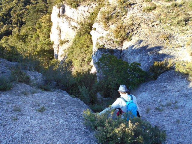 La randonnée débute ici à la chapelle (Photo 1) mais un grand emplacement de stationnement se situe aussitôt après avoir franchi l'autoroute en partant quelques mètres sur la gauche près d'une réserve d'eau pour l'incendie. Partir sur la piste en faible montée et rejoindre les bâtiments du Four à Chaux en prenant à droite à la fourche des trois pistes. Laisser les bâtiments puis continuer sur la piste dans les genêts et la garrigue (Photo 2). Ne pas manquer, 200 mètres plus loin le sentier qui part sur la droite et grimpe, toujours dans les genêts vers le rempart de calcaire qu'on aperçoit sur la droite (Photo 3). Il chemine tout d'abord à plat puis monte assez fortement sur une importante couche de petits cailloux qui roulent sous le pied. On atteint le bord du petit rempart longé par le sentier qui part à gauche en direction du Roc Gris (Photo 4). Le cheminement ne pose pas de difficulté hormis ces zones très caillouteuses (Photo 5). Plus on monte et plus les panoramas grandissent sur la région de vignoble, de forêts de résineux et de brandes (Photo 6). On atteint le Roc Gris rapidement pour profiter d'une vue splendide sur le Mont Alaric qu'on atteindra bientôt (Photo 7). On appelle également ce roc le Saut de Roland et la légende dit qu'il aurait sauté d'ici avec son cheval en direction du Pic de Nore à 20 km à vol d'oiseau !! On peut effectivement sauter de ce rocher mais on tombe en général au pied du roc vertical (Photo 8) ! Poursuivre le long du rempart dans une végétation qui a beaucoup de mal à survivre dans cette région très battue par les vents forts (Photo 9). Plusieurs sentiers traversent ces landes d'altitude mais le principal est aisé à suivre. Partir sur la gauche à une clairière ressemblant à une prairie et trouver la brèche, le départ de l'étroit sentier qui descend vers la Métairie Vidal. Les premiers mètres semblent acrobatiques mais se passent sans danger (Photo 10). On parvient, après une courte mais forte descente aux ruines de la métairie abandonnée sous les arbres au pied de la falaise calcaire (Photo 11). Emprunter le GR77 qui traverse l'ancienne ferme et partir sur une courte distance vers le sud. Continuer vers la Métairie Sans Fin en montée constante. On coupe la piste montant à la tour de gué avant de parvenir aux mares isolées de la métairie (Photo 12). Partir vers la droite en passant dans les ruines de cette ancienne fermette et près d'une nouvelle mare où l'on remarque de nombreuses traces de sangliers qui viennent ici se rafraîchir. Le sentier est de plus en plus étroit mais ne se perd jamais dans la végétation (Photo 14). Plus on grimpe et plus les falaises se remarquent à travers les branches de pins ou de chênes (Photo 15). Elles semblent infranchissables mais il suffit de les contourner pour retrouver le sentier qui grimpe au Signal d'Alaric (Photo 16). Avant d'entamer cette montée, partir vers le rocher qui domine le plateau (Photo 17). Il s'atteint en deux minutes mais vaut le détour pour les paysages qu'il propose. On est presque à mi-chemin et ce promontoire est le lieu idéal pour la pause, à moins qu'un vent à décorner les bœufs ne fasse envoler le sac et ses provisions. On aperçoit au loin les Pyrénées et on domine le village de Camplomg-d'Aude. On devine le GR36 qui descend dans la vallée de la Combe d'Alaric (Photo 19). Il est proposé ici d'en effectuer un court tronçon pour se rendre au Roc de l'Aigle. Après cet agréable repos, reprendre vers la falaise et la contourner par la gauche pour entamer la courte montée vers l'antenne qu'on remarque au loin (Photo 20). Le Signal d'Alaric se rejoint rapidement. Avant de poursuivre vers Moux, oser un écart sur le GR36 jusqu'au Roc de l'Aigle. Le haut de la falaise est superbe avec des fleurs de toutes les couleurs, des aromatiques sauvages et des sédums qui ont pourtant beaucoup de mal à vivre sur cette rocaille aride (Photo 21). Plus bas, vers le Roc de l'Aigle, le GR est large, caillouteux et en légère descente au début. Admirer de nouveaux panoramas sur les Pyrénées, enneigées une bonne partie de l'année (Photo 22). Profiter des multiples traces dans la garrigue pour remonter au mirador. Près de ce lieu d'observation récent trône une cabane en pierre qui devait sans doute servir de poste d’observation incendie (Photo 23). Retrouver le GR77 pour entamer la descente vers Moux qu'on aperçoit vers l'autoroute. Il y a peu de panneaux ou de balisage mais on a vite fait de le repérer aux couleurs habituelles des GR. On a sous les yeux la chaîne qu'on a dominée en venant par le Roc Gris (Photo 24). Après une descente caillouteuse dans une végétation très touffue, on longe à mi-rempart un plateau qui domine un affluent du Ruisseau des Baux (Photo 25). On parvient à la piste tortueuse qui monte au signal. La suivre sur environ 400 mètres jusqu'à un virage à gauche. Un panneau donnant la direction de Moux rassure sur la direction à emprunter. Débute une longue descente sur un sentier caillouteux, rectiligne qui se moque des courbes de niveaux et bordé un peu partout de miradors de chasse au sanglier. La vue s'étend jusqu'au Pic de Nore et on distingue très bien l'autoroute des deux Mers entre Carcassonne et Lézignan. A 285 m, tourner à droite et partir vers l'est, sur le sentier parallèle à l'autoroute. Plusieurs embranchements peuvent créer des hésitations mais il suffit de suivre le sentier qui paraît le plus fréquenté. Il effectue parfois quelques montées et descentes successives mais c'est facilement qu'on rejoint en sous-bois la grande carrière abandonnée d'extraction du calcaire (Photo 28). Le sentier se transforme en piste en descente douce jusqu'à la petite route empruntée en début de boucle. Partir à gauche, passer sous l'autoroute et rejoindre le tombeau d'Henri Bataille.