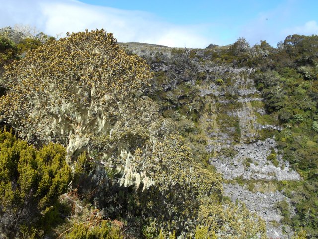 La randonnée débute à la toute fin de la route du Brûlé. Un grand kiosque très bien aménagé attend les pique-niqueurs du dimanche avec un foyer où l'on peut allègrement rôtir un mouton. Le sentier débute sur les racines de cryptomerias et emprunte un tracé bordé de planches pour traverser sous le couvert des conifères (Photo 1). Cent mètres plus haut débute le parc national indiqué par son poteau en bois. Tout près un grand panneau attire l'attention du randonneur sur le domaine du tuit-tuit, un oiseau endémique dont la population est parmi la plus faible au monde. Attention pour les non résidents car le point "Vous êtes ici" situe le départ à 5200 mètres à vol de tuit-tuit du point réel (Photo 2). Le sentier, toujours bien entretenu, montera constamment jusqu'à la Roche Ecrite avec seulement une demi douzaine de faux-plats de moins de 100 m. L'effort est donc à fournir durant les trois premières heures, sans échauffement depuis le parking. Jusqu'au gîte, on rencontre tous les types de végétation allant des branles, sabres et fougères du départ aux forêts de calumets, bois de tamarins et de bois de couleurs plus en hauteur. Le sol est tantôt terreux et glissant par temps humide, tantôt envahi de racines ou de boue sur de courtes distances. Les portions marécageuses se franchissent sur des planchers plus ou moins sophistiqués isolant de la gadoue (Photo 4). Des trouées sur la droite permettent parfois de voir la vallée de quelques Bras Sec ou Grand Bras ou de vastes clairières exploitées par l'ONF pour en débarrasser les bois morts (Photo 3). Plus on monte et plus les tamarins des Hauts sont nombreux (Photo 7). On parvient au gîte en moins de deux heures de marche (Photo 8). L'endroit est calme et reposant et sa position à près de 1900 m d'altitude procure de la fraîcheur. Si tous les autres sentiers de la forêt n'ont pas été repérés en montant, débute alors une exploration de la planèze dominant le gîte. Partir vers la gauche en suivant le petit panneau "Bâtiment Bois de Nèfles, 100 m". On passe près de la station météo, d'une réserve d'eau, d'une zone de posé des hélicoptères de secours avant de tourner à angle droit sur un large sentier herbeux pour une progression facile vers le sud (Photo 9). 500 mètres plus loin, partir sur la droite pour 20 mètres de zone dégagée et emprunter le sentier officiel de la Roche Ecrite. La première partie s'effectue sur un terrain terreux parsemé de petits cailloux (Photo 12) ou sur des planches pour les portions humides (Photo 11). Plus haut, on retrouve les larges plaques de lave où la marche est très facile. Les repères de peinture blanche sont si nombreux qu'il est impossible de s'égarer même avec un fort brouillard. On ne décrit plus les paysages sur les deux cirques quand les nuages ne sont pas trop installés (Photo 13). Une fois lues toutes les inscriptions présentant un intérêt littéraire, c'est à dire 5 secondes plus tard, reprendre le chemin inverse jusqu'au premier croisement. Poursuivre tout droit sur les plaques de lave et à travers les brandes réussissant à pousser jusqu'à la Caverne Soldats. Cette vaste cavité peut abriter plusieurs personnes en cas de forte pluie (Photo 14). Il arrive parfois qu'une petite chute d'eau coule de son toit pour la douche du soir en cas de bivouac ! Cette chute modeste est l'une des nombreuses sources de la Rivière des Pluies dont on aperçoit la vallée en repartant sur le sentier vers le gîte. Il est beaucoup plus étroit que celui de la descente et mérite de l'attention (Photo 15). Plus loin, laisser sur la droite le sentier menant à la Bretagne puis obliquer à gauche sur les larges plaques menant à la Mare aux Cerfs (Photo 16). Repérer dans la boue les traces de sabots des cervidés venant boire paisiblement si on ne leur tire pas dessus. La mare est minuscule au milieu des joncs et ses abords marécageux sont couverts de sphaignes (Photo 17). Un petit sentier part sur la droite vers un point de vue sur Mafate (Photo 18). Cet aller-retour ne prend que 5 minutes. Reprendre ensuite la descente vers la Caverne Dufour sur un sentier en pente assez forte à travers les branles (Photo 19). Profiter de la hauteur pour repérer les Pitons Plats qui dépassent à peine de la Plaine des Chicots. Après la traversée de larges prairies entourées de branles, on s'approche de la Caverne et de sa petite mare situées à la jonction des sentiers (Photo 20). La caverne est aussi vaste que la précédente mais elle est moins accueillante en raison de la hauteur de son plafond. On retrouve les plaques de lave usées par les semelles (Photo 21) jusqu'à un petit marécage à sec traversé par le sentier en planches. Chercher à ce moment le nouveau petit sentier qui file vers le rempart du Bras Détour dont on aperçoit la haute cascade à sec (Photo 22). Moins de 300 m plus loin, dans une clairière coupée en deux par une rigole profonde, essayer de trouver le début du sentier qui reliait celui de Dos d'Ane (Photo 23). Il a beaucoup souffert des cyclones et les arbres abattus empêchent de suivre sereinement son tracé. En revanche, les 100 premiers mètres sont aisés à suivre (Photo 24). Traverser une profonde ravine rocheuse et profiter d'un nouveau point de vue sur le Bras Détour et la Crête d'Aurère (Photo 25). L'endroit est prisé des cerfs comme le prouve les nombreuses fumées laissées au sol. Rebrousser encore chemin et reprendre la direction du gîte. Aux premières habitations, s'il n'est pas encore l'heure de revenir vers Mamode Camp, oser un détour de 500 m en partant sur la gauche vers Dos d'Ane. On frôle la Caverne Basse, modernisée en son temps par un mur mais qui décourage désormais tout candidat à un bivouac (Photo 26). Le sentier est très agréable dans les bois de couleurs et les tamarins au sol (Photo 27). Le sentier menant au point de vue est beaucoup plus étroit et permet d'admirer pour l