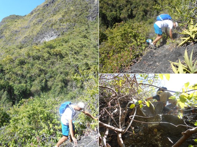 La randonnée débute ici à l'école de Sans Souci, un endroit plus sûr pour le stationnement depuis que les dégradations se multiplient à la citerne rouge (qui tire d'ailleurs lentement vers le rouille). Le début de la canalisation se rejoint par la piste qui commence à la citerne ou par ses raccourcis qu'on emprunte au prochain virage. La montée est raide par ces raccourcis terreux mais évitent de longs lacets de la piste, bien rafraîchie, qui ne comporte plus ces profondes et vilaines ornières (Photo 1). Compter une trentaine de minutes entre la citerne et le début du sentier (Photo 2). Le sentier de la canalisation ne se décrit plus. Il est large, totalement plat et permet de marcher relativement vite (Photo 3). Ne pas manquer cependant les magnifiques paysages sur l'entrée dans le cirque de Mafate (Photo 4). Autant les paysages sont merveilleux, parmi les plus beaux de l'île, autant les abords sont souillés par des dizaines de mouchoirs, jetés négligemment après usage, servant de balises très disgracieuses. Il faut compter plusieurs mois pour la dégradation totale d'un mouchoir papier : pourquoi ne pas le mettre dans la poche pour le jeter plus tard ? Avec les arrêts panoramas et photos, il faut compter une heure pour rejoindre l'Îlet Cambour, bien noté sur la carte IGN. Inutile de préciser où se situe le petit sentier qui rejoint l'îlet abandonné car le papier toilette a remplacé les mouchoirs pour trois nouveaux mois de balisage sauvage !! Une courte visite des lieux permet de remarquer les murettes, les fondations, les arbres fruitiers et les ananas abandonnés dans la jungle qui a recouvert les cultures de l'époque (Photo 5). Après ce repos de quelques minutes qui peuvent également servir de préparation psychologique, on peut se lancer dans la descente qui rejoint la Rivière des Galets aperçue dans le bas. Le sentier, difficile à repérer par manque de passage s'élargira peut être si de nouveaux aventuriers entraînés et motivés veulent bien se lancer pour l'élargir. Si le sentier est difficile à repérer, ce n'est pas le cas du point de départ situé dans un virage à l'endroit où la canalisation surgit de terre en formant un coude (Photo 6). Noter que le départ est manqué si l'on poursuit 25 mètres et que l'on passe sous l'arche végétale formée par un des manguiers de l'îlet Cambour (Photo 7). La plongée peut commencer en débutant dans les fougères et en se poursuivant parmi quelques bois de couleurs et chocas (Photo 8). Pas d'inquiétude pour suivre la trace car elle reste toujours visible même pour les non initiés. Le sentier longe la ligne de crête du rein qui descend vers l'Îlet Flamand. Beaucoup de passages sont rocheux et comportent quelques portions à très forte pente où des branches salutaires ralentissent la plongée (Photo 9). Des rochers forment des promontoires permettant de s'arrêter et de profiter de belles vues sur la vallée de la Rivière des Galets (Photo 10). La pente est forte et la vitesse de marche a bien changé depuis la canalisation. Attention aux petites pierres posées sur les grosses qui peuvent dévaler ou aux amoncellements de pierres qui s'écrasent sous le pied (Photo 13). Par endroits, le sentier est bien marqué et comporte même d'anciennes marches creusées dans le sol, preuve que ce sentier était plus qu'une trace à l'époque (Photo 14). Des pieds de vétiver plantés en bord de sentier attestent également d'un itinéraire fréquenté à l'époque. Ailleurs, les chocas n'ont pas encore recouvert le passage (Photo 15). Les premiers vrais pierriers font leur apparition et demandent un peu plus d'attention pour ne pas faire rouler les roches (Photo 16). Plus bas, la végétation s'intensifie mais sur une courte distance (Photo 17). On arrive, à un moment, à un rocher recouvert des premières lianes papillon qu'on retrouvera de plus en plus. Le passage semble difficile et l'on cherche des yeux le sentier avant de se décider à descendre cette barre rocheuse en s'aidant des longues tiges de la liane (Photo 18). Plus loin, une tuyauterie de plastique noir transporte l'eau d'une source vers l'Îlet Flamand (Photo 19). Les lianes papillon sont de plus en plus touffues et imposent de se baisser et ramper sur les fesses pour suivre la trace. Les tuyaux se poursuivent vers l'aval mais il faut les laisser pour partir sur la droite, grimper une forte pente en direction d'un énorme tamarin et rejoindre une bambouseraie. Ils sont impossibles à manquer tant les touffes sont nombreuses. On voit que les cyclones ont détruit une grande partie des tiges qui grincent avec le vent (Photo 20). Partir vers la droite jusqu'aux bambous rassemblés en clôtures près de grillages qui indiquent les propriétés privées de l'Îlet Flamand. Délaisser les clôtures et repérer sur la gauche, en bordure de ravine, le début d'un tunnel végétal constitué de grosses tiges de liane papillon (Photo 21). Il faut de la souplesse pour les passer sans ramper et l'on rejoint assez rapidement un important pierrier très pentu. Quelques hésitations sont à prévoir pour retrouver le sentier mais en regardant les coups de sabres sur des lianes, chocas ou branches, on se retrouve au fond de la ravine rocheuse. Garder à l'esprit que c'est le meilleur endroit pour retrouver la Rivière des Galets, même si certains passages semblent difficiles (Photo 23). L'arrivée à la rivière s'effectue par un confluent encombré d'une montagne de galets instables où il est préférable de ne pas courir (Photo 24). Le plus difficile de la boucle se termine après 2h30 de descente, pauses comprises. Choisir parmi plusieurs options pour rejoindre la piste, soit en descendant le long de la rivière ou en la remontant vers Deux Bras. Nous avons choisi une traversée plein nord à travers une savane d'épineux avec lesquels il vaut mieux éviter de se frotter. On retrouve le plat sur une piste de 6 km, poussiéreuse et sableus