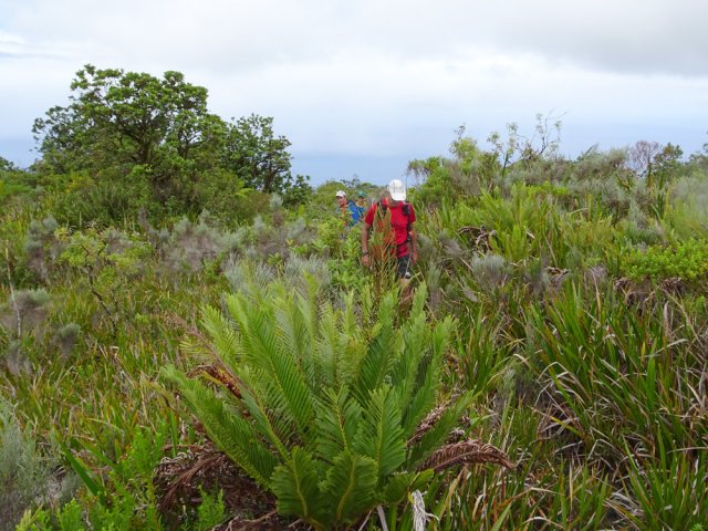 La randonnée débute sur le bord de la route des Radiers (ou Chemin Touzet) à quelques pas de la borne 407. Deux sentiers séparés d'une centaine de mètres se remarquent dans le fossé et il est possible d'emprunter l'un ou l'autre (Photo 1). On est immédiatement frappé par la qualité de ce sentier sans doute maintes fois emprunté à l'époque où la coulée était nue, avant l'implantation de la végétation (Photo 2). La pente est assez faible et surtout régulière ce qui permet de doser son effort (Photo 3). Les laves ne sont presque plus visibles, recouvertes par de petits lichens gris. Ailleurs, ce sont surtout les sabres marrons, les fausses osmondes (Blechnum tabulare (Thunb.) Kuhn) et les orchidées bambou qui ont envahi les parties creuses (Photo 4). Lorsque l'on marche au cœur de la coulée, reconnaissable à l'absence d'arbres, le sentier est constamment présent (Photo 5). Ce sera moins évident dans les portions arborées. L'absence de végétation permet de larges fenêtres sur la côte en direction du Piton de Sainte-Rose (Photo 7) et des fermes éoliennes de Sainte-Rose (Photo 9). Plus on monte et plus les sabres, orchidées et autres fougères (Nephrolepis abrupta) grandissent (Photo 10). La coulée disparaît par endroits, là où elle a surgi trop vite pour créer de larges surfaces, on se retrouve alors dans des zones boisées en jeunes bois de couleurs (Photo 11). Puis on pénètre en sous-bois très humides et boueux où la mousse recouvre tous les troncs pour de belles photos si le soleil est présent (Photo 12). Le sentier est moins instinctif et il faut guetter les passages au sol ou quelques rubalises posées par d'autres marcheurs (Photo 13). La traversée est courte et l'on se retrouve dans la coulée recouverte de fougères de différentes espèces à chercher le sentier plus des mains que des yeux (Photo 14). Il faut se baisser quelquefois sur de courtes distances pour éviter des branches (Photo 16). La montée se poursuit alternant hautes fougères et sabres, jeunes arbres ou landes basaltiques arides où la végétation a du mal à s'implanter (Photo 17). Sur la gauche, le Piton Trois Têtes dépasse mais est difficilement accessible à partir de ce sentier (Photo 18). Après une nouvelles coulée, on pénètre dans un sous-bois humide en suivant une ancienne ravine recouverte de lave et d'une végétation touffue (Photo 21). Sur la carte IGN, on repère d'ailleurs plusieurs traits bleus interrompus par les taches blanches de la lave. On atteint ainsi une importante concentration de pimpins, ce pandanus des Hauts qui passe sa vie à chercher la lumière en créant de très longues branches qui retombent facilement au sol en raison du poids des rameaux (Photo 22). Le sol est humide, la lumière traverse difficilement et les rubalises sont encore utiles pour ne pas s'égarer dans ce sous-bois, seule véritable difficulté de la montée. Les coulées s'enchainent avec un sentier qui chemine toujours à travers les fausses osmondes (Photo 23). Par endroits, elles semblent donner l'impression d'avoir été semées tellement elles sont nombreuses et touffues (Photo 24). A l'approche des 1000 m, les petits tunnels de lave se multiplient. Le sentier passe sur certains et il vaut mieux ne pas frapper du pied car la vieille lave n'a que quelques centimètres d'épaisseur et peut casser sous le poids d'un randonneur (Photo 25). Cette remontée, arrêtée à 1080 m en raison du brouillard, soit à 250 mètres de l'éruption supérieure prend fin à la deuxième faille. Une courte descente au cœur de cette dépression permet de remarquer qu'elle est insignifiante et moins spectaculaire que les hauts cratères éruptifs créés ailleurs lors d'autres coulées. (Photo 28). Le retour, en descente cette fois, emprunte le même itinéraire. Il est facilité par la trace GPS créée lors de la montée qui enlève des hésitations toujours possibles à cause de la végétation gênant le regard en direction du sentier. 600 mètres avant le Chemin Touzet, on peut emprunter comme ici le sentier qui part sur la gauche et arrive 100 mètres en aval du parking de départ.