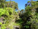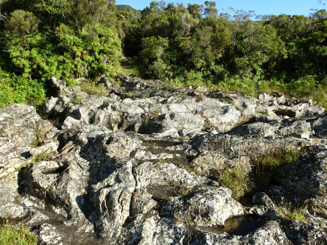 Randonnée familiale : Descendre près du bassin est très facile grâce au sentier qui débute près du belvédère (Photo 5). Le tronçon est court mais peut être glissant après la pluie. Il est bordé de fougères, de bois de couleurs et de goyaviers. Les marches facilitent la descente et on arrive en deux minutes sur la rive de la ravine. Le bassin se rejoint en prenant garde aux hautes marches. Malgré l'eau noire, le lieu est agréable à l’œil en fonction de l'heure et de la position du soleil. Le pont et les roches se reflètent pour des photos originales. Ne pas plonger car on ne voit pas les roches dans l'eau sombre. Revenir au sentier et repérer le chemin bétonné qui a été mis en place pour traverser en toute sérénité (Photo 7). En face, à quelques mètres, on aperçoit déjà le sentier qui remonte sur l'autre rive (Photo 8). La traversée est facile même par mauvais temps en raison des aspérités comblées par le béton (Photo 9). La montée est faible au milieu des mousses, fougères, branles et fanjans (Photo 17). Quelques portions peuvent être glissantes mais la pente est faible (Photo 18). Une touffe de bambous marque la fin de la courte montée. On arrive ainsi à la route et au pont. Traverser l'aire de pique-nique ou emprunter la route jusqu'au stade qu'on aperçoit facilement de l'autre côté (Photo 19). Suivre simplement le sentier de droite ou la piste et marcher en longeant la ravine qu'on devine par moments dans les trouées. L'endroit est calme et le sentier agréable sous les filaos qui procurent de l'ombre (Photo 20). Les cryptomerias côtoient un moment les filaos de chaque côté du sentier qui se transforme en piste (Photo 21). Un grillage longeant une propriété oblige à partir sur la gauche pour rejoindre la rue des Gaménolées (Photo 22). Marcher vers l'antenne en employant une piste herbeuse plutôt que le goudron puis partir à gauche sur une courte portion de route en descente vers les terrains de sport (Photo 23). Trouver à gauche une nouvelle allée bordée de filaos qui mène en direction de la Ravine Sèche (Photo 24). On retrouve le sentier pris récemment pour rejoindre l'aire de pique-nique et le véhicule.