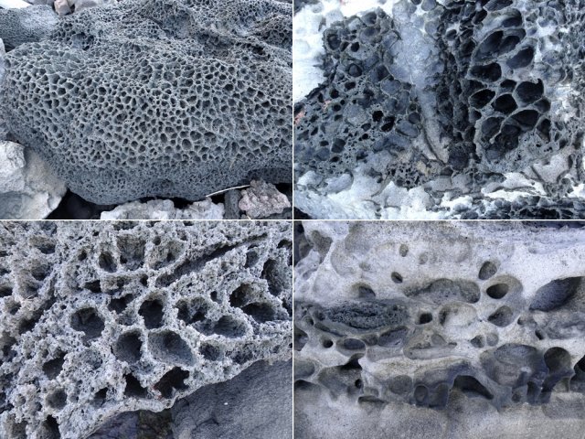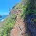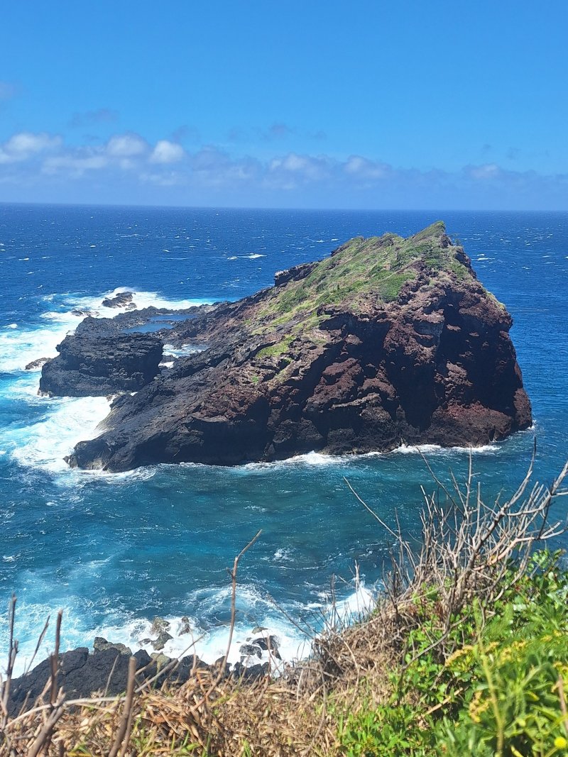 Randonnée sportive et plus aventureuse : Le point de départ se situe dans la descente avant un virage à gauche de la piste. La trouée, souvent à demi-bouchée par les herbes, est tout de même facile à trouver (Photo 4). Le sentier descend dans le bois puis plonge littéralement vers la mer pour une descente de 100 m. Il faut prendre son temps pour éviter branches, racines et pierres en travers (Photo 5). Le sentier se termine au gros filao et aux énormes rochers du littoral. Avant de partir vers les points de vue, il est possible de visiter la Ravine de Petite Île. Descendre les gros rochers en profitant des points de vue sur le Cap à Noël et le Piton de Grande Anse (Photo 6). La remontée de la ravine impose quelques petites escalades entre les énormes blocs (Photo 7). Le premier cassé rencontré se franchit aisément en choisissant les bonnes marches en basalte (Photo 8). Le second, moins haut, semble cependant difficile à passer (Photo 9G). Escalader les rochers en rive droite sous les arbres en prenant garde à la glissade. On parvient très vite à un 3ème cassé, très haut et moussu où du matériel est indispensable pour poursuivre vers l'amont (Photo 9D). Faire demi-tour et revenir au gros filao. Laisser le sentier pris en descente et partir à droite le long de la falaise verticale par endroits (Photo 10). On bénéficie alors des vues sur la façade ouest de l'îlot (Photo 11). Le plus dangereux à cet endroit est de glisser sur les déchets laissés par les pêcheurs ou de se prendre le pied dans les fils nylon coincés entre les roches ! Trouver le sentier qui remonte le long du rempart à partir d'un autre filao (Photo 11). Après une forte montée, on peut repartir à droite pour se rapprocher du bord. Plusieurs sentiers se rejoignent et peuvent prêter à confusion (Photo 13). L'un d'entre eux redescend de nouveau assez fortement en direction de la mer. Il n'y a pas d'arbuste pour se retenir et le cheminement doit s'effectuer prudemment (Photo 14). On se retrouve au point de vue sur la face nord (Photo 15). Avec prudence, il est possible de faire comme les pêcheurs et de se rapprocher du bord si les vagues ne sont pas trop fortes (Photo 16). Si les roches ne sont trop glissantes, chercher les différentes espèces de crabes, les oursins tortue ou les blennies sautant au moment où les vagues arrivent (Photo 17). En revenant et en prenant un autre sentier pour remonter, on est aidé par une longue corde qui facilite l'ascension (Photo 18). Quelques minutes plus tard, on passe au belvédère décrit au §1. Un sentier se remarque dans le bois. Même peu entretenue, on distingue très bien la trace nettoyée régulièrement par les pêcheurs (Photo 19). Seules les feuilles de pandanus peuvent griffer au passage. Repérer le croisement de trois petits sentiers discrets. Partir à droite pour se retrouver à nouveau face à une forte descente étroite souvent en corniche (Photo 20). Comme on s'est éloigné un peu, l'île paraît plus petite et montre sa face est (Photo 21). L'étroit sentier glissant passe près d'un rocher déchiqueté caractéristique doté d'une superbe cheminée gazeuse circulaire (Photo 22). Là également, si la mer est calme, on peut s'approcher du bord à la recherche de bassins et de la faune littorale. On traverse ainsi de magnifiques rochers usés par l'érosion, le vent et les vagues (Photo 23). On remarque une grotte dans la falaise entourée de verdure. Les saliettes (Psiadia retusa) et lavangères (Delosperma napiforme), toutes deux endémiques, semblent en protéger l'entrée (Photo 24). En prenant garde de ne piétiner aucune plante, on peut se rapprocher de la cavité pour un dernier point de vue original (Photo 25). Une trace discrète remonte à partir de la grotte mais il vaut mieux revenir sur ses pas, soit jusqu'au belvédère, soit en partant à droite au croisement aperçu en descente. Dans ce cas, après une nouvelle montée, on finira le long du champ de canne à sucre. Voir le §1 pour le retour au parking.