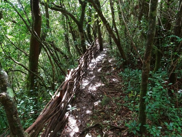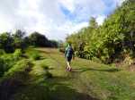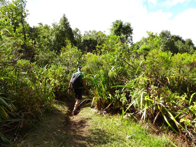 La randonnée débute à l'aire de repos près du parking. Cependant il est conseillé d'effectuer la première montée par la piste bétonnée pour profiter des superbes paysages alentour (Photo 1). La piste constituée de deux bandes de roulement traverse une belle forêt de bois de couleurs et de grosses touffes de bambous balais (Photo 2). Cette mise en jambe de 700 m est un pur plaisir. Sinon, se lancer à partir du panneau qui donne d'intéressantes explications sur l'aire, la flore et la faune de la région (Photo 3). Tout près, une barrière empêche les véhicules d'abîmer la belle pelouse recouvrant la piste (Photo 4). Les seules traces proviennent des équipes d'entretien ou de reboisement dont on aperçoit les dernières plantations en bord de piste (Photo 5). Après une agréable montée en douceur, on parvient à un grand kiosque bordant une vaste clairière recouverte de pelouse (Photo 6). Cet espace est en même temps le départ et la fin de la boucle. Partir tout droit et entamer une montée plus forte qui donne le ton de l'effort pour la jonction avec le point de vue sur Salazie (Photo 7). Des panneaux sont régulièrement plantés sur le bord du sentier pour guider même si on ne peut pas s'égarer (Photo 8). Le sentier, toujours en pente, est surtout bordé de goyaviers qui chassent lentement mais sûrement tous les endémiques ou bois de couleurs de cette belle forêt (Photo 9). La montée est assez régulière mais comporte cependant quelques raidillons plus marqués qui coupent un peu le souffle (Photo 10). On longe parfois des petites ravines insignifiantes. D'autres, qui se rejoignent facilement, comportent bassins et petites chutes le plus souvent à sec (Photo 11). Les portions plates sont assez rares. Elles comportent le plus souvent des racines glissantes ou des parties boueuses (Photo 12). Les goyaviers ne cessent jamais mais les pailles sabres deviennent de plus en plus nombreuses (Photo 13). Des glissades sont possibles lorsque le sentier est taillé dans la terre et que les racines servent de marches (Photo 15). Les bois Noël prennent le dessus par endroits mais ce sont surtout les pandanus des hauts (pimpins) qui couvrent le sol à l'approche du dernier kiosque (Photo 16). S'il fait beau, l'effort est récompensé et l'on peut bénéficier de larges panoramas sur le Cirque de Salazie (Photo 17). Le regard porte jusqu'au Gros Morne et au Piton d'Anchain. On devine très bien la Cascade Blanche et plusieurs villages du cirque. Sur la droite, le regard porte jusqu'au Bé Massoune et au Piton de la Plaine des Fougères. Sur la gauche, ce sont le pic et le Morne des Lianes qui dépassent à l'horizon (Photo 18). Un kiosque attend au plus près du vide pour la pause casse-croûte avant d'entamer la descente par l'autre côté. On marche tout d'abord à plat dans les goyaviers qui ont refait leur apparition (Photo 19). Le sentier est étroit mais suffit amplement pour marcher à l'aise malgré la fréquence des plaques boueuses. Il arrive au bord de la vallée de la Ravine Sèche qui coule 100 mètres plus bas. Puis le sentier se met à descendre. Comme pour la montée, la pente est régulière mais comporte aussi quelques tronçons plus marqués où il faut prêter attention à ne pas glisser entre les racines (Photo 20). Sur la gauche, le vide est omniprésent mais bien protégé par une végétation touffue supprimant tout danger (Photo 21). Les premiers spécimens de bois de rempart font leur apparition. Plusieurs centenaires respectables sont implantés tout au bord du ravin mais tiennent bon. Leurs grosses branches sont parfois recouvertes d'épiphytes (Photo 22). Sur la gauche, de nombreuses petites barrières sont édifiées en fascines de goyaviers (Photo 23). Certaines ont mal vieilli ou sont très anciennes ; d'autres les ont remplacées pour quelques années (Photo 25). Après cette longue descente, le sentier oblique sur la droite et quitte le bord du ravin pour partir vers le sud. On retrouve les ambavilles, fougères et sabres (Photo 26). Il débouche de l'autre côté de l'aire couverte de pelouse qu'on a frôlée avant la montée (Photo 27). Traverser cette pelouse bien tondue et rejoindre le kiosque (Photo 28). Partir vers la gauche et retrouver la piste qui mène au parking du départ.
