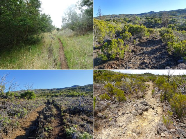Randonnée plus aventureuse : Partir le long du rempart sur un sentier agréable comportant quelques marches hautes sur des blocs. Passer près du sommet invisible du Petit Bénare, bien repéré par un poteau de l'ONF. Admirer les précipices impressionnants tout en évitant de trop s'approcher du bord très fissuré par endroits (Photo 16). Plus haut, on arrive en rive gauche de la Ravine de la Fontaine. Le sentier part à gauche et escalade les rochers de la rive droite. Aussitôt sur le terrain plat, partir à gauche puis prendre le Piton Rouge comme repère s'il n'y a pas de nuages (Photo 17). La traversée n'a rien d'aventureux. Il suffit de marcher en direction du Piton rouge en cherchant toujours le terrain le plus agréable et le moins touffu (Photo 18). On distingue, plus bas, la piste DFCI qu'il est facile de rejoindre en rive droite de la ravine. Partir sur la droite et suivre cette piste défoncée par endroits (Photo 19). On peut s'étonner de la construction de telles pistes aussitôt après les incendies et très peu entretenues jusqu'au prochain !! En général, la piste est propre et facile (Photo 20). Les bouses de vaches qui la fument montrent qu'on peut facilement y rencontrer quelques bêtes. Plus loin, la piste rencontre le sentier de la Glacière. Partir à gauche sur quelques mètres, entamer un nouveau hors sentier, toujours aussi facile, avec le piton en point de mire. Grimper au sommet du Piton Rouge pour profiter du point de vue à 360° et poursuivre plein ouest jusqu'aux sculptures de Gilbert Clain (Photo 21). De là, avant de descendre, repérer au sud la barre rocheuse qui dépasse dans la végétation. Reprendre la descente par l'autre sentier qu'on quitte aussitôt pour un troisième hors sentier un peu plus vertical et glissant que les deux premiers. On se retrouve au plus près de ce nouveau dyke d'une quinzaine de mètres de hauteur (Photo 22). Le monolithe mérite le déplacement avant de partir vers le sentier du Piton Rouge à travers une végétation facile à traverser sans se griffer. Entamer la descente sur le sentier pris en montée, creusé parfois par les multiples passages (Photo 23). Deux cents mètres plus loin, ralentir le pas et repérer un croisement de sentiers. Celui de gauche, très discret, est tout de même facile à suivre des yeux. Plus on descend vers la Ravine de la Fontaine, plus il est marqué par endroits (Photo 24). Ne pas hésiter à le délaisser pour aller au bord du rempart repérer bassins, cassés verticaux, grottes d'effondrement ou amoncellements de rochers (Photo 25). Certains endroits sont accessibles, avec prudence et sans trop de danger, pour une baignade rafraichissante. La descente se poursuit sur ce sentier bien marqué qui peut disparaître par endroits si les bovins l'ont trop piétiné (Photo 26). Plus bas, le terrain s'aplanit et l'on traverse de véritables prairies d'altitude où de nouvelles bouses indiquent que l'herbe y est bonne (Photo 27). Très difficile alors de suivre une trace précise mais l'instinct (ou la trace GPS) a vite fait de désigner le prochain passage. On entend des voix à quelques dizaines de mètres et l'on devine que l'on marche en direction du sentier officiel. Ce parcours rejoint le sentier aux alentours d'une table de pique-nique aperçue en montant. Un sentier partant sur la gauche pousse à une nouvelle aventure, sans danger de s'égarer puisque le trajet est encadré par une ravine à gauche et le sentier du Piton Rouge. Une fois sur le sentier officiel du Piton Rouge, la descente est de tout repos jusqu'à la RF des Tamarins.