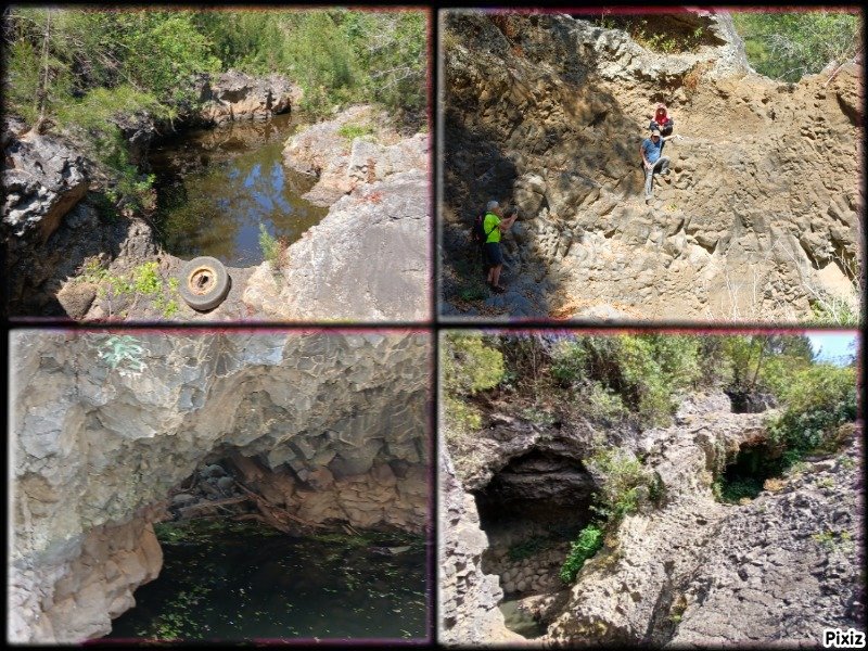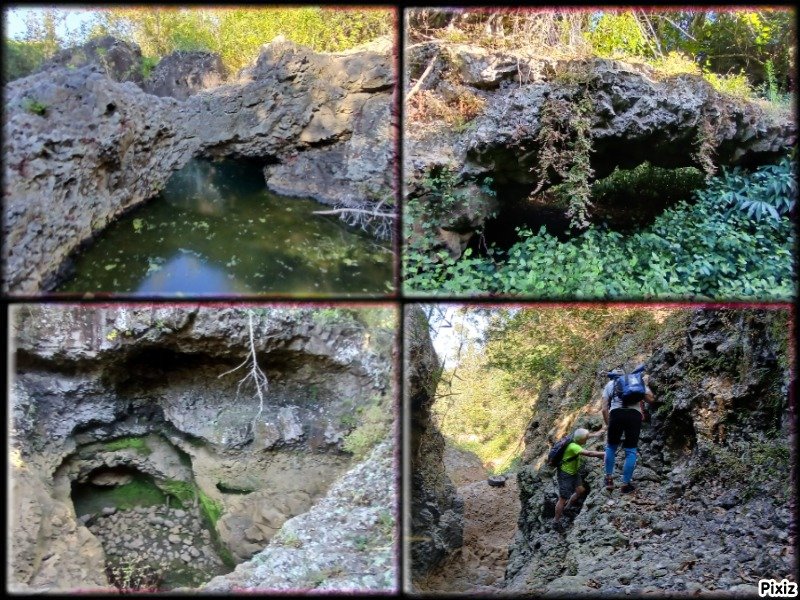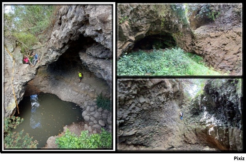 La randonnée débute à la passerelle du Chemin de Pétréas qui permet le franchissement à pied de la rivière en cas de crue. Près du gué, on retrouve le sentier des Petits Tamponnais Ruraux, association disparue en même temps que le sentier, excepté le tronçon décrit ici. Débuter sur cet agréable sentier comportant peu de fortes montées (Photo 1). Une première arche est présente dans le fond de la rivière mais elle est difficilement accessible. Un hors sentier est nécessaire pour s'en approcher entre les arbres et longoses (Photo 2). Petite acrobatie pour s'approcher de l'eau et trouver l'arche au-dessus de son bassin (Photo 3). Remonter un peu la rivière sur les roches de la rive droite puis traverser une belle étendue de renouées du chinois dépassant la hauteur d'un homme par endroits. Ne pas manquer une nouvelle arche sur la gauche (Photo 4). On peut passer dessous pour rejoindre une grande grotte en rive droite. Les bassins se succèdent, imposant quelques courtes escalades sans danger (Photo 5). Cette remontée de rivière amène à un énorme bassin que l'on peut visiter s'il est à sec. Descendre et remonter, également par l'escalade de quelques roches lisses (Photo 6). 5 minutes plus tard, on rencontre un autre endroit, magnifique, très sauvage, destiné aux amateurs de photos de nature (Photo 7). Cet ensemble de bassin-grotte-falaise est un des plus beaux endroits de la boucle. Comme la remontée est rendue impossible sans matériel, faire demi-tour mais délaisser le fond de la ravine pour chercher un passage dans la falaise en rive droite. L'échappatoire se situe derrière un arbre qui aide à l'escalade (Photo 8). Une fois l'étroit passage franchi, remonter en direction du champ de canne à sucre en traversant facilement le bois (Photo 9). Suivre les cannes jusqu'au sentier. Avant de poursuivre vers l'amont, rejoindre le gué et entamer une descente de la rivière en rive gauche pour rejoindre le dernier bassin délaissé il y a quelques minutes. Là aussi, sans danger, descendre vers les bassins dans lesquels il est déconseillé de se baigner (Photo 10). Deux d'entre eux sont séparés par une troisième arche basaltique qui ne se voit pas si le bassin est trop rempli (Photo 11). Remonter au gué puis entamer la suite en empruntant le sentier très fréquenté des marcheurs et coureurs. On y rencontre une racine d'une quinzaine de mètres assez caractéristique (Photo 12). Marcher sous les énormes camphriers bordant le sentier (Photo 13). Le Bassin Samuel se remarque sur la droite mais il n'est pas facile de s'y rendre sans se griffer. Plus loin, repérer le sentier plus discret obliquant sur la droite en direction du Bassin Michel (Photo 14). Le plus souvent à sec, il demande un peu d'attention pour atteindre le fond. Les minuscules marches de basalte facilitent la descente (Photo 15). Lorsque le bassin est plein, c'est une autre affaire que de remonter la rivière (voir ci-dessous la vignette 1 de la photo du § après les pluies). De l'autre côté, l'escalade est identique et facile (Photo 16). Le bassin, un peu envahi de plantes est suivi d'un très long toboggan creusé d'une profonde marmite d'où il serait impossible de sortir sans aide en cas de chute (Photo 17). Plus haut, c'est un gruyère de basalte qui doit être très impressionnant lors de crues importantes. Il se traverse par quelques escalades sans grand danger (Photo 18). Une ferme en rive gauche se repère avec les cris, aboiements, meuglements, cacabements de pintades et odeurs de lisier ! Les pigeons s'envolent par dizaines des anfractuosités où ils viennent pondre. On domine plusieurs bassins plus ou moins importants. Celui situé le plus en amont est alimenté par un petit pisse en l'air après la pluie. On remarque vers l'aval une arche discrète mais qui semble pourtant imposante. Pour s'en approcher au plus près, rejoindre le sentier et marcher vers l'aval jusqu'aux belles racines moussues. Descendre vers le lit puis remonter sur l'îlot basaltique créé par deux bras de la rivière en s'aidant ou non d'une sangle (Photo 19). En remontant l'îlot, on parvient au-dessus de l'arche. Il vaut mieux éviter de monter sur l'arche ou alors le faire prudemment (Photo 20). Cinq mètres d'une corde passée autour d'un arbre peuvent rassurer et éviter la chute dans l'eau sale. Revenir au sentier. En cherchant bien, on devine une arche plus en aval qui se rejoint également avec prudence. De retour sur le sentier, marcher à nouveau vers l'amont jusqu'au prochain embranchement (Photo 21). Partir à droite jusqu'à la rivière. Traverser à nouveau les longues renouées du chinois jusqu'au Bassin Capillaire, reconnaissable à sa grotte tapissée de cette petite fougère de dentelle (Photo 22). N-ième retour au sentier en remontant cette fois la petite falaise basaltique pour rejoindre le gué une centaine de mètres plus haut. Au gué, remonter la rivière à sec jusqu'au confluent du Bras Creux qui finit par une petite cascade souvent à sec. Tout près se trouve un grand bassin profond dont on peut rejoindre le fond sans difficulté. De l'autre côté, attention à l'escalade du bord du bassin si le basalte est humide (Photo 23). Cette fiche termine ici la remontée spectaculaire de la Rivière d'Abord. Trois solutions permettent alors de retrouver la passerelle des Pétréas.