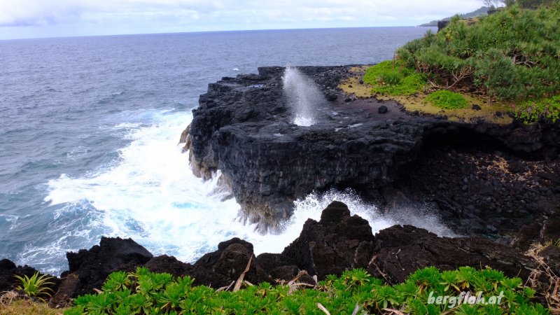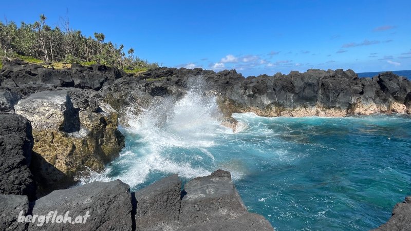 La randonnée débute à Saint-Philippe au plus près de la mer, cachée par des centaines de vacoas. On peut visiter, avant de partir, le monument du Waren Astings ou l'embarcadère bétonné. Commencer l'exploration de la matinée par la recherche de bassins d'eau claire cachés parmi les énormes roches de la Marine (Photo 1). Par beau temps, la baignade peut y être très agréable. Marcher une centaine de mètres sur la route jusqu'à la paisible aire de repos (Photo 2). Rejoindre l'océan au plus près en traversant une petite étendue de vacoas. C'est parti pour de nombreuses heures à fouiner entre les rochers et falaises. Débuter par le platier de le Pointe de la Mare d'Arzule pour s'approcher des vagues, bassins et déchirures dans la roche. Quelques souffleurs se repèrent facilement à la vapeur sortant des trous (Photo 3). Guetter les bruits, parfois très forts, produits par les souffleurs secs. L'air comprimé en sous-sol, parfois à plus de 20 m des vagues, sort violemment en petites explosions procurant d'agréables courants d'air. On entend même rouler les galets dans des cavités qui n'apparaitront qu'après l'effondrement de la voûte sur laquelle on marche. Attention aux vagues qui peuvent être très hautes dans certaines criques étroites. Commencer à longer la côte entre vacoas, manioc marron et la mer. La marche s'effectue sur le gazon bord de mer. Il est préférable, si possible, de suivre les traces laissées par les passages afin d'en préserver un maximum (Photo 4). On remarque ça et là des prélèvements effectués pour sans doute tenter des cultures à la maison. Jusqu'à la Porte, on foulera une dizaine de ces superbes zones verdoyantes (Photo 5). Quand l'herbe disparaît par endroits, la marche se fait entre les filaos ou les pieds de vacoas aux feuilles coupantes (Photo 6). Beaucoup plus rarement, il faudra suivre la trace des yeux à travers les blocs et les maniocs (Photo 7). De grands affaissements du sol imposeront par deux fois d'effectuer un détour vers le sentier officiel pour quelques dizaines de mètres (voir carte). La description de la partie maritime pourrait s'arrêter là puisqu'il suffit de suivre le littoral et de chercher vers la mer. C'est ainsi qu'on découvre quatre arches plus ou moins belles à la Petite Vache (Photo 8). Outre quelques anfractuosités conservant les détritus des pêcheurs, la falaise cache aussi quelques petites grottes ou entrées de tunnels de lave bouchées (Photo 9). La sente discrète se confond un moment avec le sentier du Tremblet mais on retrouve vite les falaises (Photo 10). Une seule arche repérée à la Grande Vache mais de beaux bassins d'eau claire. La descente au plus près de la mer s'effectue sur de gros blocs coupants (Photo 11). La mer, parfois forte, a découpé le basalte et se précipite bruyamment dans les fissures (Photo 12). Poursuivre, toujours bercé par le bruit de ces vagues qui lancent parfois l'écume jusqu'à 15 m de haut (Photo 13). Tout comme la Marine de Saint-Philippe, le Quai d'Henri Dalleau comporte bassins et fissures qu'on peut visiter sur toute la surface du platier (Photo 14). C'est en quittant la visite qu'on rencontre un immense tunnel de lave qui s'effondre petit à petit (Photo 15). Le gazon bord de mer est de plus en plus présent, à peine marqué par le sentier des pêcheurs. De belles flaques conservent l'eau de pluie qui doit s'évaporer rapidement avec le soleil et le vent (Photo 16). Le passage engazonné est parfois étroit entre vacoas et falaise mais le cheminement est rapide (Photo 18). La très haute falaise de l'Enconhière s'effrite vague après vague mais le passage est encore assez large pour marcher sans danger (Photo 19). Plus loin, les caps, pointes et quais disparaissent et la marche peut s'accélérer (Photo 20). Seul le Quai de Gros Poisson est plus significatif. A noter un beau souffleur très actif à la hauteur du lotissement des Sables Blancs (Photo 22). Plus de trois heures après le départ, on aperçoit une pointe rocheuse percée d'un trou laissant penser à une nouvelle arche. Quand on domine ce nouveau platier, on y remarque des trous, fissures et de magnifiques stalagmites de plusieurs mètres, encore intactes de la dernière éruption datant certainement de plusieurs siècles (Photo 24). Le spectacle ne fait que commencer. Du haut de la falaise, on remarque des trouées dans le basalte où la mer s'engouffre avec force éclaboussures (Photo 25). Les lourdes plaques, fissurées, constamment attaquées par l'océan, disparaîtront au fil du temps (Photo 26). On se régale ainsi du spectacle offert par quatre de ces gouffres et arches. Aucun passage naturel ne permet de s'approcher de ces curiosités. Il faut, pour les atteindre, se munir de longues cordes, s'éloignant ainsi du domaine de la randonnée (Photo 27). En aucun cas Randopitons ne pourra être tenu pour responsable d'un accident survenu en tentant de rejoindre le platier fissuré. A partir de la Porte, le sentier du Tremblet s'approche au plus près des falaises et l'exploration peut prendre fin ici. Marcher 100 m vers le nord puis retrouver le sentier officiel qu'on emprunte vers la gauche pour rejoindre Saint-Philippe en moins d'une heure sur un sol humide, pierreux, boueux, glissant d'un sentier ombragé, bordé de goyaviers, fougères et vacoas (Photo 28).