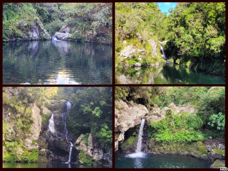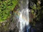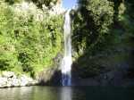 La randonnée débute au pont enjambant la Rivière Sainte-Suzanne. Descendre directement dans le lit de la rivière par le sentier en amont du pont, rive gauche. Il est possible d'emprunter le sentier qui remonte dans le sous-bois puis de gagner les rochers un peu plus loin. Comme toujours dans ce genre d'exercice, marcher au plus facile en cherchant des traces sur les berges, en évitant les rochers ou en les franchissant par des sauts de cabri (Photo 1). Après trente minutes à chercher le meilleur passage, on se retrouve face à une petite falaise laissant imaginer le pire. Pourtant elle se passe assez facilement en utilisant les racines judicieusement placées par la nature (Photo 2). On parvient rapidement à une belle cascade alimentant un bassin d'eau noire (Photo 4). La haute falaise semble infranchissable. Partir en rive droite et débuter la montée par les basaltes de la rive (Photo 5). Remonter une petite ravine servant de captage et poursuivre vers le haut de la chute (Photo 6). Les tuyaux, qu'on rencontrera un peu partout lors de la montée indiquent que l'homme est prêt à tous les efforts pour distribuer ce précieux liquide. En cas de grosse fatigue, penser aux hommes qui ont acheminé ce tuyau sur plusieurs kilomètres et la fatigue diminuera aussitôt ! Après moins de trente minutes de cheminement sur les roches, on parvient à la Petite Chipie, plus haute, qui alimente un vaste bassin (Photo 7). C'est par la rive gauche qu'on quitte ce magnifique endroit. Pas de trace "officielle" visible mais des trouées dans la végétation invitent à grimper entre les roches (Photo 9). La végétation est assez clairsemée mais on rencontre deux barres rocheuses dans ce rempart déjà très pentu. Chercher le meilleur passage sans jamais s'éloigner d'une ligne assez droite vers le nord. On se retrouve sur le sentier le plus fréquenté par les marcheurs et cueilleurs (Photo 10). Ce sentier longe le rempart couvert de goyaviers et de longs sabres (Machaerina iridifolia) qui empêchent de profiter des paysages. On peut cependant voir la Forêt des Lianes dans certaines trouées (Photo 11). La trace est loin d'être un GRR mais même les novices peuvent la suivre sans hésitation (Photo 12). Un peu plus haut, près d'un tronc d'arbre en travers du chemin, un autre sentier de bonne qualité part sur la droite en direction du Piton Charpentier. Cent mètres plus loin, repérer sur la gauche, pour une prochaine fois, le sentier étroit qui descend au pied de la cascade de la Grande Chipie, repérable aux encoches faites au coupe-coupe sur l'écorce des arbres. Poursuivre un peu et entamer une descente assez technique en direction de la rivière. Les marches sont hautes, la pente forte mais les goyaviers aident à freiner la descente. On parvient près d'un petit bassin bordé de larges plaques basaltiques (Photo 13). Repérer l'endroit pour remonter plus tard sans chercher le sentier et entamer la poursuite de la montée. Après les basaltes, le fond est surtout constitué de gros blocs. Après 10 minutes d'acrobaties diverses, on parvient à une nouvelle chute très esthétique dans un cadre idyllique. La chute n'est pas très haute mais le vaste bassin d'eau claire et l'arbre qui la surmonte en font un endroit idéal pour la pause (Photo 14). Reprendre le chemin inverse, passer le point de départ du sentier et poursuivre vers l'aval. On passe près d'un des plus grands bassins de la journée, peu profond mais aux eaux claires (Photo 15). Plus bas, en prenant garde, on peut voir le bassin de la Grande Chipie qu'on a repérée depuis la route tout en profitant de la vue en direction de Sainte-Suzanne (Photo 16). Entreprendre la jonction avec le sentier utilisé en descente en reprenant le cheminement sur les grosses roches (Photo 17). La remontée est rude mais courte jusqu'au sentier qu'on reprend par la gauche. Ce sentier emprunte assez longuement le lit d'un ru à sec (Photo 18). Il s'en éloigne parfois de quelques dizaines de mètres avant de le reprendre et c'est là qu'il faut prêter attention à la direction à suivre. Ne pas manquer ces magnifiques étendues de goyaviers totalement habillés de longues mousses orangées magnifiées par les rayons du soleil (Photo 19). On retrouve, après une descente, une autre petite ravine qui peut abriter une grande flaque après les pluies. Le sentier qui descend vers la rivière est situé quelques mètres plus loin, sur la gauche et ne se repère pas aisément. Une fois repéré, monter un talus puis rejoindre la rivière par une des pentes les plus faciles de la journée. On parvient près de nouveaux bassins dont un grand et profond alimenté par une courte chute. Deux minutes plus tard, une petite cascade se contourne facilement par la rive droite (Photo 20). La jonction avec le prochain bassin ne prend que 15 minutes. Ses eaux profondes se prêtent agréablement à la baignade (Photo 21). C'est en rive gauche, au plus près du bassin, qu'on quitte ce nouveau lieu paradisiaque (Photo 22). Comme il n'y a pas de sentier, prendre garde pour rejoindre le haut de la chute par un passage vertical, assez technique. On parvient à un magnifique figuier aux longues tiges pendantes trempant dans un bassin. Il est facile de rejoindre le haut de la chute sur les basaltes de la rive droite (Photo 23). Plus haut, le prochain bassin, dans un cadre plus sauvage pourrait servir à une nouvelle pause mais il y a plus de 6 heures que l'on remonte la rivière (Photo 24). Débute la plus difficile jonction par la rive droite. Il faut monter assez fortement entre les arbres clairsemés au début puis les fougères et les sabres deviennent plus touffus sur le plateau. Ne pas chercher à s'éloigner de la rivière. Le bruit de l'eau guide et le GPS devient utile pour ne pas s'en éloigner. Une fois sur la rive, on se retrouve près de nombreux bassins profonds et sauvages. Repérer, avant de poursuivre, le début du sentier de remontée se situant en 