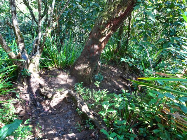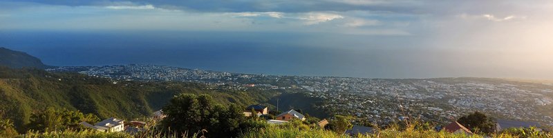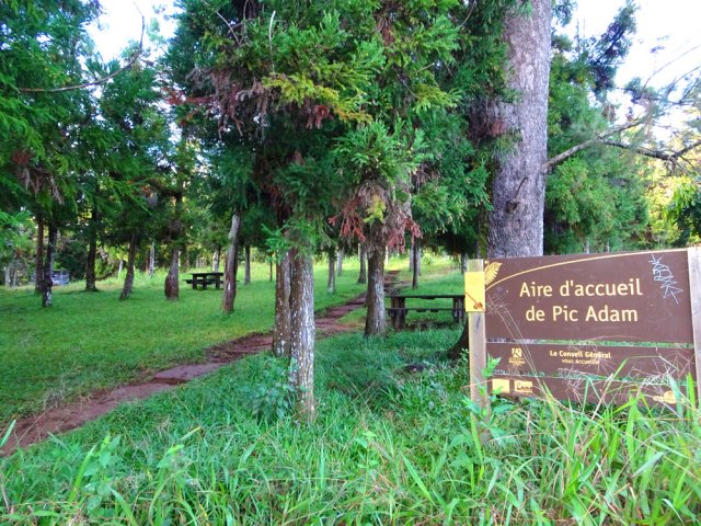 La randonnée débute au parking situé avant la fin de la route du Piton à Bois de Nèfles. Remonter la route jusqu'au début du sentier menant à la Roche Ecrite. Partir à gauche et suivre la route étroite se terminant à des champs (Photo 1). Du champ d'ananas un peu à l'abandon, on a de beaux points de vue sur le chef-lieu et l'océan (Photo 2). Un coup d'œil sur la photo satellite montre que cette région est une grande productrice de ce fruit délicieux cultivé à 700 m d'altitude autour de Bois de Nèfles. Le sentier part sur la droite et entame sa montée vers le Pic Adam entre ananas et cannes fourragères (Photo 3). On traverse le Chemin des Pins avant de grimper un peu sur un sentier en escaliers à travers les jouvences (Photo 4). Il pénètre sous les cryptomerias de l'aire de repos du Pic Adam (Photo 5). L'aire est vaste mais assez peu fréquentée. Poursuivre vers le sud en traversant la zone (Photo 6). Laisser le petit sentier partant sur la droite en direction d'un kiosque isolé pour pique-niqueurs solitaires (Photo 7). Il est surtout utilisé par les cueilleurs de goyaviers. Le sentier traverse ensuite un bois de jamrosats reconnaissables à leurs troncs penchés sur le sentier (Photo 8). Les goyaviers les remplacent rapidement le long du parcours en pente faible et constante (Photo 10). Certaines portions sont un peu plus pentues mais comportent rarement des difficultés (Photo 11). Après 30 minutes de montée, on approche des 1000 m et les paysages s'agrandissent vers Saint-Denis et la vallée de la Ravine des Patates à Durand (Photo 12). Le désert créé par l'incendie d'octobre 2012 n'est plus désormais qu'un mauvais souvenir et les cendres ont été remplacées par des fougères, jouvences et autres invasives (Photo 13). L'absence d'arbres permet de magnifiques paysages mais c'est du point de vue officiel que l'on voit les plus beaux (Photo 14). Il faut quitter le sentier pour s'en approcher par la droite. Un banc sommaire permet même de souffler en admirant l'horizon. En partant de nuit, un matin peu nuageux, il est possible d'y immortaliser de superbes levers de soleil. Rejoindre le sentier principal de deux manières différentes et poursuivre la montée sous les mêmes goyaviers et dans les longoses (Photo 15). Profiter des derniers paysages vers l'est avant de se préparer à chercher le petit sentier de raccourci (Photo 16). Le sommet du Pic Adam se situe à quelques mètres dans les goyaviers mais on ne le voit pas. Un sentier discret y mène mais les points de vue n'égalent pas ceux déjà rencontrés. En revanche, à partir de ce point le terrain devient plus plat et se met même à descendre. Guetter, 200 m après le sommet et avant la première descente importante, le petit sentier discret pénétrant dans les goyaviers envahis de longoses (Photo 17). Beaucoup plus étroit que le parcours principal, il peut inquiéter les marcheurs peu habitués aux sentiers non balisés alors qu'il est plus agréable qu'il n'y paraît. On y retrouve de belles vues sur la forêt depuis des trouées dans les arbres (Photo 18). Les goyaviers sont remplacés par des branles et quelques bois de couleurs (Photo 19). La forêt est plus belle que dans la montée et le sentier reste toujours très visible (Photo 20). On rejoint très rapidement le sentier de la Roche Ecrite pour continuer la boucle en partant sur la droite. Il est plus pentu que de l'autre côté sans jamais être difficile (Photo 21). On retrouve également les marches à l'approche d'un bois de cryptomerias (Photo 22). La pente y est un peu plus forte et les racines peuvent très vite tordre pied ou cheville (Photo 23). Plus bas, on rencontre le sentier débutant à gauche en direction de la Ravine Blanche et de ses cascades. Franchir quelques ornières près du croisement puis poursuivre la descente vers Bois de Nèfles. Le parcours devient de plus en plus plat le long de la courbe de niveau (Photo 24). Le paysage est le même que de l'autre côté parmi les milliers de goyaviers (Photo 25). Les difficultés cessent vite même pour le passage de quelques portions terreuses et glissantes (Photo 27). Deux heures après le départ, si les haltes pour goûter les goyaviers n'ont pas été trop longues, on se retrouve aux poteaux de l'ONF repérés en partant (Photo 28). Le parking est à quelques mètres en redescendant la route bétonnée.