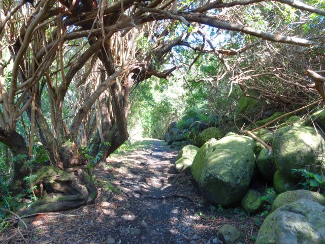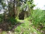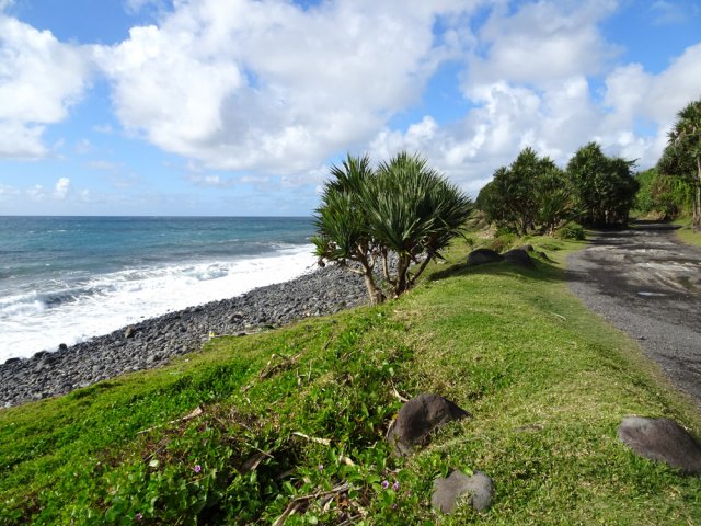 La randonnée débute au croisement du Chemin Agenor, du Chemin Grand Canal et de la Route Coloniale. Ce dernier longe la plage de galets au plus près, sec et poussiéreux une bonne partie de l'année et couvert de grandes flaques boueuses après la pluie (Photo 1). Si c'est le cas, il est très agréable de marcher sur la pelouse toujours bien entretenue ou sous les pandanus qui peuvent créer une ombre agréable (Photo 2). On y retrouve d'ailleurs des traces d'anciens sentiers ou de passages fréquents. Les pandanus (vacoas à La Réunion, Bakouas aux Antilles) croulent parfois sous le poids des fruits qui sont encore consommés dans quelques endroits tropicaux de la planète (Photo 3). La piste s'éloigne doucement de l'océan ; choisir de marcher près du bord ou sur la piste. On pénètre plus loin dans les champs de canne à sucre. Le Chemin Colonial y est aussi large que précédemment (Photo 4). De juillet à décembre, une fois la canne partie à l'usine de Bois Rouge, les panoramas sont plus nombreux, tant sur l'océan que sur la montagne (Photo 5). Après les cannes, ce sont de grandes pelouses abritant des kiosques de pique-nique qui occupent l'espace entre le Chemin Colonial et la mer (Photo 6). Le chemin prend fin, après 300 mètres longeant des habitations, par une fourche de deux pistes. Celle de gauche se poursuit vers Saint-Benoît. Partir sur celle de droite qui débute à angle droit (Photo 7). On se retrouve pour quatre km sur le Sentier des Berges de la Rivière du Mât qui longe le delta entre de hautes cannes fourragères (Photo 8). Très fréquenté des coureurs, marcheurs et vététistes, il est bien marqué sur un sol herbeux entretenu (Photo 9). La pente est très faible puisque c'est celle du delta qui débute à la fin de ce sentier. Les seules côtes ne dépassent pas le mètre de montée sur 20 m de long (Photo 10). Sur la gauche, on rencontre souvent un petit bras bien en eau qui rajoute le bruit de l'eau à cette agréable balade (Photo 11). Les tronçons alternent parties plates et rocheuses, berges herbues et gros pieds de poivriers (Photo 12 et 13). Plusieurs sentiers plus étroits partent sur la gauche vers la rivière qui ne s'éloigne pas encore du sentier (Photo 15). Elle est même si près parfois que des barrières sommaires protègent du plouf possible par glissade (Photo 16). Toute la zone depuis le Chemin Colonial est régulièrement entretenue et plusieurs sentiers ont été créés dans les parties déboisées les plus larges (Photo 17). On parvient à l'endroit le plus parcouru car très proche d'un parking installé à la fin du Chemin Jeanson qui mène à une aire de repos paysagère (Photo 18). De récentes plantations viennent rajouter au charme de l'endroit (Photo 19 et 20). En partant à droite au Chemin Jeanson et en traversant plus loin la D47 pour poursuivre par le Chemin Valentin, on peut raccourcir la boucle de moitié en cas de randonnée familiale. La partie finale du sentier des berges n'est plus entretenue mais les traces de pneus indiquent qu'on peut passer facilement. Les 100 premiers mètres s'effectuent dans les hautes herbes sans chercher le sentier des yeux (Photo 21). Puis le sentier, bien visible, file droit dans les sous-bois, les filaos et les fougères, toujours aussi plat et facile (Photo 22). Un peu avant la fin du sentier, repérer sur la gauche un nouveau sentier partant vers la rivière. Il faut marcher près de 100 mètres pour rejoindre le lit du bras couvert de galets (Photo 23). Les enfants apprécieront cette halte où il est possible de patauger sans danger. Le sentier se termine à un champ de canne (Photo 24). Pour suivre le circuit proposé ici et afin d'éviter des passages en propriétés privées, il est conseillé de sortir pour la première fois le GPS et de suivre la trace au plus près. En étudiant la carte, il est bien sûr possible d'emprunter d'autres rues, routes ou pistes mais non reconnues. Rejoindre le Chemin Canal Moreau en contournant d'abord un champ de canne par la piste. Ce chemin débute par une portion en terre empierrée longeant le chantier d'insertion du jardin potager solidaire de Canal Moreau (Photo 25). Il continue entre cannes et habitations avec circulation très calme. Rejoindre la D47 puis entamer la seule véritable portion de route de la boucle. Ces 500 mètres, les moins agréables, pourraient être dangereux s'il n'y avait pas sur le bord une piste cyclable éloignant de la circulation (Photo 26). Au panneau Patelin, partir à gauche, passer devant les services techniques et ateliers municipaux du Chemin Balance. Rejoindre le Chemin Zaville et le suivre jusqu'au Chemin Valentin. Toutes les rues empruntées pour cette traversée urbaine sont étroites, pas toujours goudronnées et l'on passe souvent dans des champs en friche ou de canne à sucre (Photo 27). Lorsque l'on atteint une ligne haute tension, la boucle est presque terminée. Rejoindre le Chemin Grand Canal et terminer au début de la Route Coloniale.