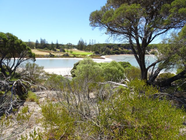 La randonnée débute au port de Thomson Bay où le ferry fait escale. Le sable blanc donne à l'eau une magnifique couleur turquoise (Photo 1). On rencontrera encore de ces belles eaux cristallines en s'approchant des multiples petites plages de l'île. Avant de pénétrer dans les terres, effectuer une visite du village constitué de maisons basses entourées de sable. Une grande partie des habitations sert de villégiature (Photo 2). On rencontre très vite ces adorables marsupiaux se baladant dans les cours (Photo 3). On se demande d'ailleurs de quoi ils peuvent bien se nourrir. Si on poursuit la marche vers le nord, on se régalera à nouveau de beaux panoramas sur l'océan (Photo 4). On peut même repérer Pinky Beach au nord ou Hotel Beach plus au sud pour une baignade bien méritée en fin de randonnée (Photo 5). Revenir au centre du village et entamer la boucle par Digby Drive si on ne va pas vers le golf qu'on aperçoit à l'arrière du premier petit lac qu'on rencontre (Photo 6). Poursuivre sur la petite route qu'on peut quitter à tout moment pour s'en éloigner à la recherche des quokkas (Photo 7). On ne tarde pas à les repérer, souvent à l'ombre en train de sommeiller s'il fait chaud (Photo 8). La route passe entre Herschel Lake et Government Lake. L'eau salée peut prendre des teintes roses en fonction de la lumière ou de la température (Photo 9). Les collines sont très basses mais en montant à la recherche des marsupiaux, on domine la région recouverte de petits arbres (Photo 10). Plus à l'ouest, on domine Serpentine Lake en suivant les pistes dans la colline (Photo 12). Si on rallonge la boucle en filant vers le nord par Defence Road, on trouvera de belles criques isolées entourées de rochers et de ces plantes grasses si particulières de l'île (Photo 13). On tombe à tout moment sur ces adorables peluches qui ne font rien pour se sauver et se laissent photographier sans crainte (Photo 15). A l'approche de la presqu'ile, les vents du large peuvent être plus puissants, levant des vagues n'empêchant pas la baignade (Photo 16). Tout autour, les collines sont recouvertes de cette même végétation où se cachent les quokkas (Photo 17). Ils sont pourtant bien faciles à dénicher (Photo 18). Eviter, tout au long des circuits empruntés de quitter les sentiers, pistes ou routes pour marcher sur ces plantes rases aux couleurs chaudes (Photo 19). Des panneaux régulièrement espacés avertissent de la présence de serpents et il est très fréquent de croiser la route de l'un d'entre eux (Photo 20). L'extrême pointe ouest de l'île vaut à elle seule de se fatiguer dans cette randonnée ensoleillée. Des falaises érodées par les vagues et le vent bordent l'île pour un magnifique spectacle minéral (Photo 21). La présence des reptiles décourage facilement d'aller explorer les falaises comportant quelques petites grottes ou ponts naturels (Photo 22). Reprendre la direction de Watson Bay mais passer par le sud pour effectuer une halte au sommet de la colline abritant le phare en empruntant la Wadjemup Road. Partir ensuite sur la Parker Point Road qui longe la côte sud. La route étant longue, il est possible de couper vers le nord et passer à Oliver Hill Lookout pour profiter des derniers points de vue sur l'île avant de reprendre le bateau (Photo 24). Rejoindre le village avec de nouvelles rencontres de ces adorables bébêtes. En fonction de l'heure, il est à nouveau possible de flâner dans le village ou revenir vers les belles plages qui bordent les habitations.