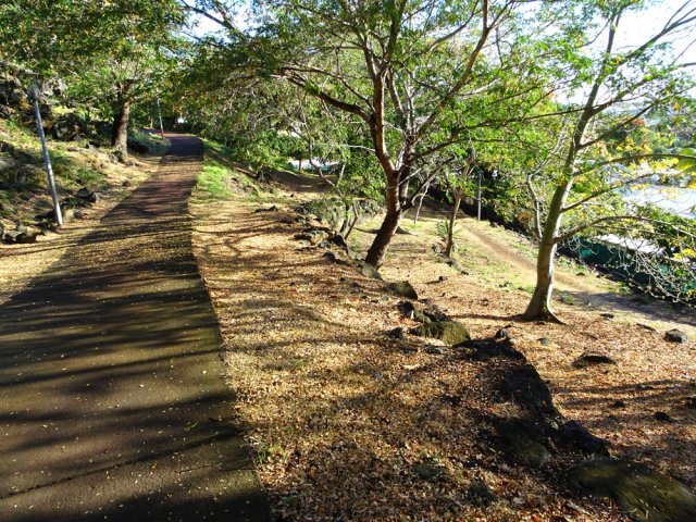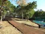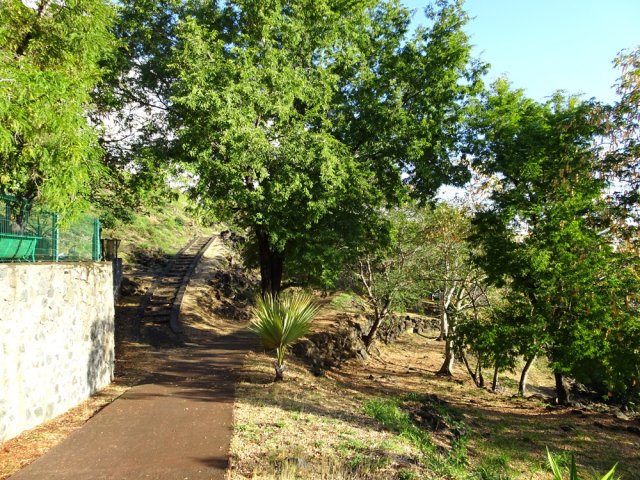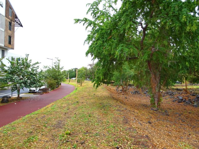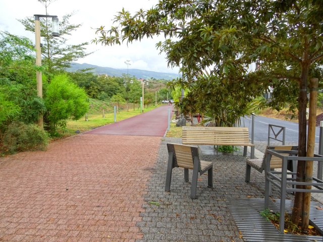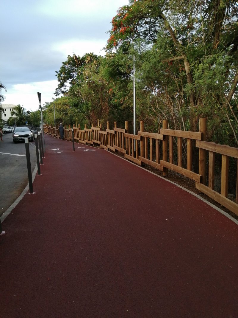 La randonnée débute sur une piste goudronnée rouge longeant au plus près la rue Jean Robert (Photo 1). On se rapproche très vite de la Ravine Balthazar qu'on devine à peine dans un talweg recouvert de pelouse, de roches et d'une grande quantité de feuilles de tamarins d'Inde (Photo 2). On peut quitter le goudron pour arpenter la rive légèrement surélevée. On rencontre une première passerelle à droite. Poursuivre en légère descente sur la piste bordée de plusieurs essences plantées pour créer un parcours paysager (Photo 3). Tout a été prévu pour le promeneur, de la lumière pour le soir jusqu'aux bancs et chaises pour le repos (Photo 4). La piste rouge ne s'éloigne jamais de la rivière à sec. On passe surtout devant des habitations, des petites rues ou des parkings mais l'on rencontre également un grand verger planté de manguiers et quelques cocotiers (Photo 5). Résistera-t-il à cette urbanisation effrénée ? Une partie du parcours est bordée de jolies barrières en bois et de nouvelles plantations (Photo 6). Sur l'autre rive subsiste l'une des dernières modestes cases de La Possession entourée d'une grande basse-cour qui a privé la rive d'un sentier pour le retour. En revanche, les volailles préfèrent largement les rives ou le fond de la ravine pour gratter (Photo 7). Tout près, on rencontre la passerelle qui permettra d'éviter le poulailler au retour de la boucle (Photo 8). On frôle également les installations sportives du Lycée Moulin Joli ainsi que la mosquée de la ville en fin de descente. On arrive, en longeant quelques rues sans circulation, à l'Avenue Salvador Allende. Partir à droite, franchir le pont et entamer une courte montée de 300 m en marchant sur le trottoir. Avant le grand virage, partir quelques mètres sur la Rue Charles Baudelaire et trouver sur la gauche un escalier qui va rapprocher du parcours de Saint-Laurent (Photo 10). Il se finit dans un premier parc arboré bordant des habitations (Photo 11). On arrive très vite à l'entrée du parc. En partant aussitôt vers la gauche on parvient à une aire de jeux pour enfants pour une pause ludique (Photo 12). Traverser l'aire et entamer la descente sur un long escalier en pierre (Photo 13). Plus loin, c'est un petit stade sur la droite qui attire les amateurs de ballon (Photo 14). On entend les véhicules rouler plus haut sur l'avenue. Les gendarmes qui logent à deux pas s'entraînent sans doute sur ce parcours. Le bord du chemin bétonné est constitué d'un énorme pierrier abritant quelques gros tamarins d'Inde. Franchir une petite ravine rocheuse sur un pont métallique (Photo 15). Une halte est possible à l'ombre du kiosque sous les tamarins et acacias (Photo 16). La zone d'entraînement est étroite mais les pistes et sentiers qui la traversent sont assez nombreux pour la parcourir en tous sens (Photo 18). Il est d'ailleurs conseillé de partir par la piste bétonnée, de revenir par le sentier ouest puis terminer par un des sentiers passant par le cœur de la zone. La balade ombragée se termine à la Rue Romain Rolland et le but consiste à retrouver la ravine Balthazar sans trop emprunter de rues pourtant inévitables. Prendre à droite ou à gauche pour contourner les bâtiments d'habitation du quartier de Balthazar (Photo 19). Repérer sur la carte l'escalier bétonné qui file en direction de la ravine et qui se trouve entre deux grands bâtiments (Photo 20). On aimerait bien repartir vers l'amont mais le poulailler a privatisé une longue partie des berges et l'empêche ! Suivre donc ce sentier fait de longues marches jusqu'à la petite rue puis jusqu'à la passerelle qui va permettre de rejoindre la rive gauche (Photo 21). Partir vers la gauche et longer à nouveau les installations sportives du lycée cachées derrière le grillage (Photo 22). Un gué difficile à repérer permet de remonter en amont du poulailler vers le pont de la Rue Simone Pinel mais il vaut mieux poursuivre en terrain connu. Traverser le pont et repérer le sentier de la rive droite (Photo 23). Il chemine, totalement plat, au plus près de la ravine à sec (Photo 24). Il faut, un peu plus loin, descendre sur le béton et les pierres qui dépassent pour franchir un gué et repartir de l'autre côté retrouver le parcours qui s'est transformé en piste (Photo 25). On passe au plus près de l'école primaire Jules Joron entourée d'acacias noirs des Bas (Photo 26). La piste se poursuit en direction de quelques courts de tennis qu'on aperçoit un peu plus loin. Prendre à droite le sentier qui traverse la Ravine Balthazar par un gué sans danger (Photo 27). On voit de plus en plus de marcheurs sur l'autre rive, preuve que la boucle est bientôt bouclée. Délaisser de nouveaux sentiers partant sur la gauche pour emprunter une petite route bétonnée encore épargnée par les habitations. On profite, en se retournant de belles vues sur Mafate et Sainte-Thérèse (Photo 28). On arrive très vite au point de départ puis au lieu de stationnement, fin de cette agréable boucle familiale.