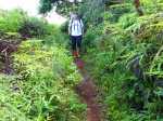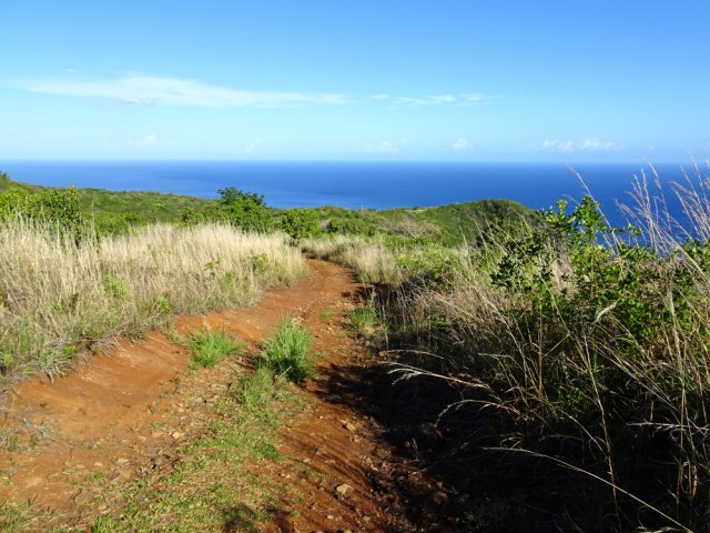 La randonnée débute à deux pas de la gare de la Grande Chaloupe. La première partie, facultative, emprunte la piste en terre longeant la falaise et la longue muraille de gabions empilés sur près de 10 mètres (Photo 1). La route est interdite en cas de fortes pluies ou d'alerte cyclonique. La falaise est impressionnante par endroits et certains blocs ont éventré les gabions, donnant ainsi une idée de la force d'une roche détachée du rempart. On parvient très vite au pont de chemin de fer et au tunnel de la Ravine à Jacques. Un sentier discret commence à droite. En le suivant sur 50 mètres, on s'approche du lazaret qu'on distingue à peine (Photo 2). Plus loin, près d'un "parc bef" où ruminent bœufs Moka et cabris, un sentier descend en rive droite en direction de la mer. De là, on a une vue originale et plongeante sur la Nouvelle Route du Littoral (Photo 3). Les pêcheurs traquent les poissons de roches entre les tétrapodes usés par les vagues. Après cette visite, reprendre le chemin de la Grande Chaloupe puis poursuivre vers le début du Chemin Crémont. Il débute sur la droite près de quelques cases par une assez forte pente qui donne très vite le ton (Photo 4). La végétation de cette colline, surtout constituée de basalte, est pauvre hormis quelques grands tamarins qui bordent le chemin empierré (Photo 5). Les lacets sont courts et la pente forte par endroits. On pense alors aux bœufs ou chevaux qui l'empruntaient au 19ème siècle pour tirer les charrettes. Certaines portions sont défoncées et aucune pierre plate n'est à sa place. Il faut alors lever le pied pour les enjamber ou trouver le meilleur passage (Photo 6). On s'élève rapidement. Les paysages s'élargissent vers la mer et de l'autre côté de la ravine de la Grande Chaloupe (Photo 7). La piste est parfois très étroite en raison des éboulis (Photo 8) ou large et encore très bien pavée (Photo 9). Il faut près de 25 minutes pour atteindre le belvédère donnant sur la Grande Chaloupe (Photo 10). "L'autoroute" est finie et il va falloir poursuivre sur un sentier étroit, non marqué sur la carte, qui longe le rempart de la Ravine de la Grande Chaloupe. Une fois repéré, juste en face du belvédère, le suivre ne pose jamais d'hésitation. Les hautes herbes, les chocas, faux poivriers, avocatiers marrons constituent l'essentiel de la végétation (Photo 11). On parvient en moins de 10 minutes au premier réservoir DFCI entouré de planches. Le sentier s'élargit. On marche sans grands efforts entre les herbes sur une pente faible (Photo 12). Plus on monte et plus le passage est visible, sans doute emprunté plus souvent par les 4x4. Il s'éloigne un peu du rempart qu'on ne perd pas de vue (Photo 13). Plus haut, le sentier fait place à une piste en terre tout en s'approchant d'une seconde réserve d'eau (Photo 14). La végétation, touffue mais assez rase, ne cache aucun panorama en direction de la mer (Photo 15). Dans un lacet, un sentier emprunte le tracé d'une très ancienne piste et se dirige vers le rempart, occupé par des pylônes électriques. Ce n'est pas une grande aventure que de le suivre pour admirer le fond de la vallée (Photo 16). La piste se poursuit en direction de la RD41. Les raccourcis de la carte ne sont pas toujours visibles sur le terrain. Inversement, des pistes n'apparaissent pas sur la carte. Ne pas manquer, à l'altitude 560 m, le sentier qui débute dans un grand lacet de la piste (Photo 17). Il chemine en faible descente entre les fougères, les chocas et quelques rares bois de couleurs (Photo 18). On rencontre, en bordure de sentier, de plus en plus de petites zones occupées par des terres rouges (Photo 19). L'une d 'entre elles, plus importante, impose une halte photo si le soleil éclaire la terre pour en faire ressortir les couleurs chaudes (Photo 20). Tout comme à Fleurié à quelques kilomètres de là, la promenade est agréable tant par la pente faible que par ces traversées de terres (Photo 21). Il est alors préférable de suivre le GPS pour ne pas quitter cet itinéraire naturellement balisé de orange, jaune ou rouge car les croisements sont nombreux (Photo 22). On frôle ainsi les installations d'entraînement de motocross avant de poursuivre vers le nord sur un sentier étroit qui descend rejoindre la Chemin des Anglais à travers les faux poivriers de plus en plus nombreux (Photo 23). Plus bas, le sentier longe et emprunte une petite ravine où il n'est pas rare de rencontrer quelques hautes marches (Photo 24). Après une heure de descente assez facile, le sentier rencontre la piste pavée surchauffée (Photo 25). Partir à droite et longer ces plaques basaltiques avec une pensée pour les esclaves en charge de les casser et de les aligner sous le soleil du nord. Descendre pour franchir la Ravine de la Petite Chaloupe et remonter, parfois fortement, vers le début de la boucle (Photo 26). Cette pente est la dernière difficulté de la randonnée. On repasse devant le belvédère avant d'entamer la descente sur les portions empruntées en montée 4 heures auparavant (Photo 27). La descente est beaucoup plus facile que la montée même lorsque les pierres sont disjointes (Photo 28). La jonction avec le parking est rapide. Ne pas manquer une visite au lazaret ruiné mais rénové abritant expositions et musée ou une balade près du cimetière et son énorme banian aux centaines de racines.