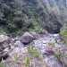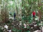 La randonnée débute en face de l'école de Bois de Pomme où un grand parking peut accueillir une douzaine de véhicules. Poursuivre à pied sur le Chemin Jean Albani et bifurquer rapidement au Chemin Paille en Queue. On bénéficie de superbes vues sur le Grand Plate, les plateaux que l'on visitera en milieu de boucle et la vallée de la Rivière des Fleurs Jaunes (Photo 1). La descente sur piste est régulière le long des dernières cases isolées du village parmi quelques cultures. Plus bas, moins utilisée, la piste se transforme en sentier dans les cannes fourragères mais la trace reste facile à suivre (Photo 2). D'un seul coup, tout s'arrête et l'on pense que l'aventure va cesser ici. La piste, qui contournait quelques serres et une zone couverte pour stabulation du bétail est à l'abandon et la végétation a largement pris le dessus. Traverser ce fouillis de 20 mètres qui sera le seul écueil de la boucle. Se méfier des galaberts qui griffent et des arceaux de l'ancienne serre pour atteindre le local. Contourner le petit bâtiment puis poursuivre vers la gauche. On se retrouve immédiatement dans le sous-bois qui domine la très profonde gorge de la Rivière du Mât rugissant dans le fond. Attention au ravin de 50 mètres car la marche s'effectue sur une violente descente couverte de feuilles mortes qui peut impressionner (Photo 3). Après quelques lacets on devine un sentier menant à la passerelle sur la Rivière des Fleurs Jaunes qui a disparu depuis longtemps. Faute de passerelle, poursuivre vers le confluent et remonter pour retrouver l'ancien itinéraire emprunté au siècle dernier par les habitants des îlets oubliés. On parvient rapidement au milieu du Y formé par les deux rivières qui se rejoignent (Photo 4). L'endroit est une merveille de la nature avec ces deux canyons qui s'unissent pour un lit commun près d'une petite ravine terminant en chutes d'eau (Photo 5). A première vue, il semble difficile de rejoindre le cours d'eau mais une corde à nœuds pend sur la gauche. La descente est courte, ludique quoique sportive en raison d'un cassé glissant (Photo 6). Avant de poursuivre, ne pas hésiter à investir les lieux pour une agréable visite en partant vers l'aval (Photo 7). Les berges de la rivière sont assez larges pour les suivre sans danger. On a ainsi une belle vue sur le confluent rocheux (Photo 8) et les deux arrivées de rivières sortant respectivement de leur canyon (Photo 9). On voit bien qu'il faudrait attendre un niveau très bas pour s'engouffrer dans ces goulets étroits de toute beauté. L'addition des trois débits d'eau crée très vite une belle Rivière du Mât à l'important débit (Photo 10). S'il est facile de s'approcher des canyons lorsque le niveau d'eau est bas, il en est tout autrement lorsque le courant est plus violent. Renoncer ou prendre des précautions en cas de glissade en ayant une corde qui sécurise (Photo 11). Malgré la corde la glissade est possible, rapide et sans appel (Photo 12). Il est bon, pour une fois, de ne pas partir trop tôt afin de bénéficier du meilleur ensoleillement. Un gros rocher-grotte permet de se mettre à l'ombre tout en profitant de magnifiques vues sur la partie aval de la rivière (Photo 13). La deuxième partie de la boucle débute à la petite ravine tombant en quelques chutes. Grimper en rive gauche de la Rivière des Fleurs Jaunes et en rive droite de la ravine (Photo 14). La petite cascade un peu plus haut se franchit aisément en suivant les restes du sentier un peu abîmés par le temps (Photo 15). Le sentier, également envahi de végétation s'évite tout simplement en longeant la ravine (Photo 16). Marcher au plus facile, soit sur les berges lorsqu'elles sont dégagées, soit dans le lit (Photo 17). Quelques pisse en l'air égayent le trajet assez facile malgré la mousse et les flaques d'eau (Photo 18). Le sentier, lorsqu'on l'emprunte est assez aisé à deviner dans les longoses (Photo 19). Se préparer à quitter le lit du ruisseau quand arrive une zone pentue, rocheuse, bordée d'une petite falaise glissante (Photo 20). Repérer à gauche le sentier qui file en direction de l'Îlet Fleurs Jaunes qu'on prendra au retour. Partir à droite et retrouver le sentier de l'Île Micot. Il est assez bien marqué, bordé de magnifiques filaos, jamrosats ou camphriers, soutenu parfois de marches anciennes indiquant surtout les lieux de bifurcation vers les autres îlets de l'époque (Photo 21). C'est la partie aventure de la boucle, sans réel danger à condition quand même de prendre garde aux ravins qui bordent le passage. Les trois visites proposées ici s'effectuent à l'envie. En partant plein est, on parvient, après de belles pentes assez raides, des touffes de bambous énormes et de beaux camphriers, à un plateau où se devinent ça et là des vestiges de cultures. Plus haut, en bordure de parc national, on rencontre même une vaste étendue de curcuma délaissée depuis des décennies qui est devenue vivace (Photo 22). Partout, des murets plus ou moins alignés confirment que le lieu était habité et cultivé. A la descente, obliquer à droite à trois marches en pierre et trouver plus haut une case encore debout entourée de bananiers et de quelques fleurs (Photo 23). Il faudrait un sérieux nettoyage de la petite bâtisse en bois sous tôle pour y bivouaquer (Photo 24). Une nouvelle case se trouve au dernier embranchement après avoir suivi longuement un mur d'enceinte. La case est détruite mais l'émotion demeure lorsque l'on voit les pierres taillées, les fleurs ou les objets oubliés (Photo 25). Reprendre une dernière fois le sentier emprunté à l'aller qui finit au ruisseau remonté précédemment (Photo 26). Traverser au gué, trouver la trace encore assez bien marquée qui chemine plein ouest dans les goyaviers et bois de couleurs (Photo 27). Le sentier ondule au grès de la végétation ou du relief et pose parfois questionnement : garder à l'esprit que l'on 