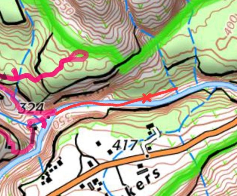 Dans les années 1950, en regardant de plus près la photo aérienne, on remarque qu'il y avait plus de monde vivant sur les plateaux en rive gauche de la Rivière des Fleurs jaunes qu'au village de Bois de Pomme qui ne comptait que trois cases. La passerelle faisait gagner du temps pour rejoindre le petit village de Salazie à partir de l'Îlet Micot. Il est toujours intéressant, avant de se lancer dans une recherche d'îlet oublié, de consulter ces vieilles cartes mises à notre disposition par l'IGN. Le trait rouge représente approximativement la boucle pèlerinage présentée ici.