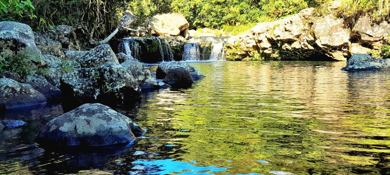La randonnée débute un peu avant le pont sur le Bras Laurent où un petit parking peut accueillir trois véhicules. Juste en face du parking, le sentier, très discret, ne se remarque pas dans le talus envahi de verdure. Il commence à 3 mètres sur la gauche d'un reste de béton recouvert de renouées. Cinq mètres plus haut, la trace devient bien visible et se suit sans hésiter (Photo 1). La pente est régulière. Le sentier ondule au gré de la végétation ou du relief. Les goyaviers et les longoses couvrent une grande partie du sol. Au bout d'un kilomètre de montée, le parcours se rapproche de plus en plus du rempart de la vallée du Bras Laurent que l'on entend couler sur la gauche. Les sabres prennent la place des longoses mais les goyaviers sont encore bien présents (Photo 2). Plus haut, la pente s'assagit. On rencontre plus fréquemment de beaux bois de couleurs où les bois de savon, de violon, perroquet et quinquina pays dominent. La forêt humide favorise l'apparition de nombreuses variétés d'orchidées, de mousses et de divers lichens (Photo 3). On entend couler des chutes dans le bas. Un sentier très discret, à peine marqué par le peu de passages, permet de rejoindre assez rapidement le bras par une pente très forte où les mains s'avèrent indispensables (Photo 4). En arrivant sur la rive, partir vers l'aval en contournant rochers et bassins pour atteindre le haut de la première cascade (Photo 5). Elle se jette dans un bassin une quinzaine de mètres plus bas (Photo 6). Au lieu de remonter par le trajet emprunté pour venir, préférer longer le torrent vers l'amont pour atteindre la suivante (Photo 7). En évitant les rochers et en se mouillant les pieds on parvient à un superbe endroit près d'une haute chute non répertoriée sur les cartes (Photo 8). Le mur qui sépare les deux bassins se grimpe assez aisément. Le sentier qui remonte en rive gauche, aussi discret que le précédent, n'est pas facile à deviner. La montée est tout aussi raide avant de parvenir dans la forêt de goyaviers du plateau (Photo 9). La végétation change encore. Les gros branles verts recouverts de mousse et d'épiphytes se multiplient. Certaines portions demandent de se contorsionner entre les troncs en prenant garde de ne pas abîmer les orchidées omniprésentes (Photo 10). Le sentier oblique vers le sud. Trouver à nouveau un passage pour rejoindre le Bras Laurent. La descente est courte mais aussi raide que les précédentes (Photo 11). En arrivant tout crotté sur la berge, partir vers l'aval et rejoindre la cascade. On se retrouve à nouveau au sommet d'une haute cascade, équipée pour la descente en rappel, qui se précipite dans un grand bassin (Photo 12). On aperçoit en-dessous la vallée que l'on a évitée en passant sur le rempart (Photo 13). On ne retrouvera les goyaviers qu'au retour après la longue remontée vers le tunnel. Partir en marchant au plus près du bras mais le plus souvent dans l'eau (Photo 14). On parvient en quelques minutes à un nouvel endroit sauvage et aquatique entouré de verdure (Photo 15). Un bassin, alimenté par un toboggan et quelques petites chutes, ferme le passage. En nageant, on peut s'approcher de l'affluent du Bras Laurent qui se jette dans le bassin (Photo 16). Dépasser le toboggan et poursuivre la remontée de la rivière. On rencontre un nouvel affluent dans un cadre sauvage. Partir à droite pour rester sur le cours d'eau principal (Photo 17). Les amateurs de natures mortes regretteront d'avoir oublié l'appareil photo pour immortaliser les arbres couverts de mousse dominant la rivière (Photo 18). Toutes les 10 minutes, une chute plus ou moins importante barre le passage. Les trois principales se contournent par un sentier assez facile à trouver en rive droite ou gauche selon la chute (Photo 19). Quelques minutes après avoir contourné la grande cascade, on devine un grand trou noir derrière un nouveau bassin (Photo 20). On arrive ici à un tunnel dont les traces de lave malmenées par les crues indiquent une origine volcanique (Photo 21). Le plafond est très haut et, déjà depuis l'entrée, on aperçoit au loin la sortie. La lampe est cependant nécessaire pour marcher sans danger et éviter de chuter dans un bassin (Photo 22). Après 100 mètres dans le noir, on s'approche de la sortie (Photo 23). Des sources d'eau claire filtrent à travers les roches. L'entrée est tapissée de fougères (Photo 24). Le Bras Laurent, sans ses multiples affluents et les sources, est devenu un modeste ruisseau que l'on peut remonter plus facilement que tout ce qui vient d'être entrepris. La poursuite s'effectue donc à l'envie ou en fonction de l'heure. Revenir vers l'aval en franchissant à nouveau le tunnel, les trois cascades, les zones moussues et les affluents. Au bassin de la photo 16, 25 m en aval de ce bassin, chercher en rive droite le début du sentier qui monte dans la même végétation que celle de l'autre côté. On retrouve les énormes branles centenaires méconnaissables en raison de l'épaisseur de mousse (Photo 25). Mais ce sont surtout les goyaviers et quelques gros spécimens de bois de couleurs que l'on rencontre tout au long de la traversée (Photo 26). On parvient à une très forte descente offrant des points de vue sur la vallée du Bras d'Amal et de ses affluents. Comme de l'autre côté, on devine les cascades au bruit que l'on entend. Pour les rejoindre, les sentiers se remarquent souvent au dernier moment. Les emprunter signifie de nouvelles fortes descentes et remontées sportives, mais le spectacle est au rendez-vous (Photo 27). Suivre le sentier principal qui bifurque parfois sans avertissement, noyé dans les goyaviers (Photo 28). Attention, plusieurs pseudo-croisements peuvent poser questionnement ; prendre toujours le mieux marqué au sol sous peine de finir en pleine jungle 30 m plus loin. C'est avec le plein de magnifiques découvertes que l'on atteint la route près du calvaire. Après 200 m d