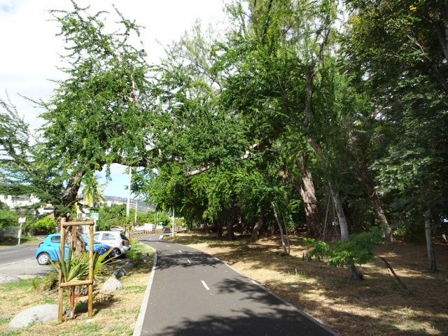 La sortie a été reconnue à partir du grand parking proche de l'étang mais il est tout à fait envisageable de rouler à partir du parking proche du CRESP (Photo 21). Débuter tout simplement par la Rue de la Croix en rejoignant la piste cyclable très facile à repérer (Photo 1). On parvient très vite au rond-point marquant le début de l'Avenue du Front de Mer. Son centre est occupé par un bois noir des bas, très impressionnant en période de floraison. Il dépasse à peine les 20 m de hauteur mais il est plus large que haut et possède un tronc énorme (Photo 2). Il apparaîtra un jour dans la liste des arbres remarquables de l'Île. Le circuit longe l'école Louise Siarane dont la clôture affiche quelques beaux paysages de La Réunion (Photo 4). La piste est totalement rectiligne, excepté quelques virages pour contourner des parkings aménagés le long de l'avenue (Photo 5). Elle frôle plus loin une aire dédiée aux sportifs désirant compléter le parcours par des exercices plus violents (Photo 8). On peut d'ailleurs les voir trottiner par moments dans le sous-bois qui longe la piste (Photo 9). Quelques portions ombragées sous les tamarins d'Inde favorisent des arrêts pour souffler (Photo 12). La parcours n'est guère fleuri à l’exception de quelques jardins de l'autre côté de l'avenue (Photo 13). A la fin officielle du circuit sportif, la piste cyclable se prolonge vers la médiathèque. Franchir un pont enjambant une petite ravine (Photo 17). On ne tarde pas à s'approcher de la médiathèque facilement accessible en prenant garde à la circulation (Photo 18). On s'approche de plus en plus de la ville de Saint-Paul et les immeubles se multiplient en bordure d'avenue (Photo 19). La Rue Julius et Ary Lebond, de l'autre côté, marque la fin proche de la sortie. Après une belle case de style créole, se préparer à faire demi-tour (Photo 20). Le retour, tout aussi facile, s'effectue par le même itinéraire.