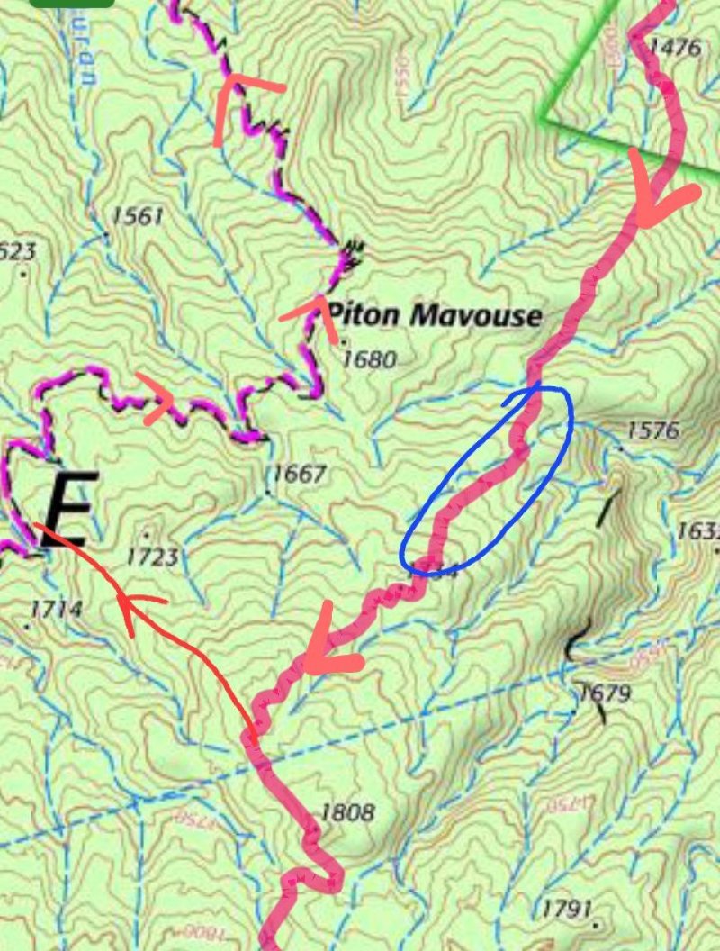 La Roche Ecrite est une destination très bien desservie par de multiples sentiers venant de nombreuses directions. Quelques décennies en arrière, l'un d'entre eux débutait à la boucle du Pic Adam puis rejoignait le gîte de la Plaine des Chicots en contournant le Piton Mavouse par l'est. Abandonné, rendu à la végétation, il demeure cependant des traces encore bien visibles pour les yeux des habitués de ce genre d'expédition. Sportivement, l'ascension n'est guère plus difficile que certaines autres malgré les 1100 mètres de dénivelé entre Bois de Nèfles et le gîte. Techniquement, c'est une toute autre affaire. Ne quitter le sentier du Pic Adam qu'en étant certain d'être sur la bonne trace. Ne jamais quitter des yeux l'ancien passage qui peut être large et pourvu de marches ou étroit et dévoré par les longoses. Le parcours se divise en trois tronçons : la première partie est encore correcte et pose peu de questionnement, la dernière est balisée par les organismes chargés d'éradiquer les rats de la forêt. La partie centrale, entre 1500 et 1800 m, demande un entraînement certain et une maîtrise de l'orientation. Le GPS est ici fortement recommandé pour éviter de se retrouver au sommet du Piton Mavouse ou près des cascades amont de la Ravine du Chaudron. La moyenne horaire est similaire aux autres aventures proposées sur ce site, c'est à dire environ 1km/h. On trouve fréquemment des traces de passage du cerf de Java dès que l'on rencontre les premiers tamarins des Hauts. S'il est possible d'entendre des tuit-tuit communiquer, il est en revanche plus difficile de les apercevoir tout comme les rats qui savent se cacher au moindre frémissement du sol sous la chaussure du randonneur. Bien évidemment, on ne partira jamais seul sur un tel itinéraire qui multiplie à chaque pas les occasions de s'égarer, de glisser sur les roches humides ou de chuter d'un sentier étroit difficile à distinguer. Partir très tôt en cas de retour dans la même journée au point de départ de Bois de Nèfles et prévoir 10 heures minimum.