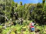 La randonnée débute aux citernes, à la fin de la Route du Piton. La montée est raide sur le béton jusqu'aux champs d'ananas qui semblent de plus en plus abandonnés. Partir à gauche, traverser l'aire de repos puis remonter par le sentier du Pic Adam qui est toujours bien entretenu entre goyaviers, filaos et déjà les premières touffes de longoses (Photo 1). La montée est sérieuse sans jamais être difficile. Quelques haltes sont possibles avant d'arriver au point de vue pour profiter des panoramas sur Saint-Denis (Photo 2). Poursuivre après le point de vue officiel et traverser de nouvelles zones envahies de goyaviers et de plus en plus de branles verts (Photo 3). Passer les deux échelles puis parvenir, une bonne heure après le départ, au grand virage à droite vers la Ravine Blanche pour poursuivre sur la boucle du Pic Adam. Marcher 100 m et repérer le discret sentier s'enfonçant à gauche dans les longoses et bois de couleurs (Photo 4). La pente est faible et la trace encore visible malgré la végétation. Les longoses ont envahi le sous-bois et il vaut mieux s'y habituer jusqu'à l'altitude de 1500 m. Quelques goyaviers cherchent encore leur place au milieu de cette jungle moussue (Photo 5). Plus loin, l'inquiétude peut naître avec l'arrivée de hautes fougères piétinées par les passages de quelques marcheurs connaissant le coin. Heureusement, cette traversée ne fait qu'une cinquantaine de mètres ne retardant pas la progression (Photo 6). Puis ce sont quelques cryptomerias qui occupent le terrain avant de rencontrer une petite ravine étroite au fond couvert de galets glissants. Il faut obligatoirement la remonter ou l'éviter de quelques mètres sans glisser ni mouiller les chaussures (Photo 7). Bifurquer à gauche au premier confluent et continuer dans les longoses. Une courte zone couverte de vigne marronne impose de sortir sécateur ou coupe-coupe pour arrondir le tunnel végétal. Les portions de sentiers se succèdent dans les longoses ou de grandes surfaces de bois de négresse (Photo 8). Heureusement, d'autres parties sont encore très bien marquées et font gagner du temps pour la progression (Photo 9). Les pailles sabres prennent le relais par endroits en cachant à nouveau une partie du sentier où l'on repère encore des marches bien taillées dans la terre ou soutenues de rondins. Parmi toutes les ravines rencontrées, peu ont de l'eau. L'une d'entre elle remplit un bassin par une chute discrète (Photo 10). Les pimpins des hauts deviennent de plus en plus présents le long du sentier ainsi que de grands fanjans qui apprécient l'humidité des lieux (Photo 11). Une descente un peu acrobatique de deux ou trois mètres est nécessaire pour rejoindre le fond d'une profonde ravine longée par le sentier en rive gauche (Photo 12). Très vite il faut à nouveau emprunter le fond comportant des blocs beaucoup plus gros et glissants que la première. Puis ce sont les branles verts qui dominent. Le sentier à travers ces arbres moussus et biscornus est encore assez visible (Photo 13). La montée est régulière malgré les nombreuses descentes et remontées de rives de ravines. Les passages dangereux sont très rares ou bien protégés par la végétation (Photo 14). Le sentier traverse une zone ombragée sous les premiers tamarins, fréquentée par les cervidés qui semblent y venir régulièrement comme le montrent les fumées au sol (Photo 15). On pénètre dans une petite clairière herbeuse, sous les premières grosses colonies de calumets. Repérer sur les branles les belles orchidées et essayons de ne pas piétiner les quelques orchidées palmiers rencontrées le long du sentier de plus en plus difficile à suivre (Photo 16). On atteint le point 1734 mais il reste encore beaucoup de chemin à parcourir. Les panoramas sont rares et surtout orientés sur l'immense Forêt Départementale Domaniale de la Roche Ecrite (Photo 17). Le sentier est devenu très difficile à suivre surtout dans les calumets (Photo 18). Quelques traces de peinture orange sur les troncs rassurent par moments. Seul le GPS peut rassurer vraiment ou réorienter pour ramener sur des tronçons de sentier que l'on reconnait sur de courtes portions. Ne pas manquer de superbes tamarins caractéristiques qui permettent de souffler durant les prises de vues (Photo 19). Certains sont énormes et servent même d'abris aux braconniers qui laissent dessous les restes de leurs passages (Photo 20). Difficile de se guider à travers les fougères et les calumets (Photo 21). Les petites clairières sont ensuite remplacées par de grandes prairies où les cerfs doivent s'en donner à cœur joie une fois le soir venu (Photo 22). De grandes caisses métalliques contiennent le poison distribué généreusement aux rats qui évoluent ici par milliers et créent d'énormes dégâts dans les nichées en général et celles des tuit-tuit en particulier. Les clairières sont bordées d'immenses pieds de fleurs jaunes ou d'ambavilles qui atteignent ici des tailles record. On a déjà repéré des rubalises depuis les derniers calumets et elles ne manqueront plus jusqu'à la fin de la randonnée. Traverser de nouvelles clairières, marcher entre les tamarins et branles en suivant les traces rouges des rubalises (Photo 23). La végétation change encore. Les tamarins sont toujours aussi impressionnants, debout ou couchés (Photo 24). On circule le plus souvent de clairière en clairière bordées de haute végétation des hauts (Photo 25). Une forte descente permet de traverser la Ravine Camp Ménard. Sur l'autre rive, quelques carcasses de tamarins terrassés par les incendies viennent rappeler la fragilité de la nature (Photo 27). Les aboiements des chiens du gîte se font entendre. Il ne faut que quelques minutes pour rejoindre le sentier de l'héliport et les premiers bâtiments du gîte de la Plaine des Chicots.