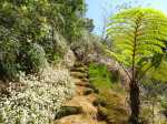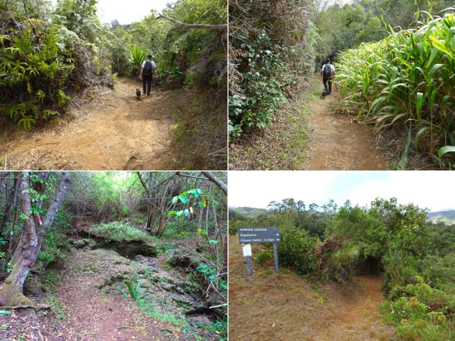 La randonnée débute à l'Impasse des Prunes, la première rue rencontrée après avoir franchi la Ravine Jean Lauret. La ruelle descend en longeant quelques cases et finit dans un virage bordé de bambous. Le sentier prolonge la rue et rejoint assez rapidement le Sentier Le Doyen à travers les bois de couleurs. Il est large, très bien entretenu et fréquenté des coureurs qui ont trouvé là le moyen d'effectuer une courte boucle (Photo 1). La jonction s'effectue par une forte descente. Partir sur la gauche et poursuivre la descente jusqu'au Bras d'Antoine, à sec, qu'on franchit aisément. L'interminable montée vers le Dimitile commence à cette ravine par des lacets en se rapprochant du rempart. Le sentier est de bonne qualité. Il est bordé de fougères, de branles, de jouvences et de quelques bois de couleurs. Certaines pentes constituées de marches sont parfois très raides en bordure de ce rempart qui permet déjà d'apercevoir la vallée du Bras de La Plaine. A gauche on devine souvent le Dimitile et ses dents de scie caractéristiques. On parvient à de nombreux points de vue sur le Bras de La Plaine et sur les villages de l'autre côté (Photo 2). La vallée est profonde mais on distingue bien la rivière coulant dans le bas et le pont de l'Entre-Deux en aval (Photo 3). Repérer au passage le sentier partant sur la gauche qu'on empruntera pour les derniers hectomètres dans 8 heures. Profiter des nouvelles vues sur la campagne environnante et sur l'océan avant d'entamer la descente vers la Ravine de l'Argamasse (Photo 4). Délaisser les deux sentiers rencontrés dans la descente se dirigeant vers Bellevue et traverser la Ravine de l'Argamasse au fond très rocheux. Une nouvelle montée en lacets suivie d'une marche en ligne de crête permet de se rapprocher des maisons isolées de l'Argamasse après avoir emprunté quelques tronçons de pistes poussiéreuses. Des centaines d'acacias noirs, tombés lors du dernier cyclone, bordent le passage. On devine en face le Chemin du Dimitile très utilisé par les marcheurs se rendant au sentier de la Chapelle (Photo 5). Impossible de manquer le croisement des sentiers des Trophées Mondiaux et de la Clape qu'on délaissent pour rester sur la piste. 300 m plus loin, ne pas manquer le départ d'un nouveau sentier plus discret que les précédents (Photo 6). Il est plus étroit mais en comporte toutes les caractéristiques : il est le plus souvent en ligne de crête, bordé de jouvences ou de fougères mais également de centaines de carcasses enchevêtrées d'acacias noirs (Photo 7). La pente y est moins forte sans qu'il soit jamais plat (Photo 8). Plus loin, on parvient à une pierre gravée proche d'une piste que l'on traverse. Le sentier est parfois profondément creusé dans la terre, parfois en bordure de rempart (Photo 9). Il traverse aussi une trentaine de mètres envahis par la vigne marronne qui pourrait le boucher faute de passage (Photo 10). A 1350 m d'altitude, une nouvelle pierre gravée indique le Sentier de La Chapelle qui longe un moment la piste Jean Dubard. La pente s'intensifie sur un parcours agréable, bordé de jouvences et d'acacias (Photo 11), tellement fréquenté qu'il dépasse souvent le mètre de largeur (Photo 12). Il coupe également la piste ou la frôle par endroits près d'habitations fleuries très rarement habitées. Il est souvent creusé dans le sol ou pourvu de nombreuses marches. La pente est parfois assez forte à partir de 1600 m (Photo 13). La montée prend fin sous de beaux tamarins des hauts. On remarque une stèle fleurie entourée de grilles à la mémoire des habitants morts lors du cyclone de 1948, le plus meurtrier du siècle précédent. Plus haut c'est la chapelle qu'on rencontre sur la droite. Au premier croisement de pistes, délaisser celle de droite en direction du Piton des Neiges et s'orienter à gauche vers le Camp Marron (Photo 14). La piste en terre, bordée de haies de spirées, sillonne sur le plateau en effectuant de longs méandres (Photo 15). Prendre à gauche le sentier débutant sous les branles nommé Traces du Guetteur (Photo 16). Ce très agréable parcours sinueux et ombragé mène en quelques minutes aux abords d'un camp entouré d'une clôture en bois. Se diriger vers l'entrée muni de sa pièce de 2€ et entamer la visite par les panneaux sous l'abri avant de vaquer de sculpture en cabane pour visiter l'écomusée (Photo 17). Le Camp du Capitaine Dimitile comporte quelques cases en bois et reconstitutions d'ajoupas recouverts de feuilles de palmiers (Photo 18). Après cette visite qui peut prendre 30 minutes sans se presser, partir en direction du sommet du Dimitile en effectuant une visite aux tamarins bordant le camp (Photo 19). Certains ont atteint un âge respectable et ont bien mieux tenu le choc des cyclones que les centaines de nouveaux cadavres d'acacias noirs. La pente est raide pour mener au belvédère et sa table d'orientation mais la vue sur Cilaos vaut absolument de s'en approcher (Photo 20). Repartir par le même sentier et bifurquer à gauche sur le sentier de Bord pour marcher en direction du gîte de la Caverne Dufour. Les acacias couchés bouchent totalement la vue sur le cirque mais le parcours est très agréable (Photo 21). Tamarins et fougères procurent plus d'ombre que lors de la montée (Photo 22). Le sentier oblique sur la droite, passe devant des installations puis se termine à la piste empruntée une heure avant. Reprendre le chemin inverse en repassant devant la chapelle puis en descendant jusqu'à la pierre gravée. Poursuivre alors sur le Sentier de la Chapelle qui descend vers la Route du Dimitile entre jouvences et arums dans les bois de couleurs (Photo 23). La descente dans les sous-bois verdoyants peut comporter des passages assez pentus (Photo 24) mais on parvient assez rapidement à la piste Jean Dubard. Ne pas prendre à droite au gué vers le parking mais obliquer à gauche sur la piste. Après un long lacet, bifurquer